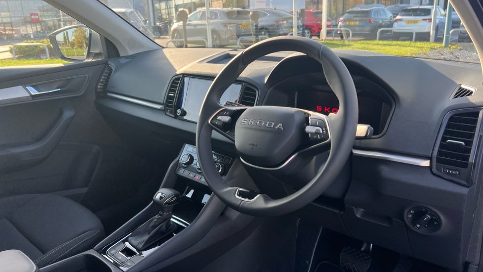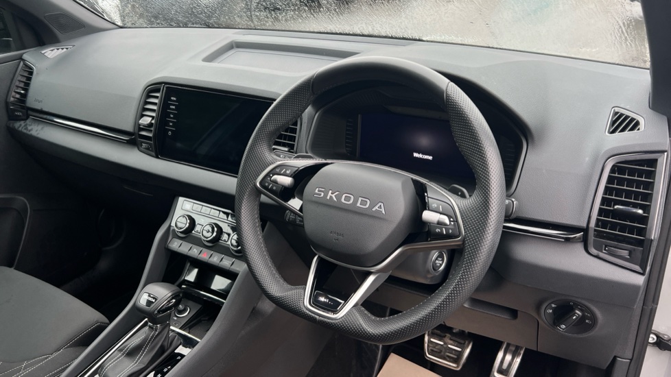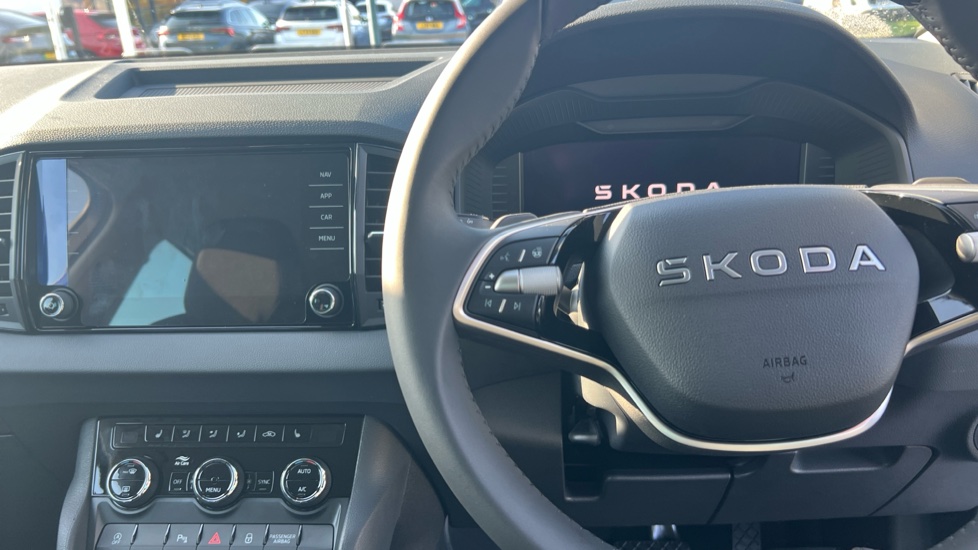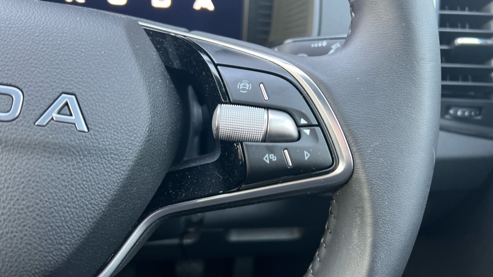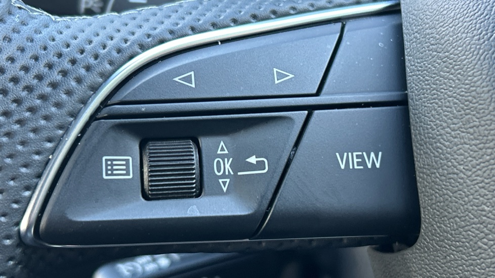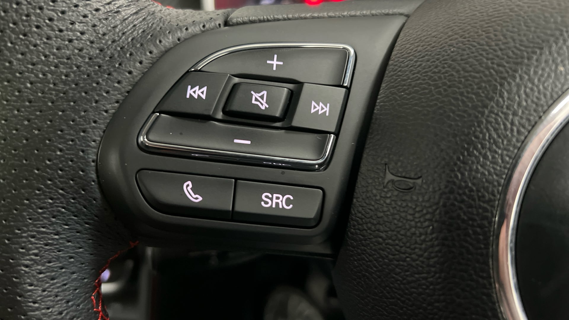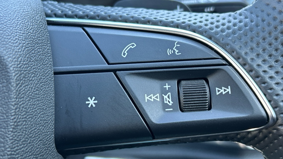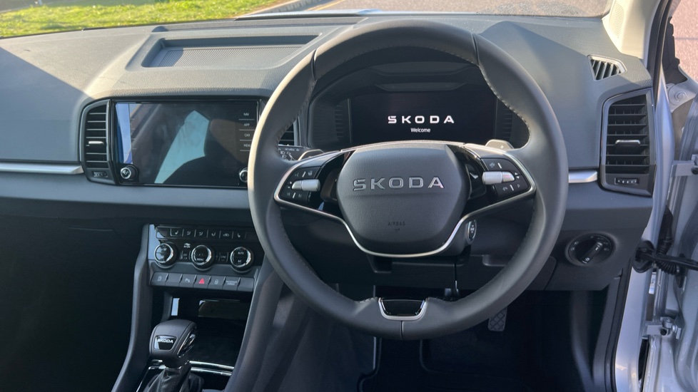 "3 spoke flat bottom leather steering wheel with satin chrome effect bezel",