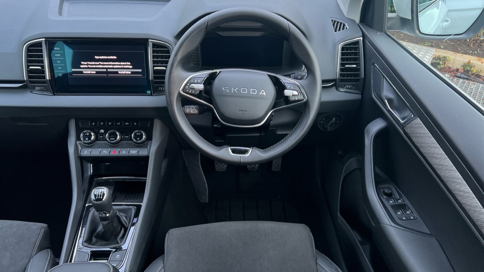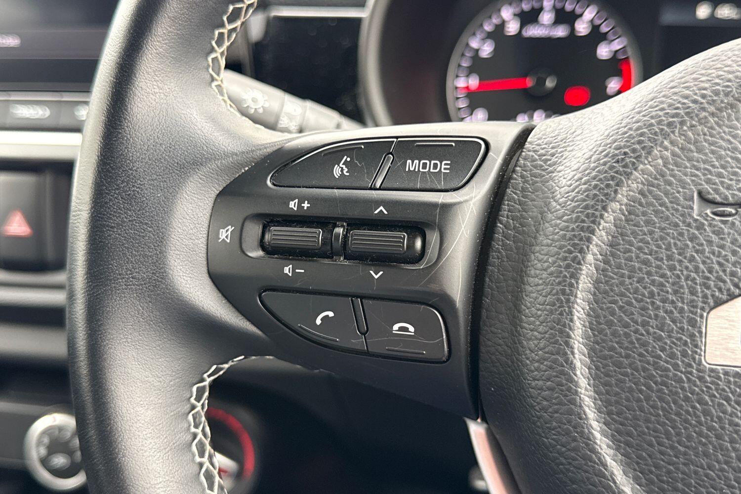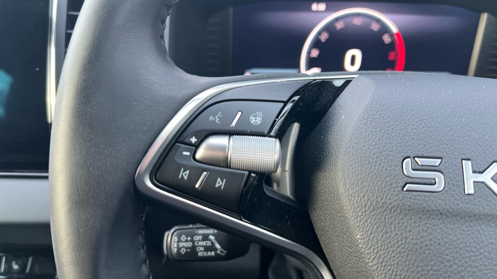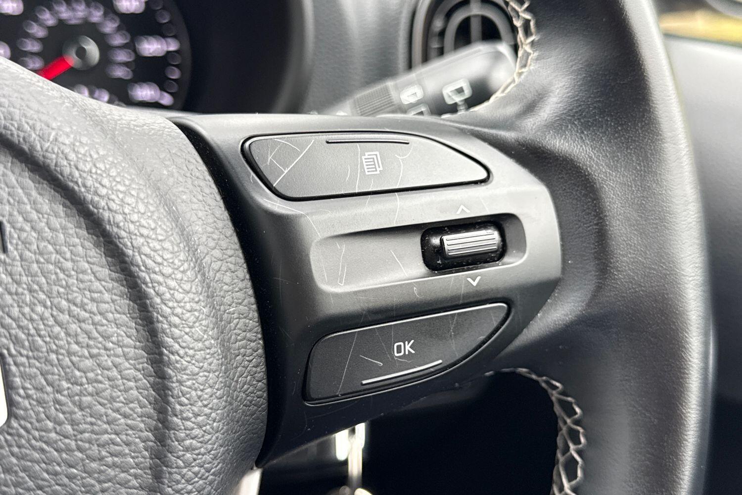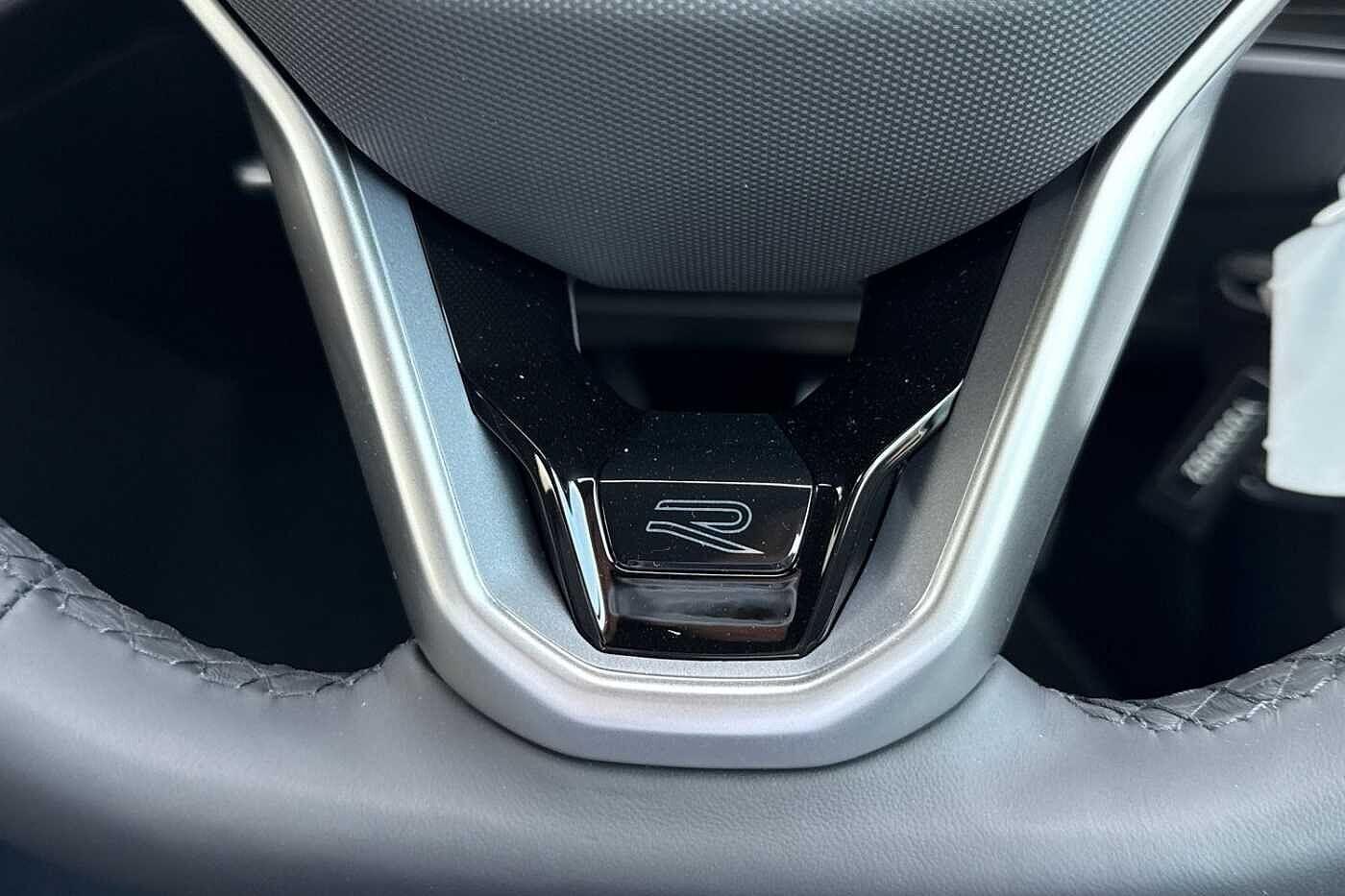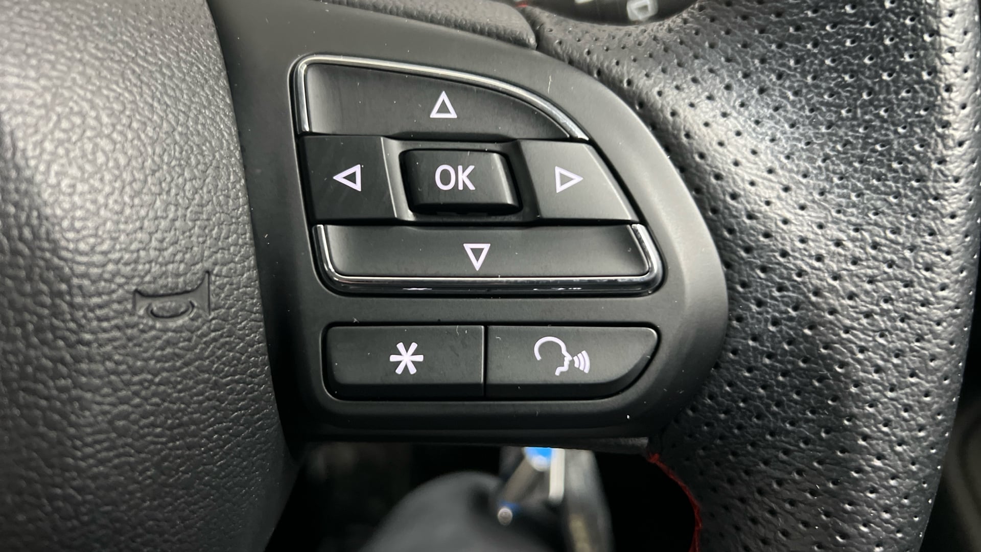 "3 spoke flat bottom leather steering wheel with satin chrome effect bezel",