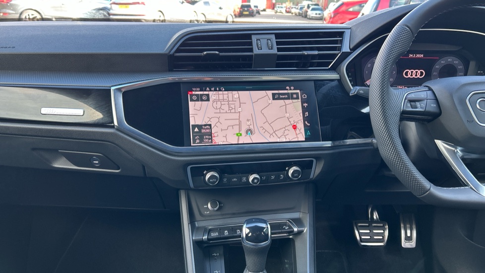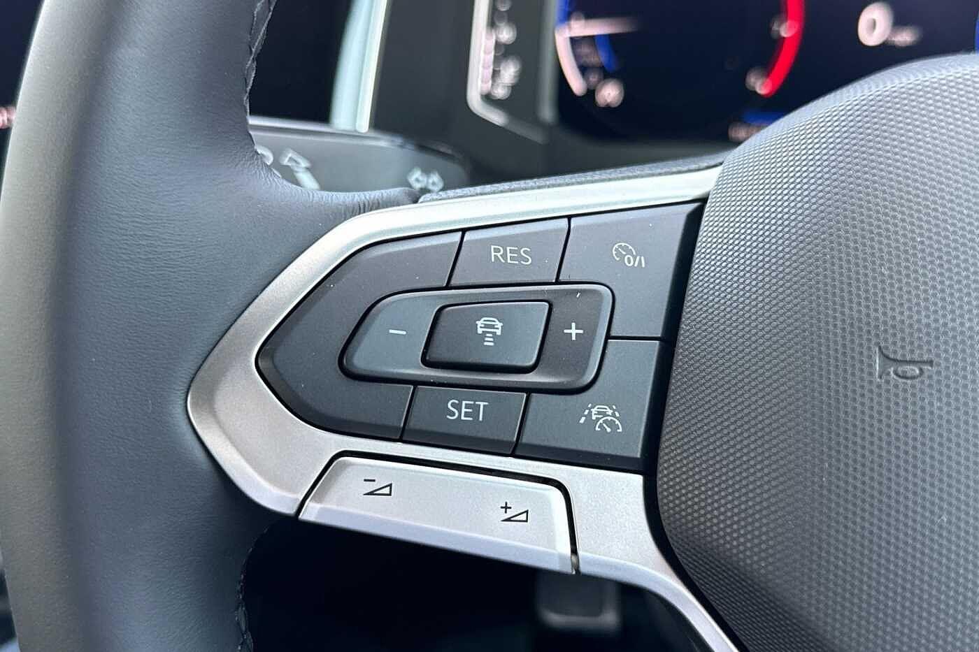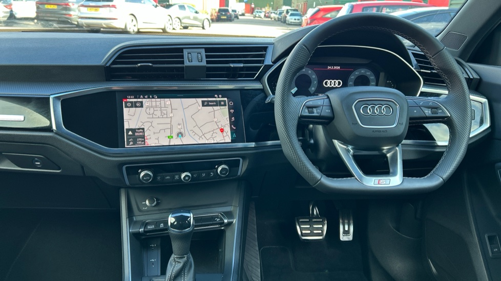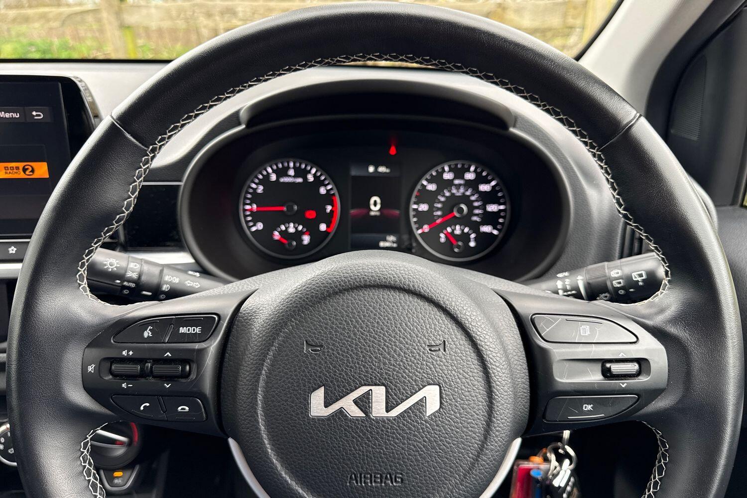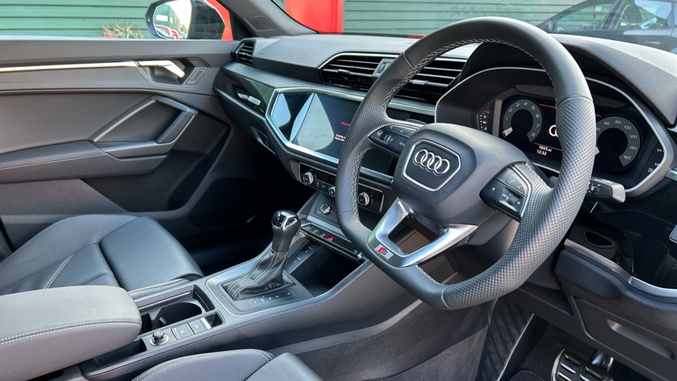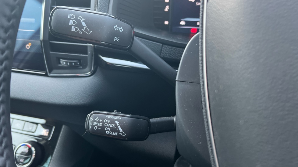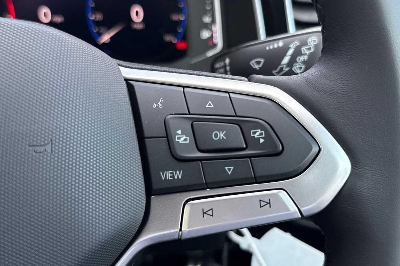 "3 spoke flat bottom leather steering wheel with satin chrome effect bezel",