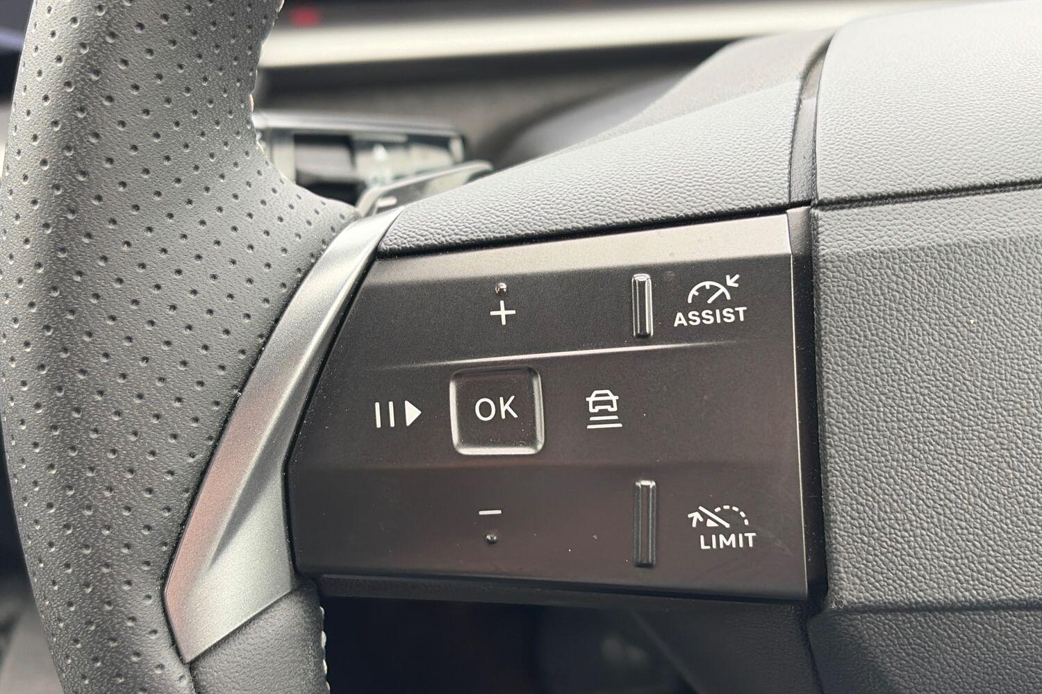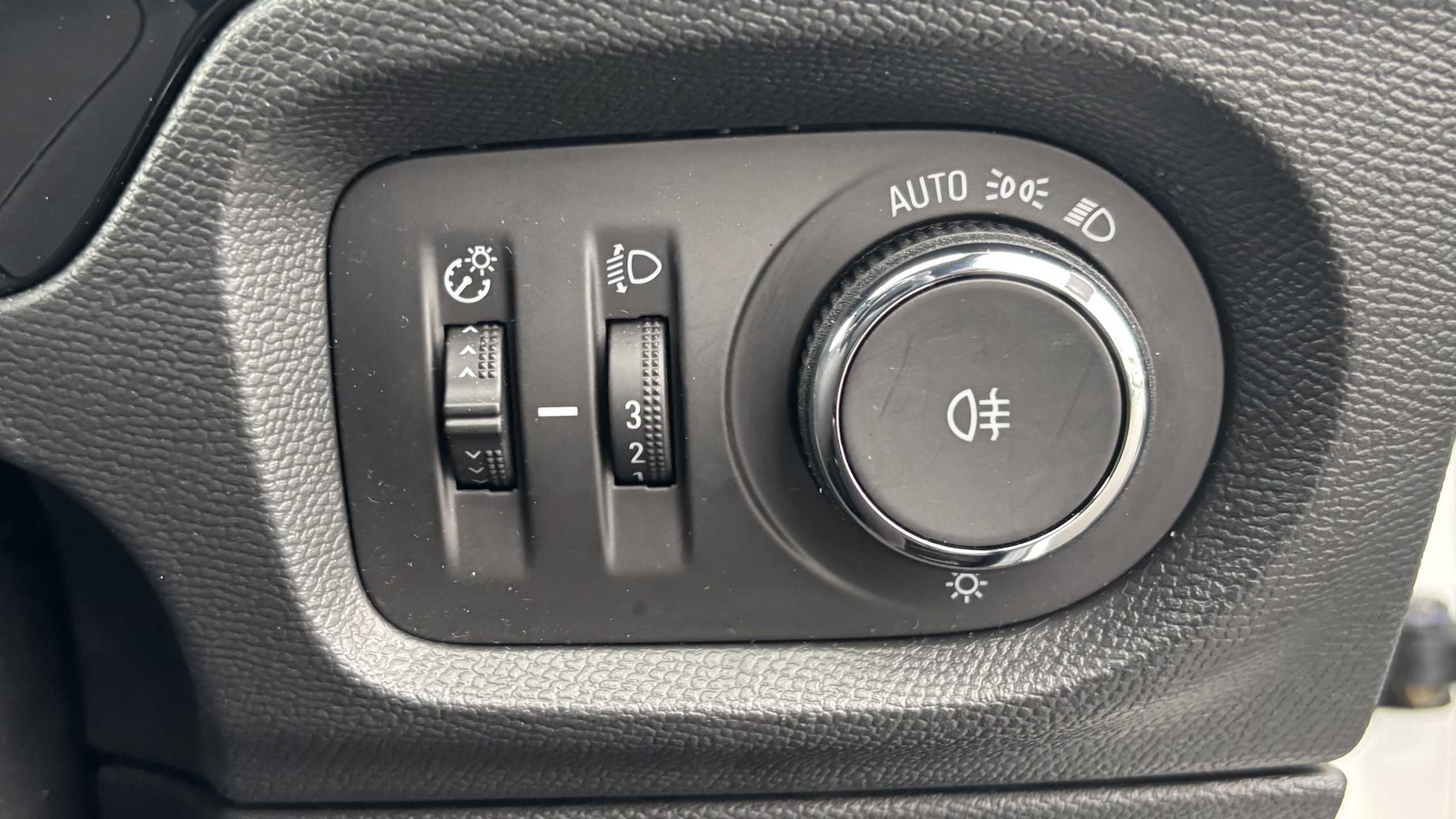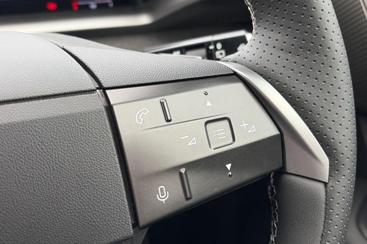 "3 spoke flat bottomed leather effect steering wheel with satin chrome effect bezel",