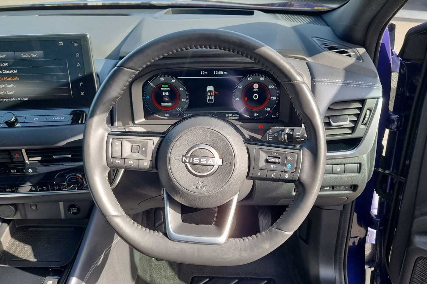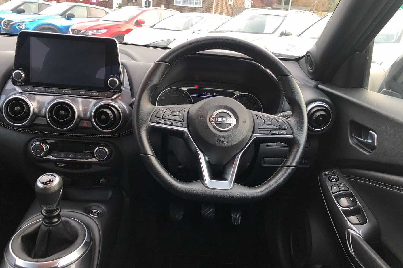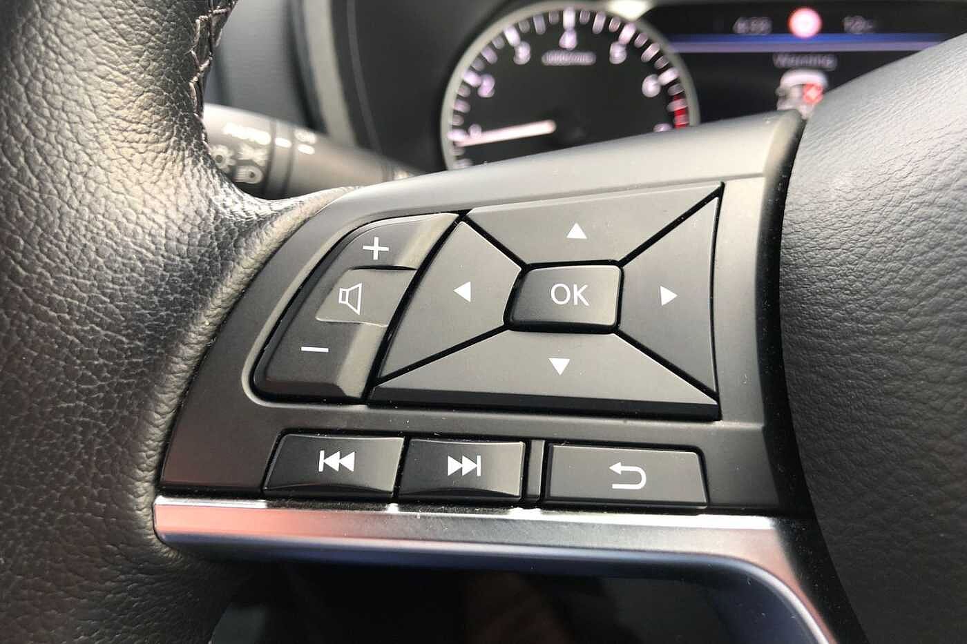 "3 spoke flat bottomed leather effect steering wheel with satin chrome effect bezel",
