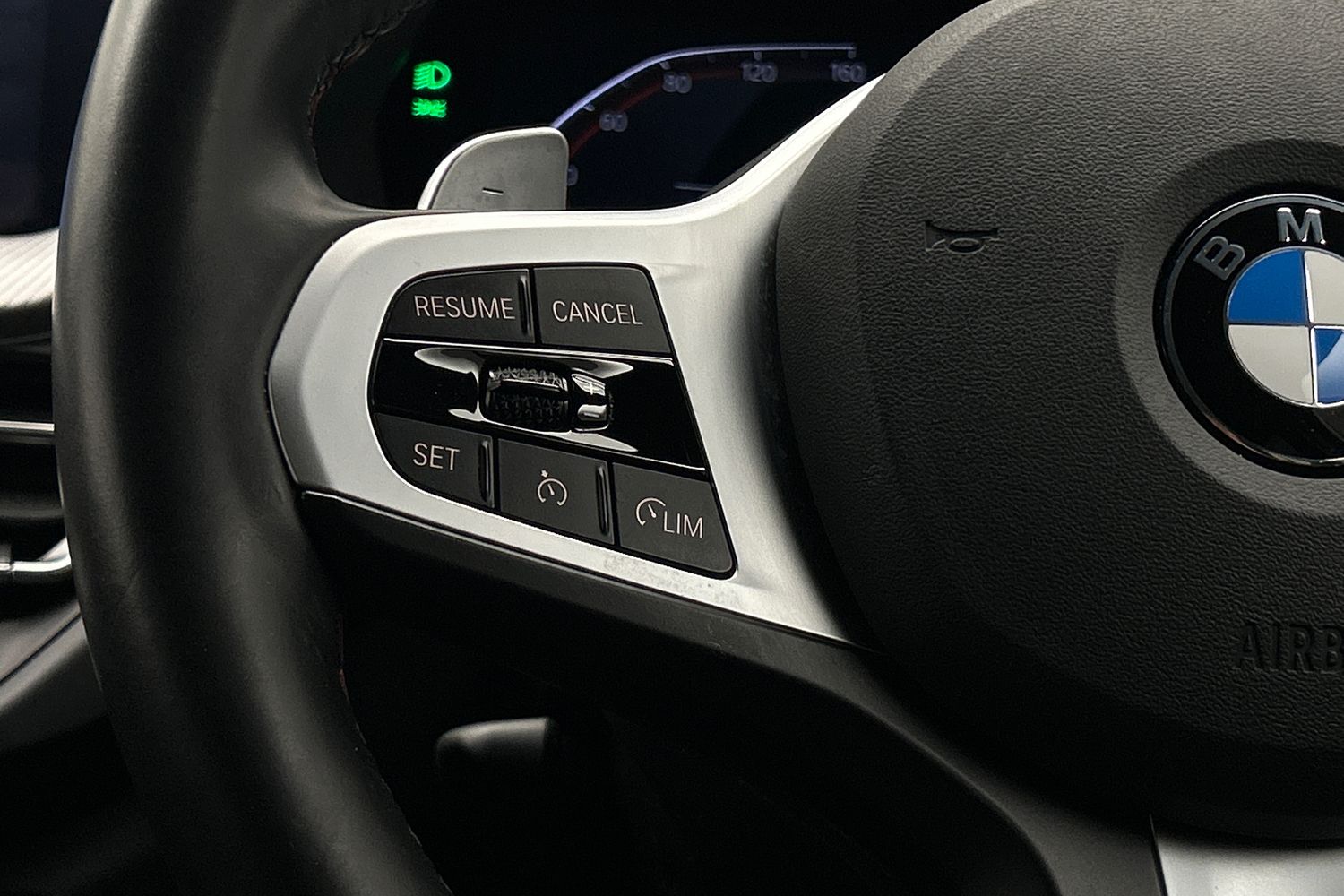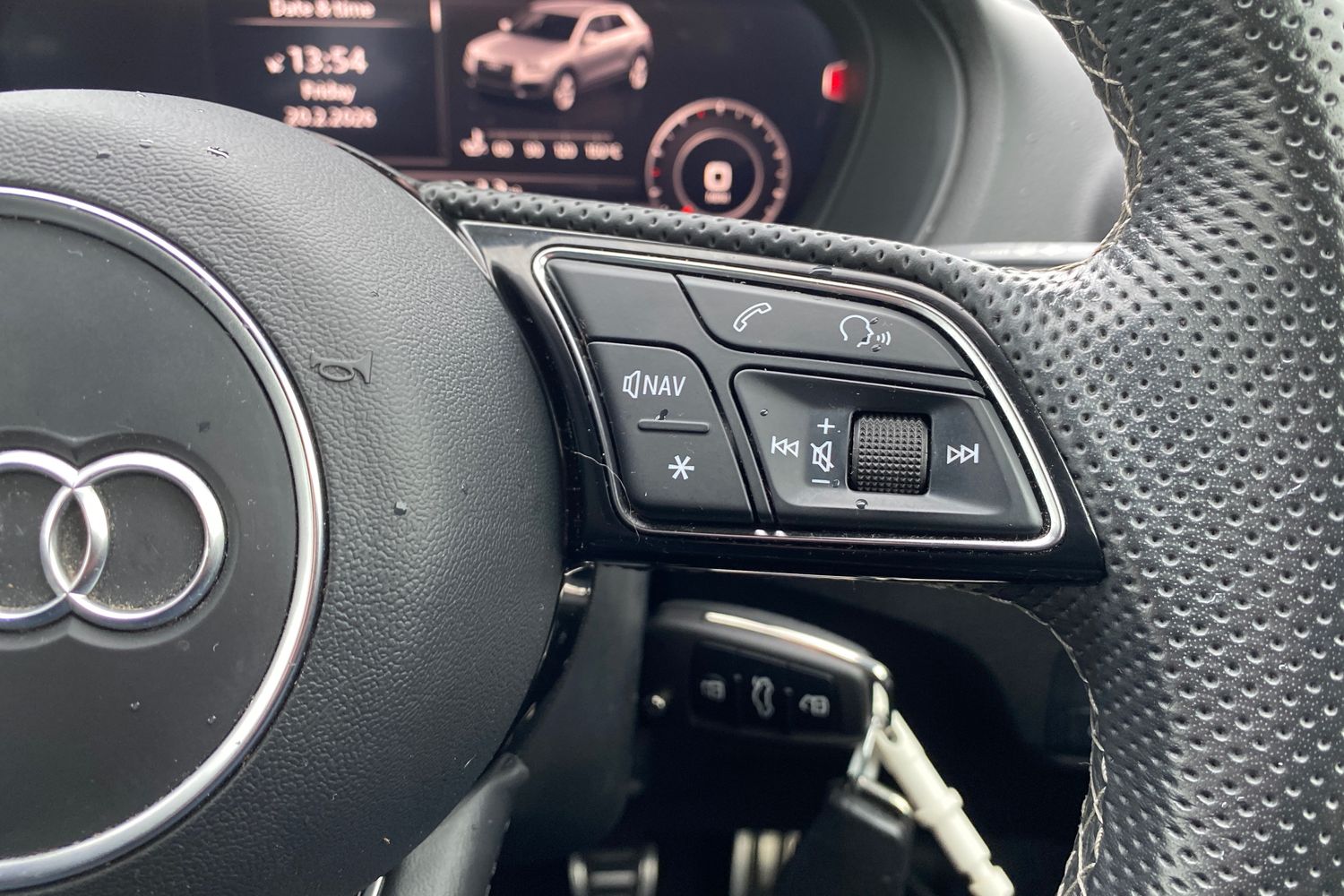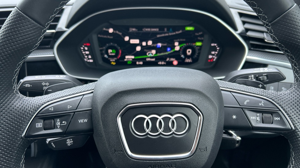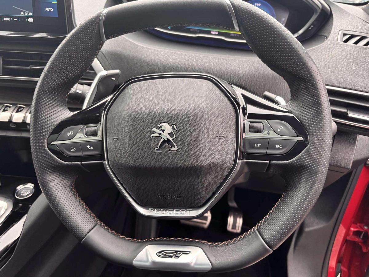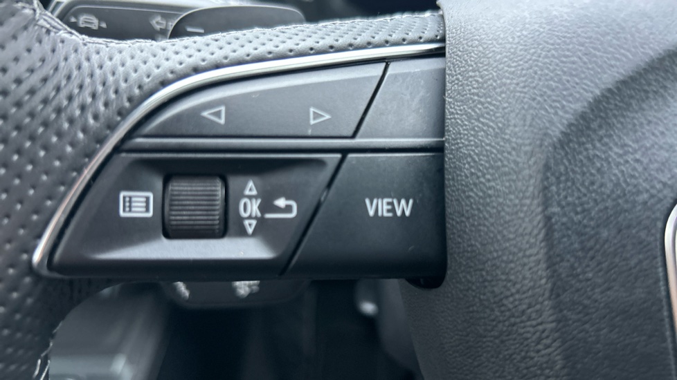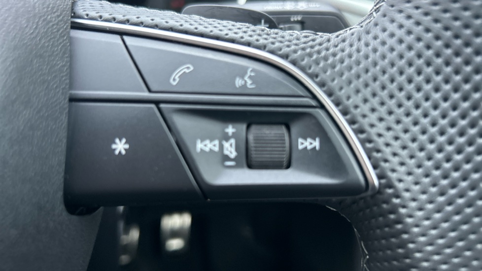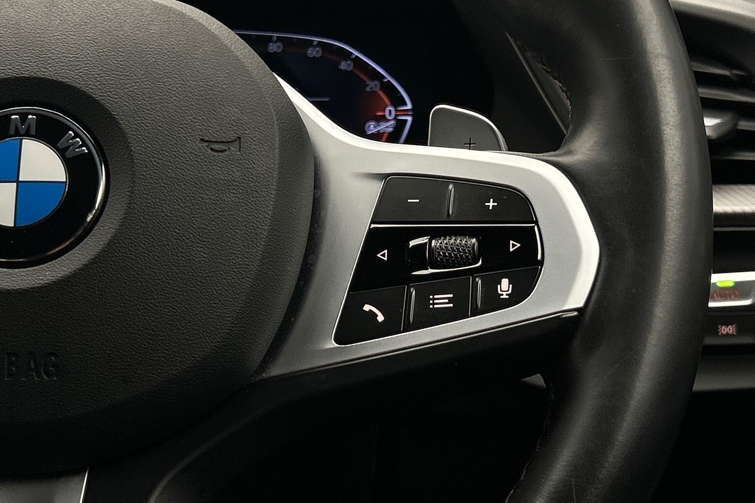 "Three spoke leather wrapped multifunction steering wheel with shifting paddles"