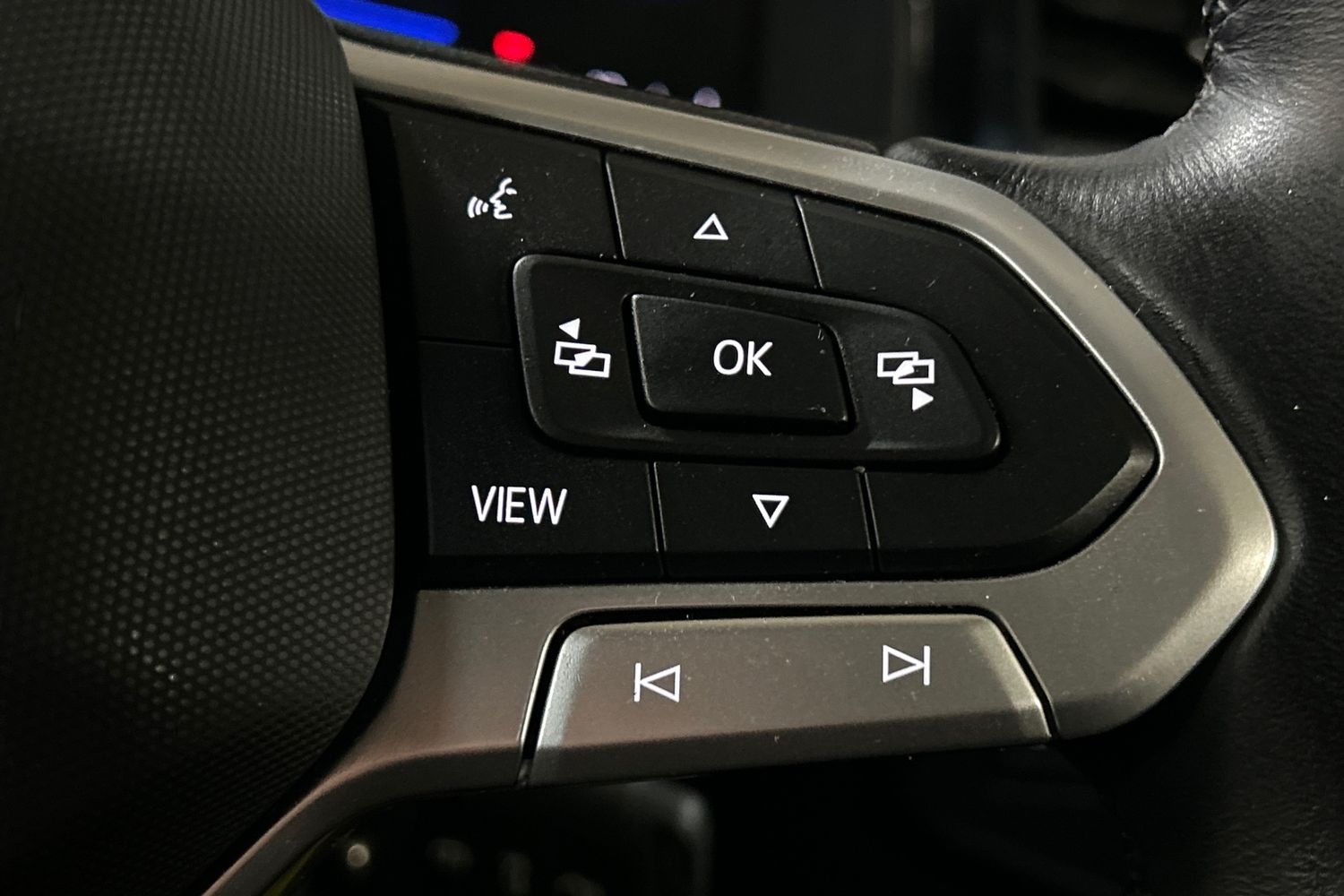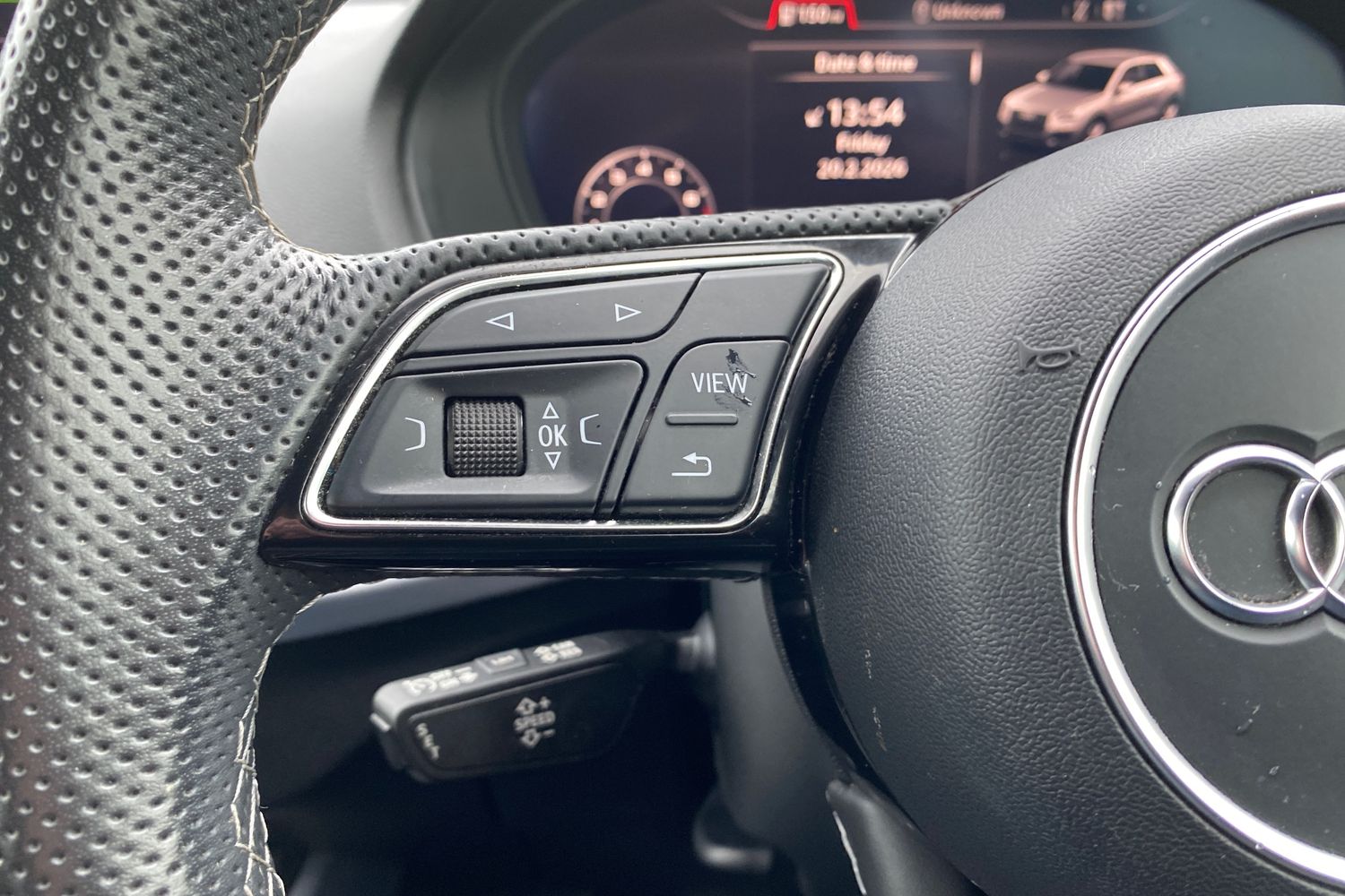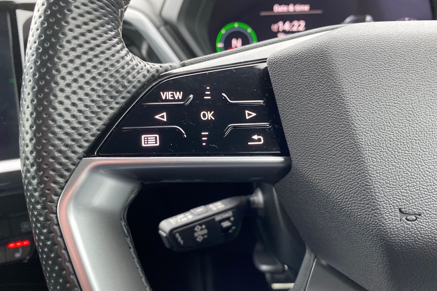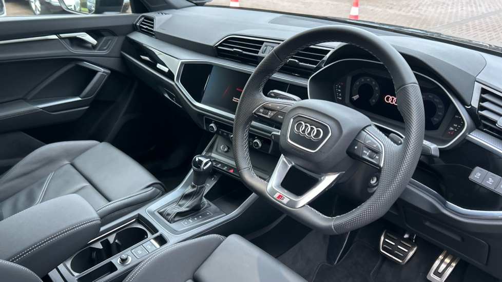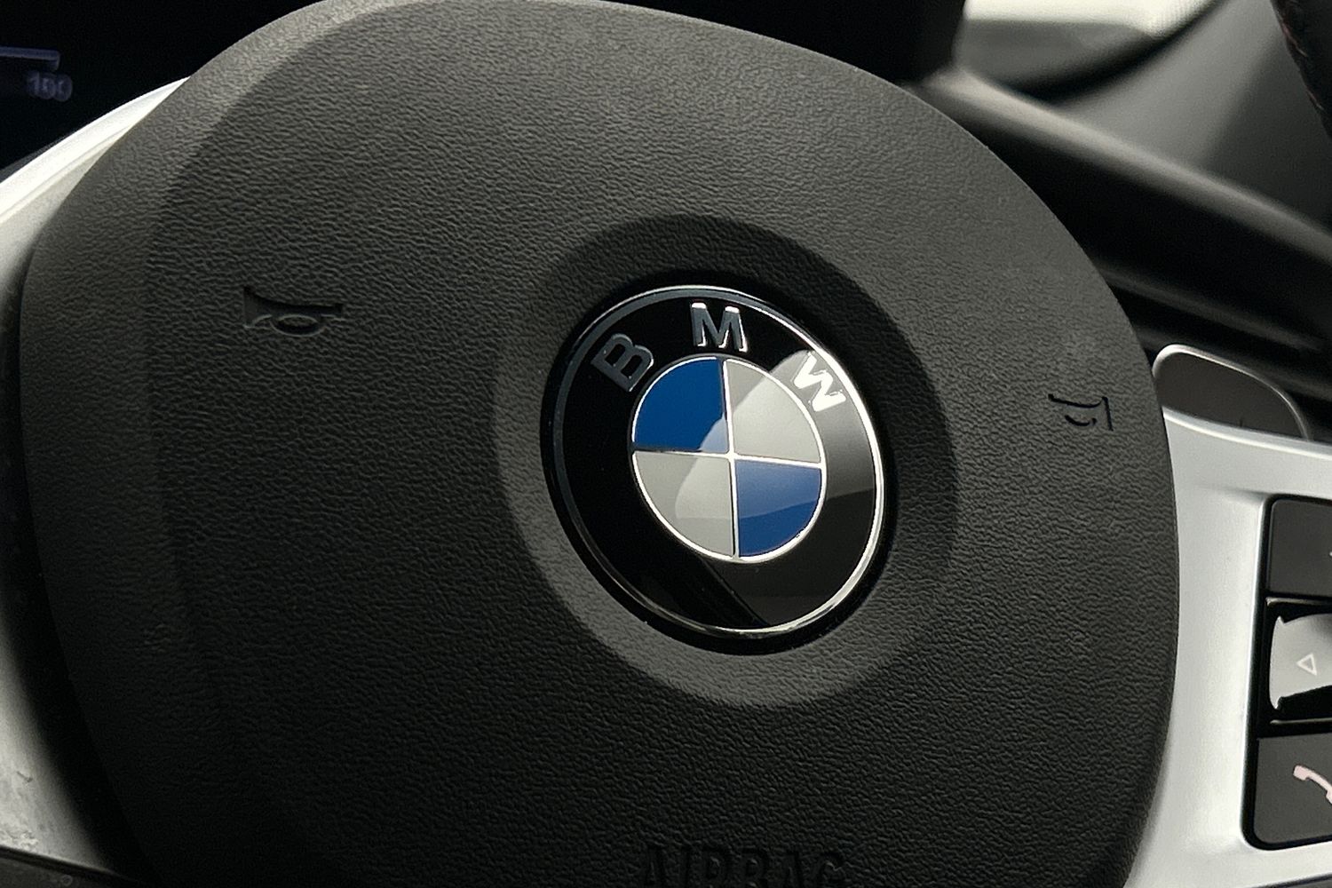 "Three spoke leather wrapped multifunction steering wheel with shifting paddles"