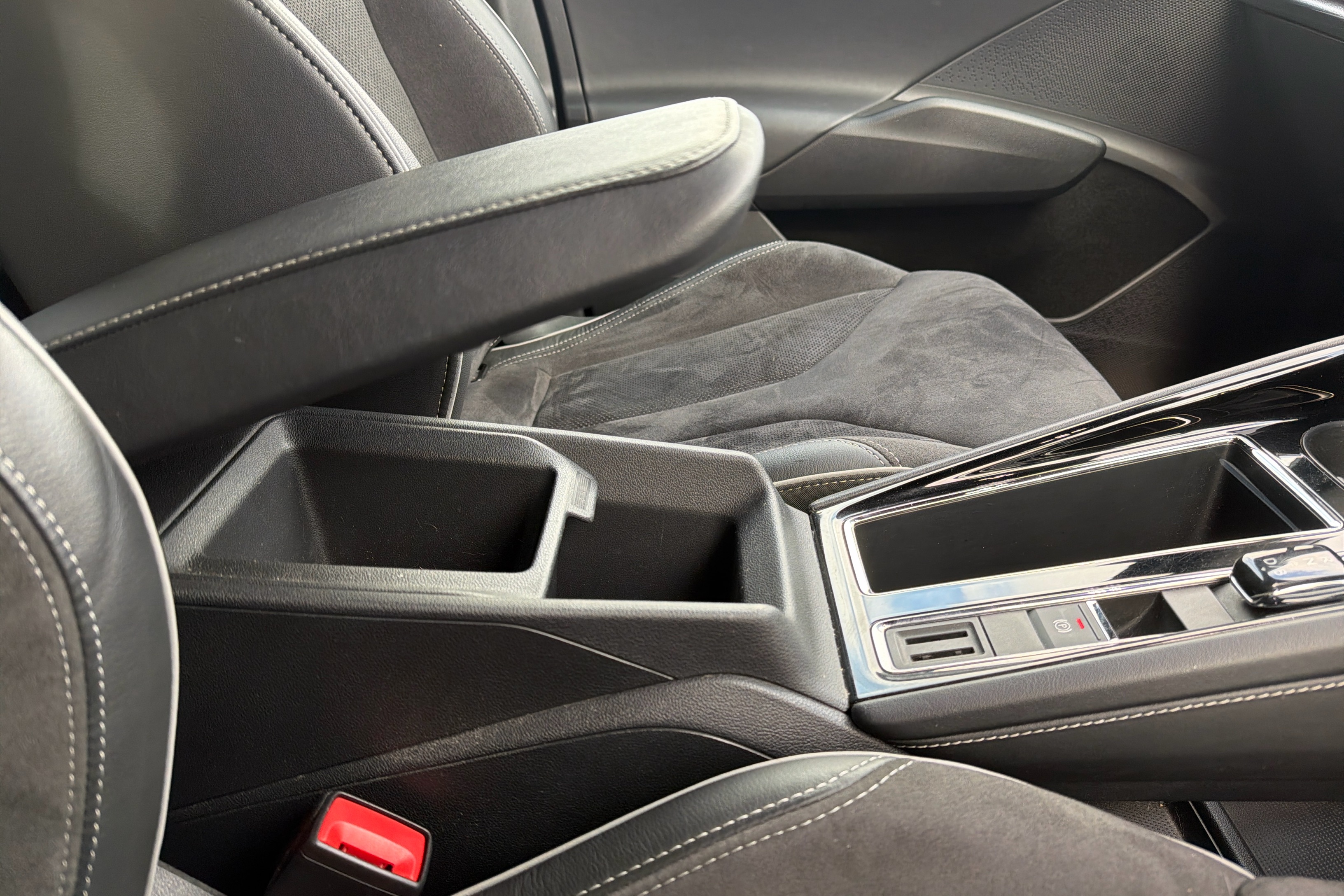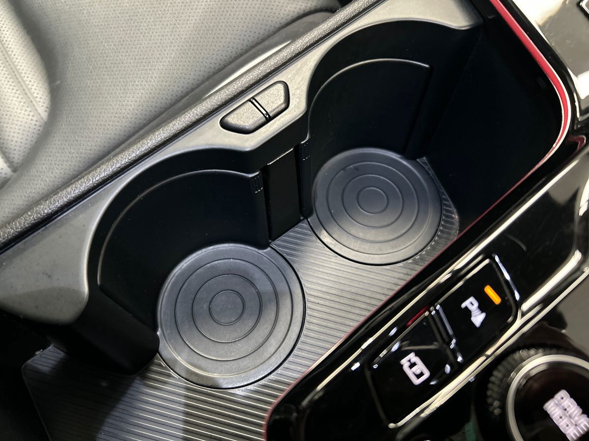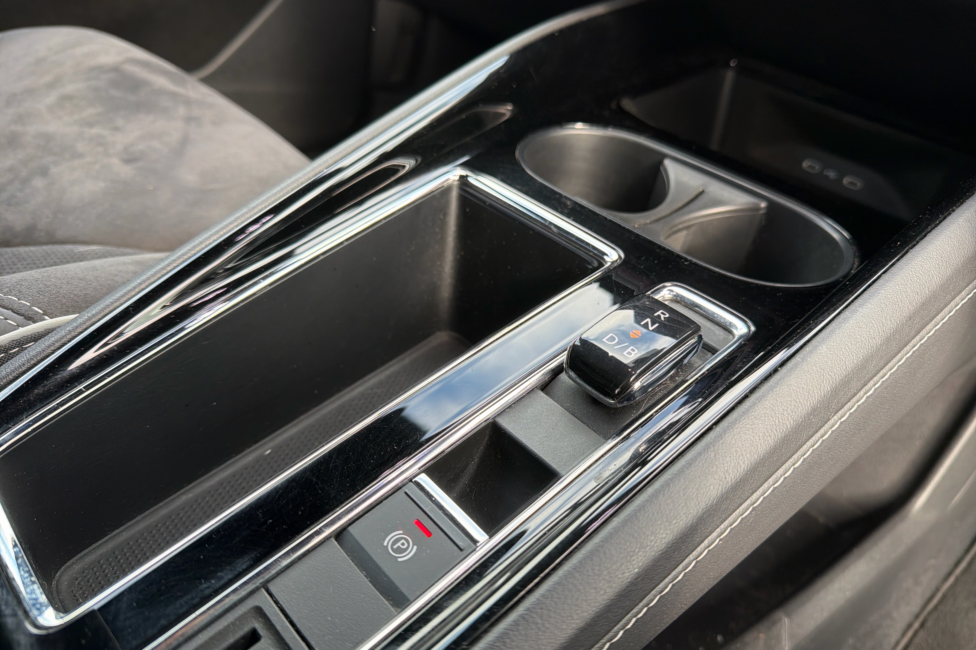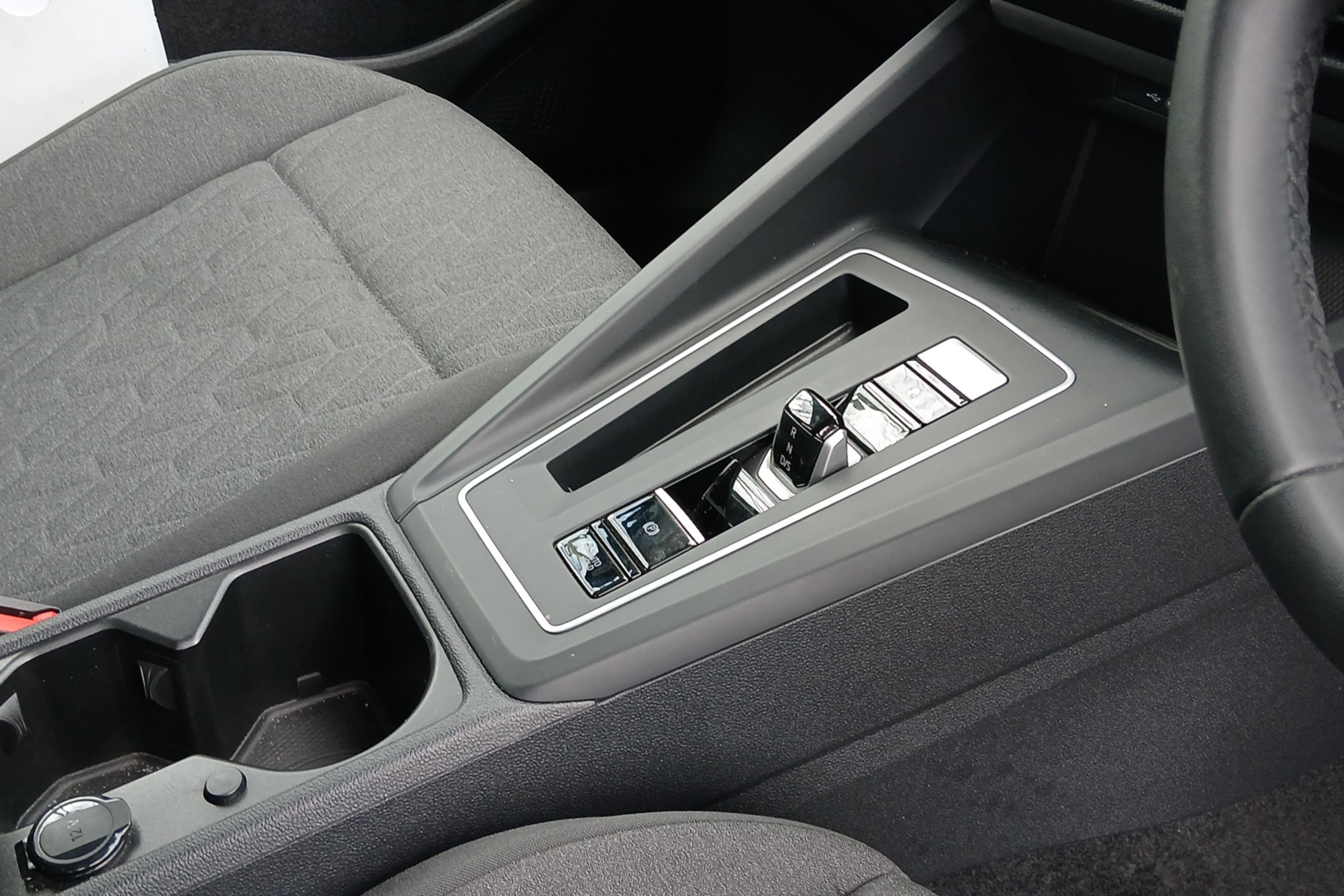 "Narrow centre console with cup holder and compartment for mobile phone",