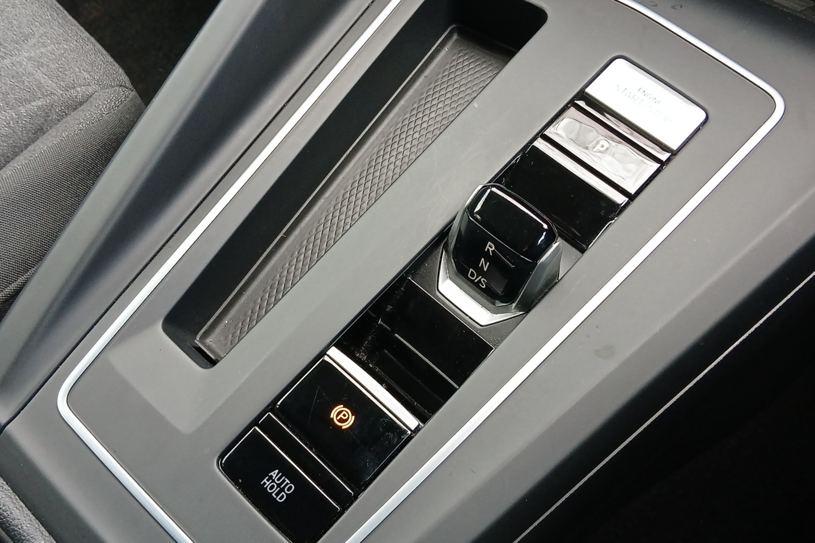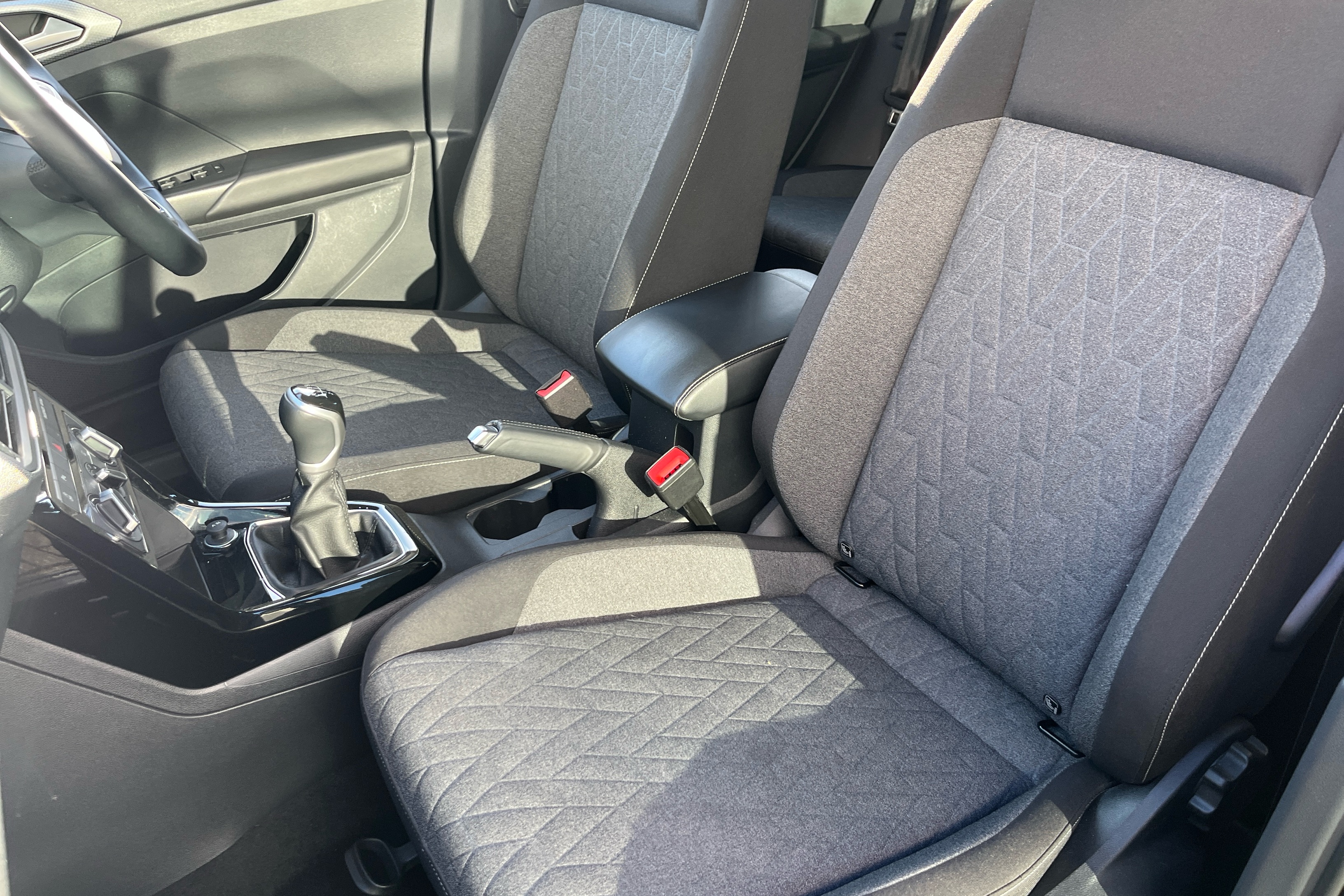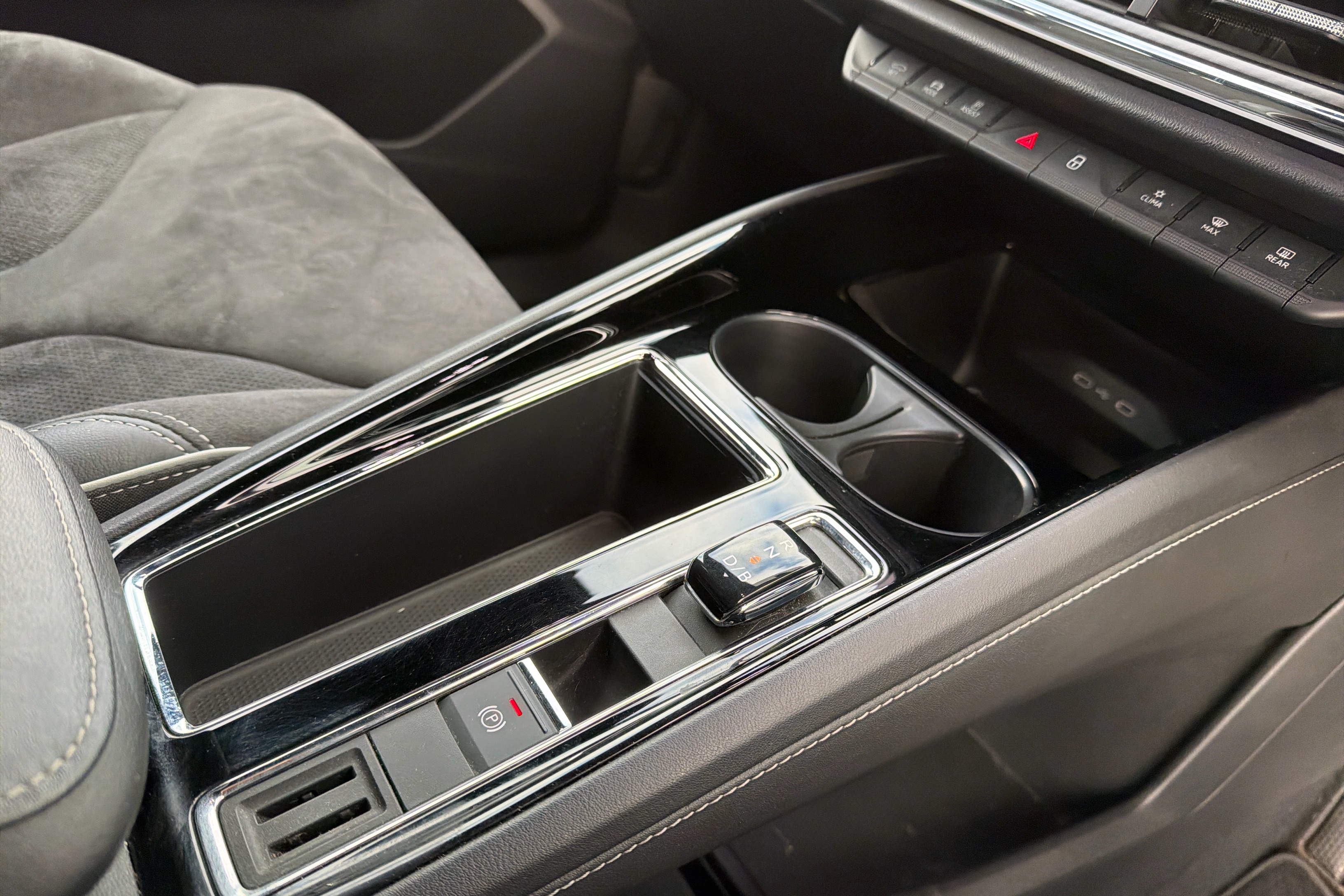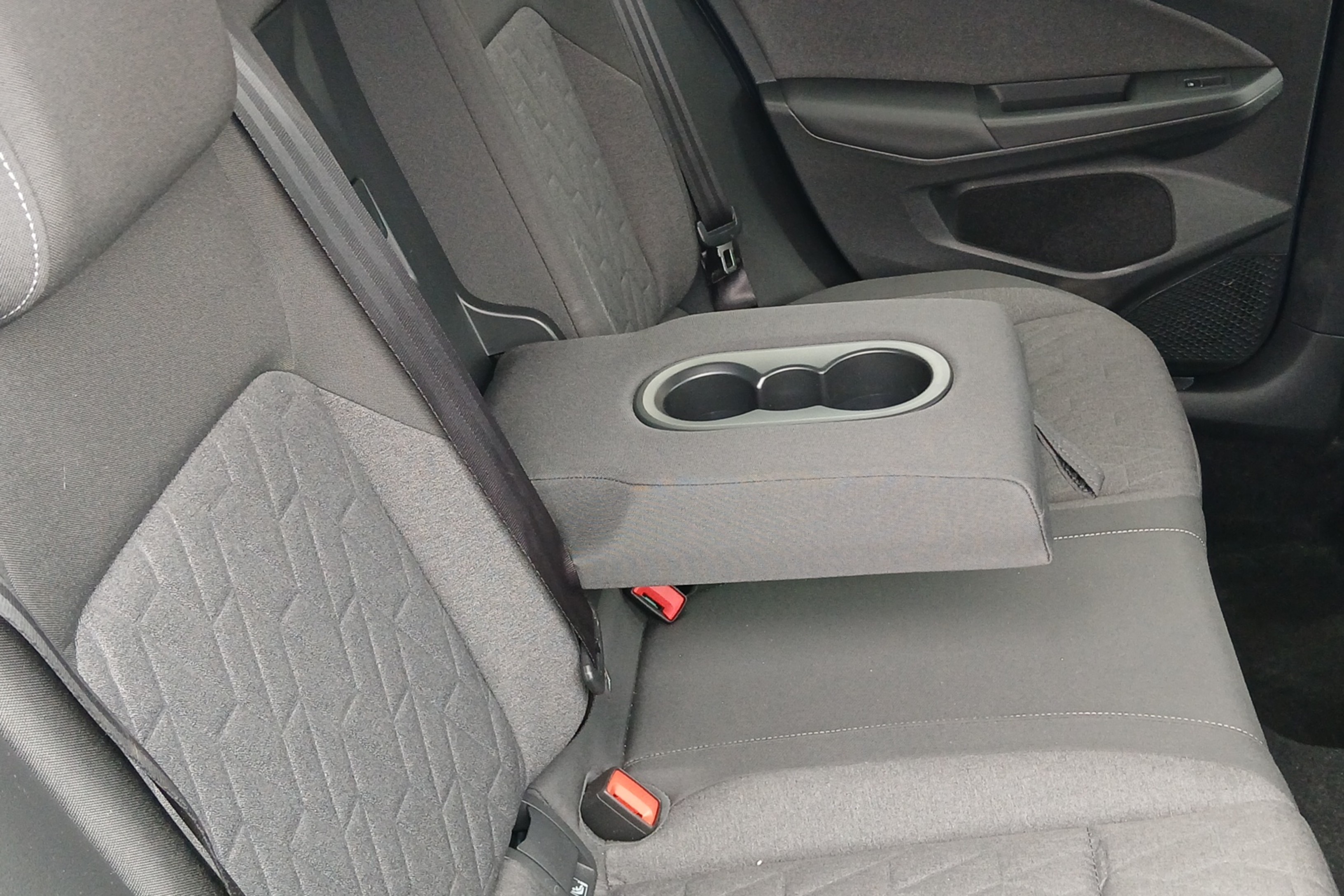 "Narrow centre console with cup holder and compartment for mobile phone",