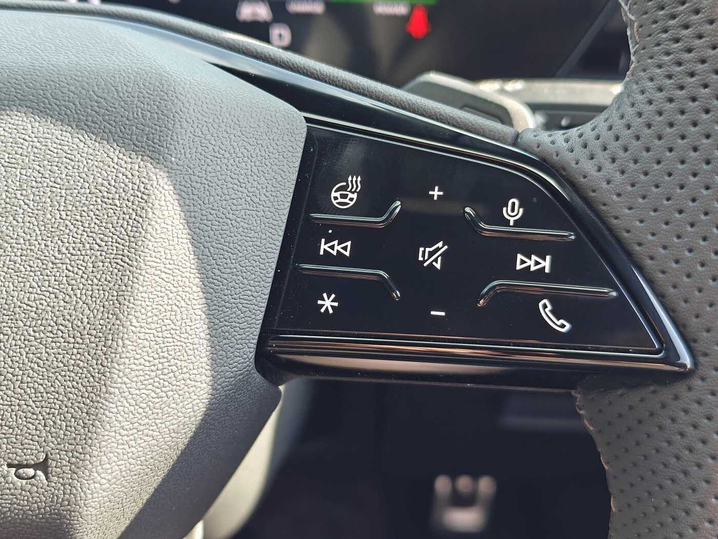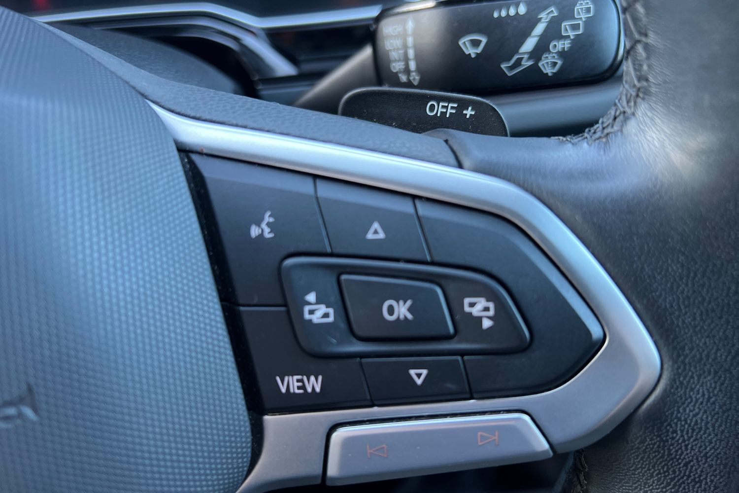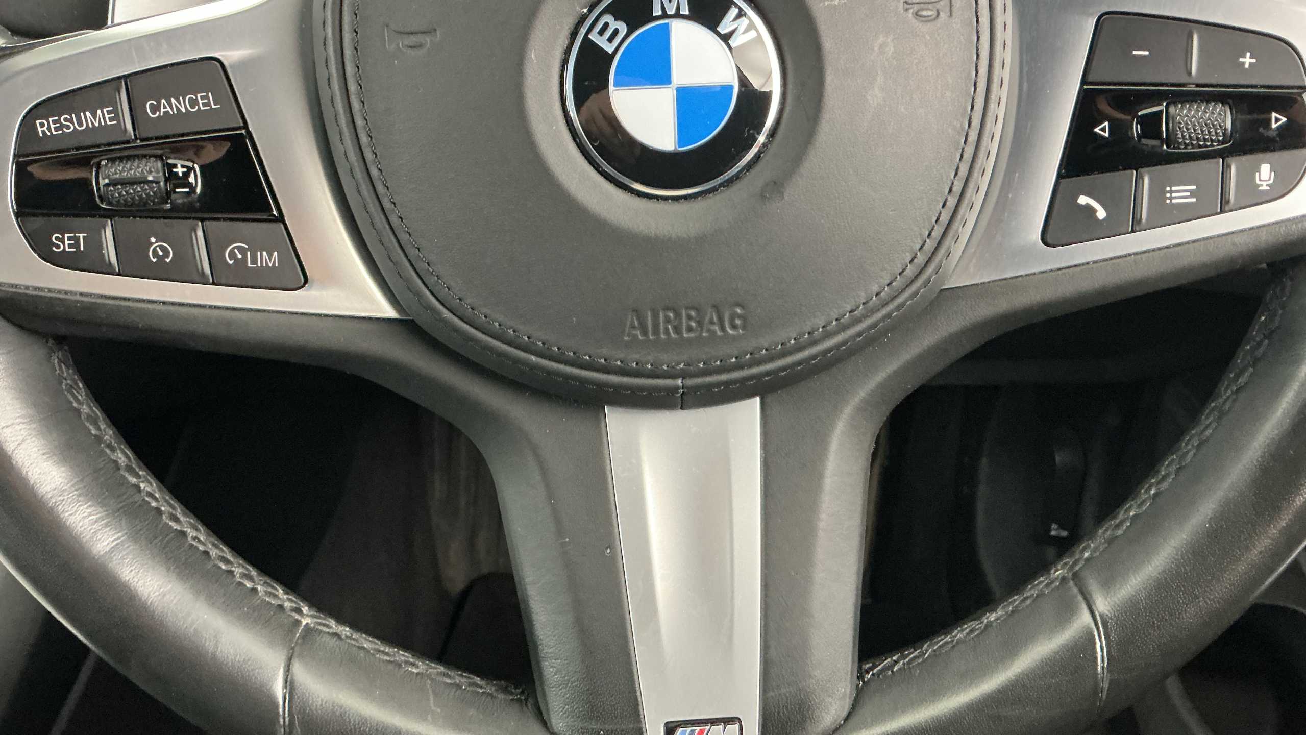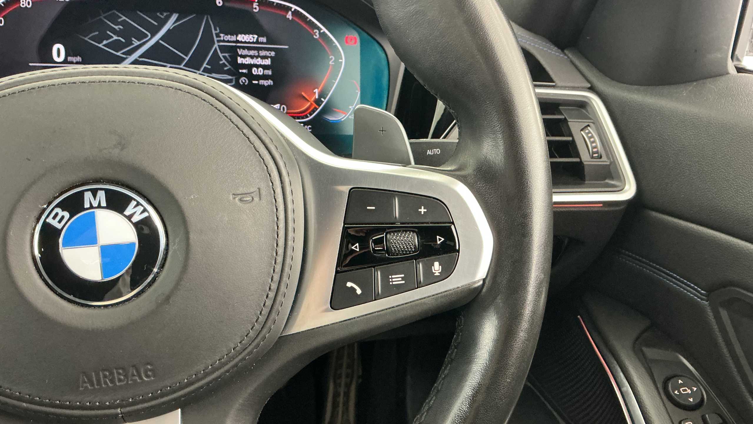 "Three spoke leather wrapped multifunction steering wheel with shifting paddles"