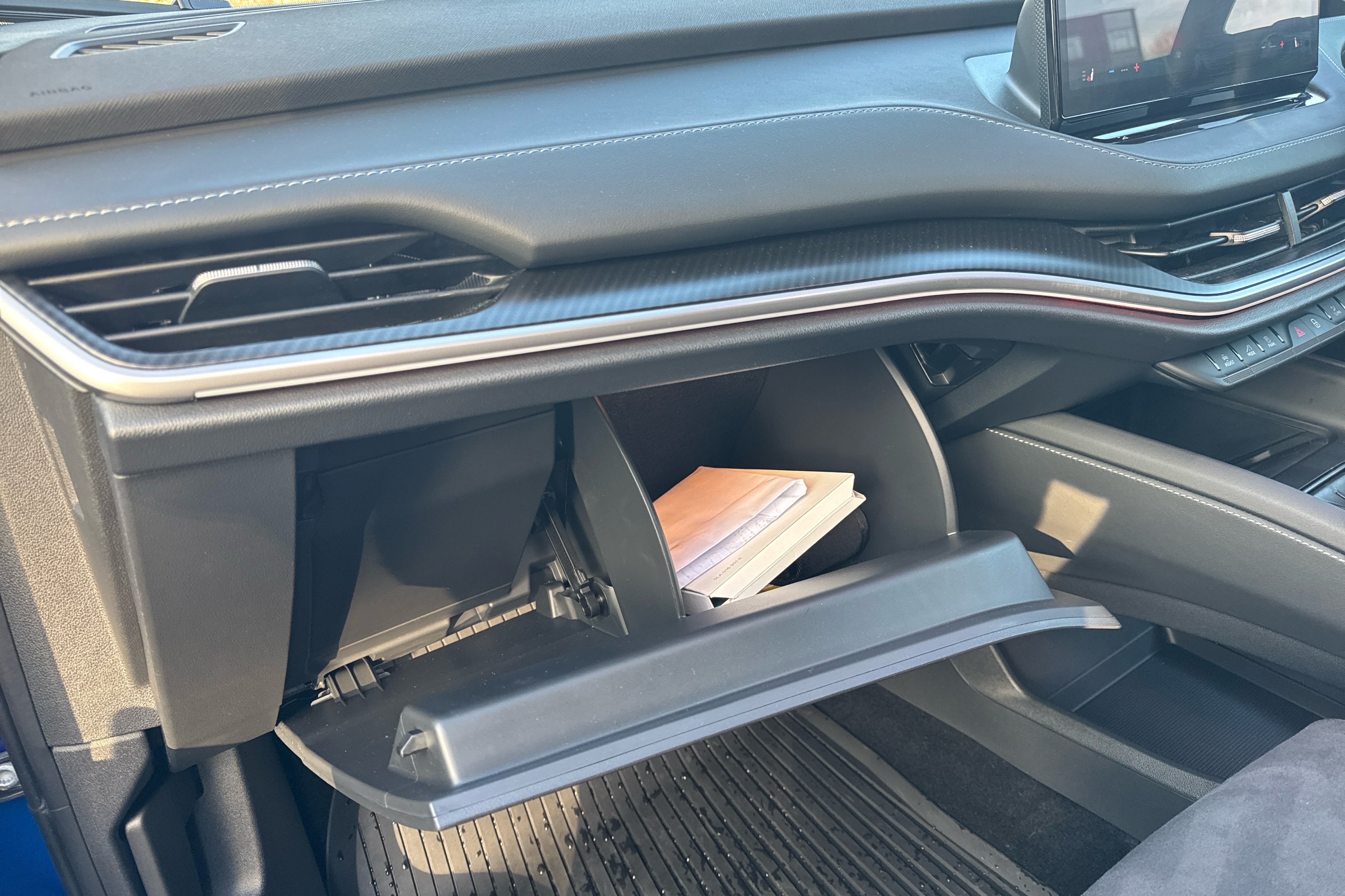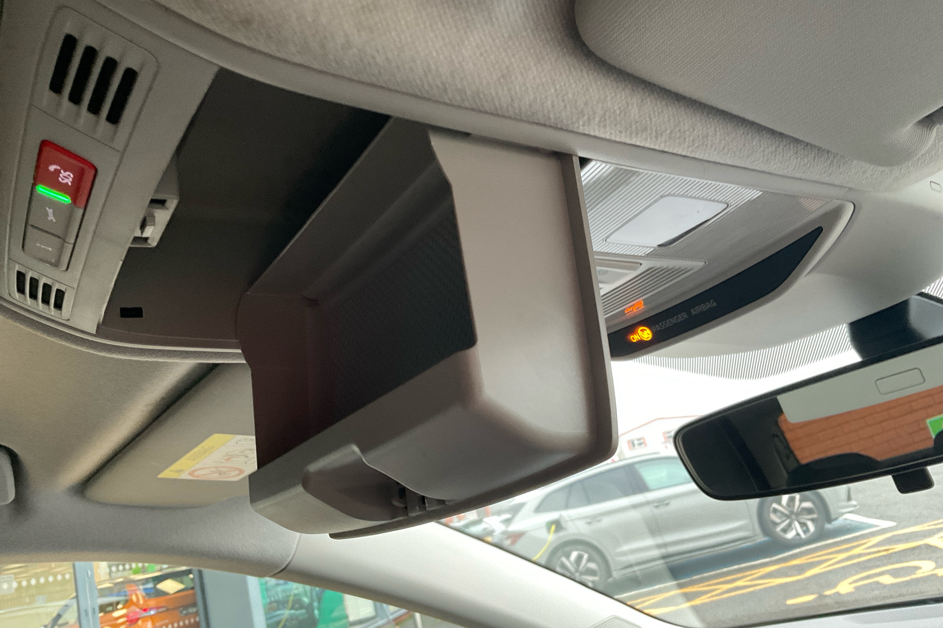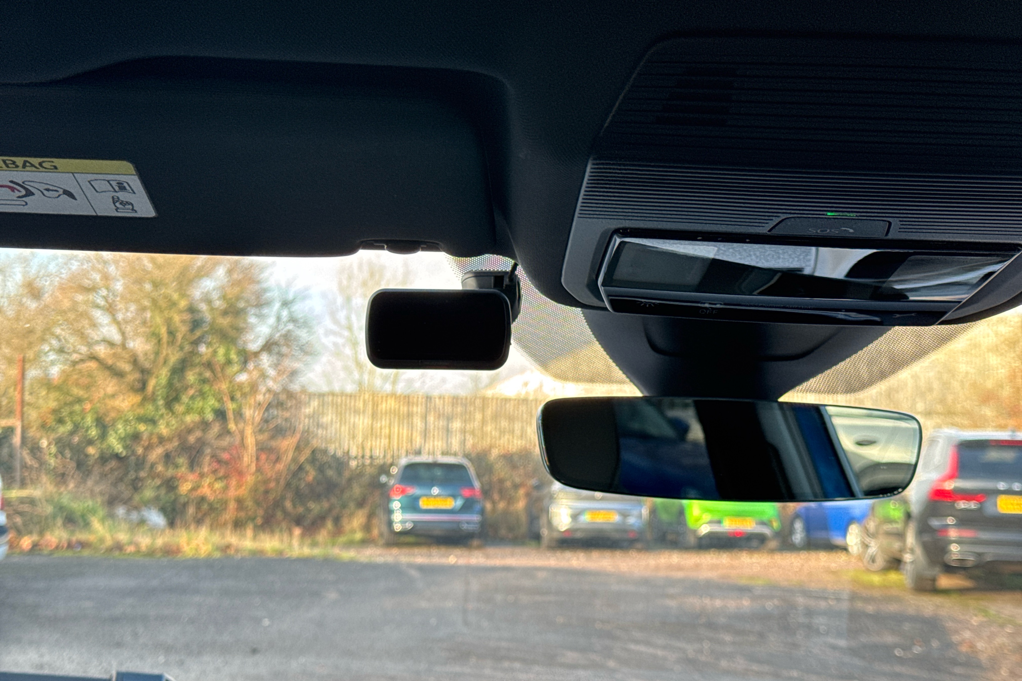 "Sun visors with mirror and airbag label on passenger side",