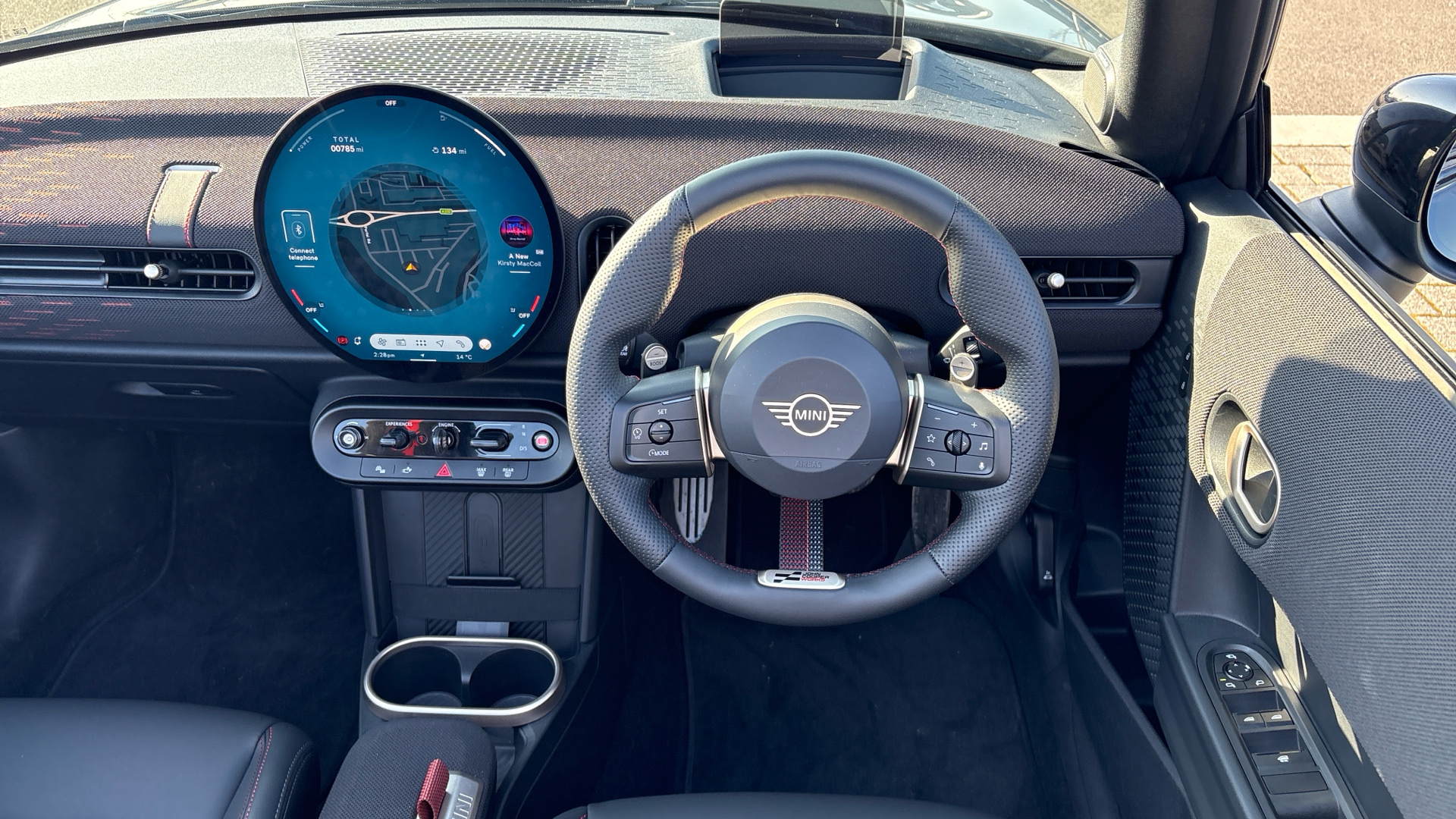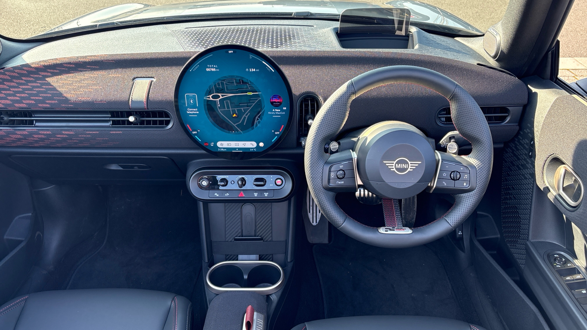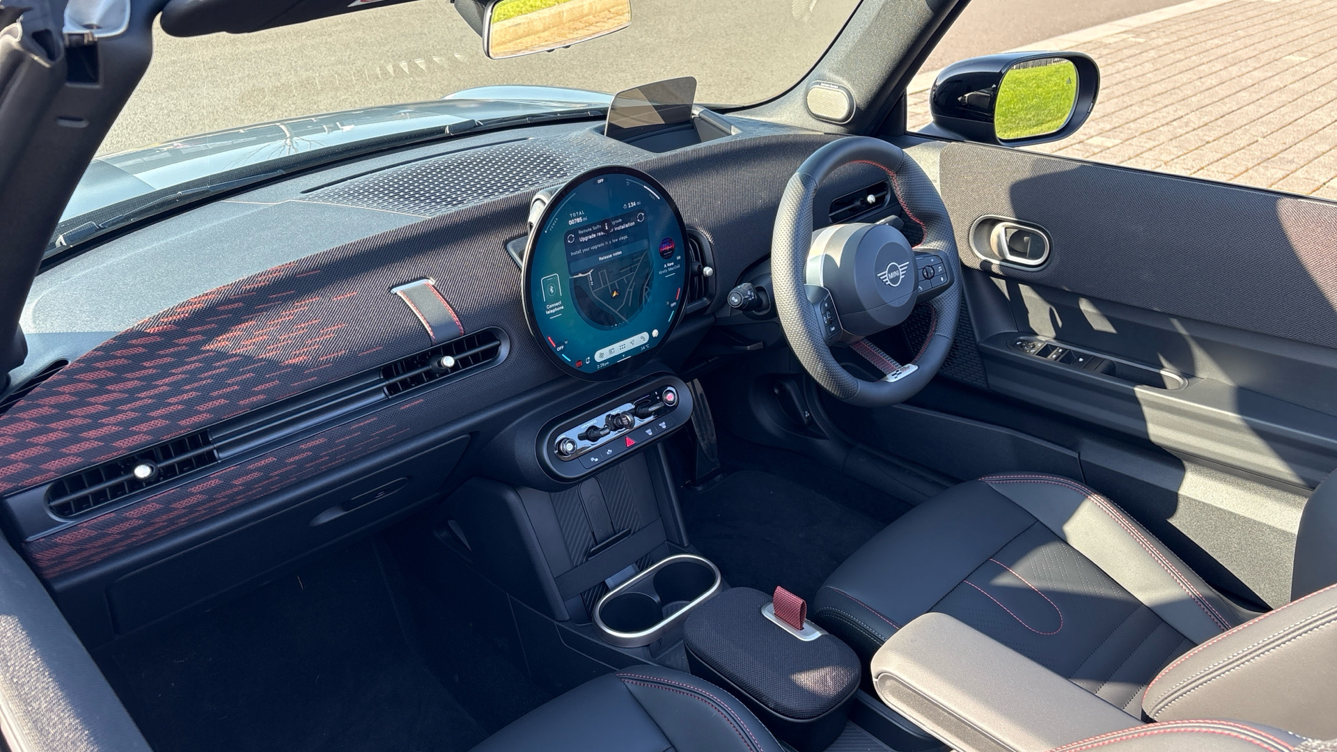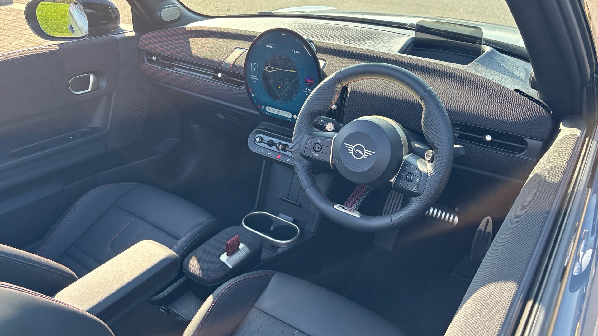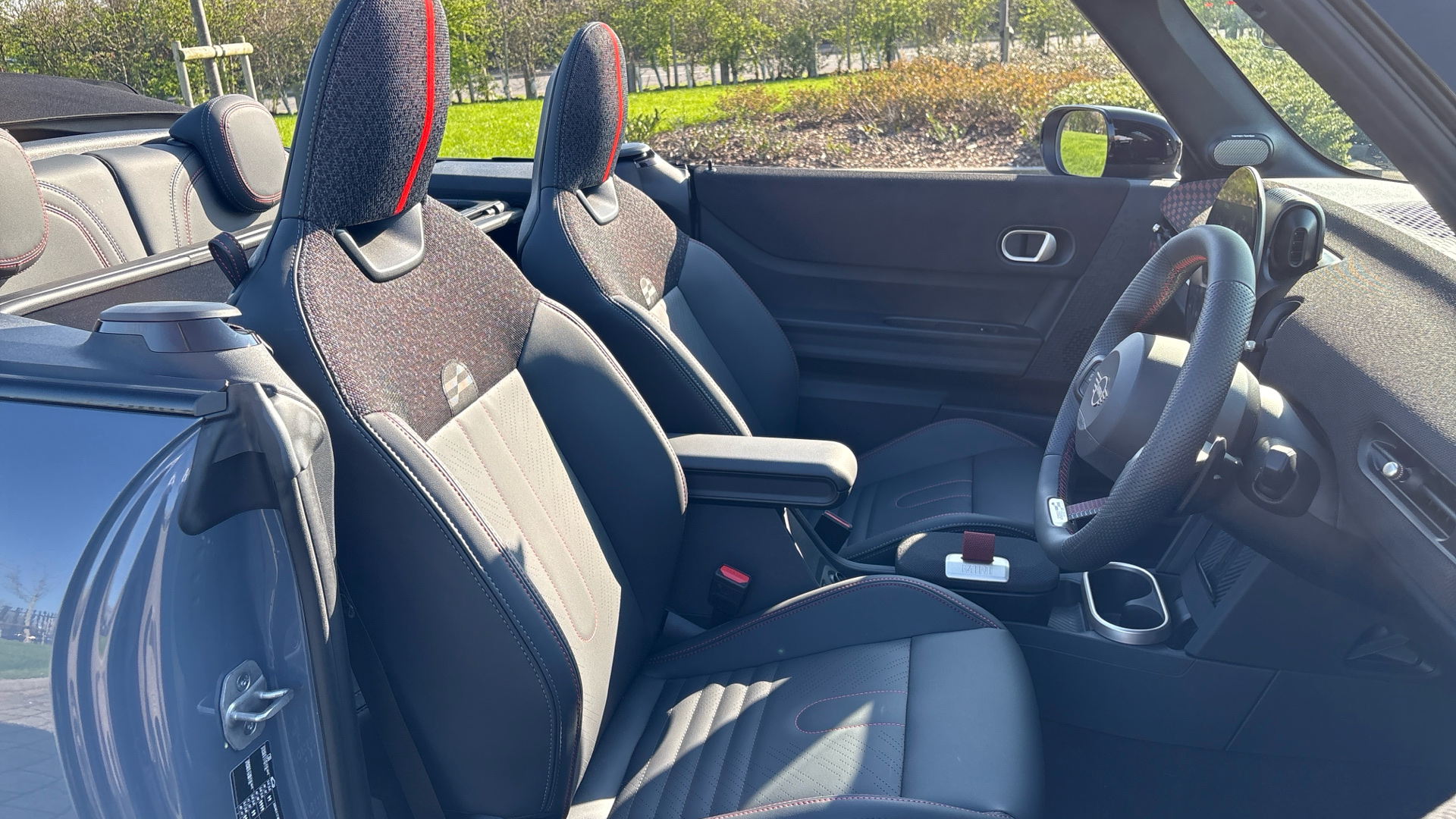 "Vescin/Cord combination JCW upholstery includes dash knit in black with red accents"