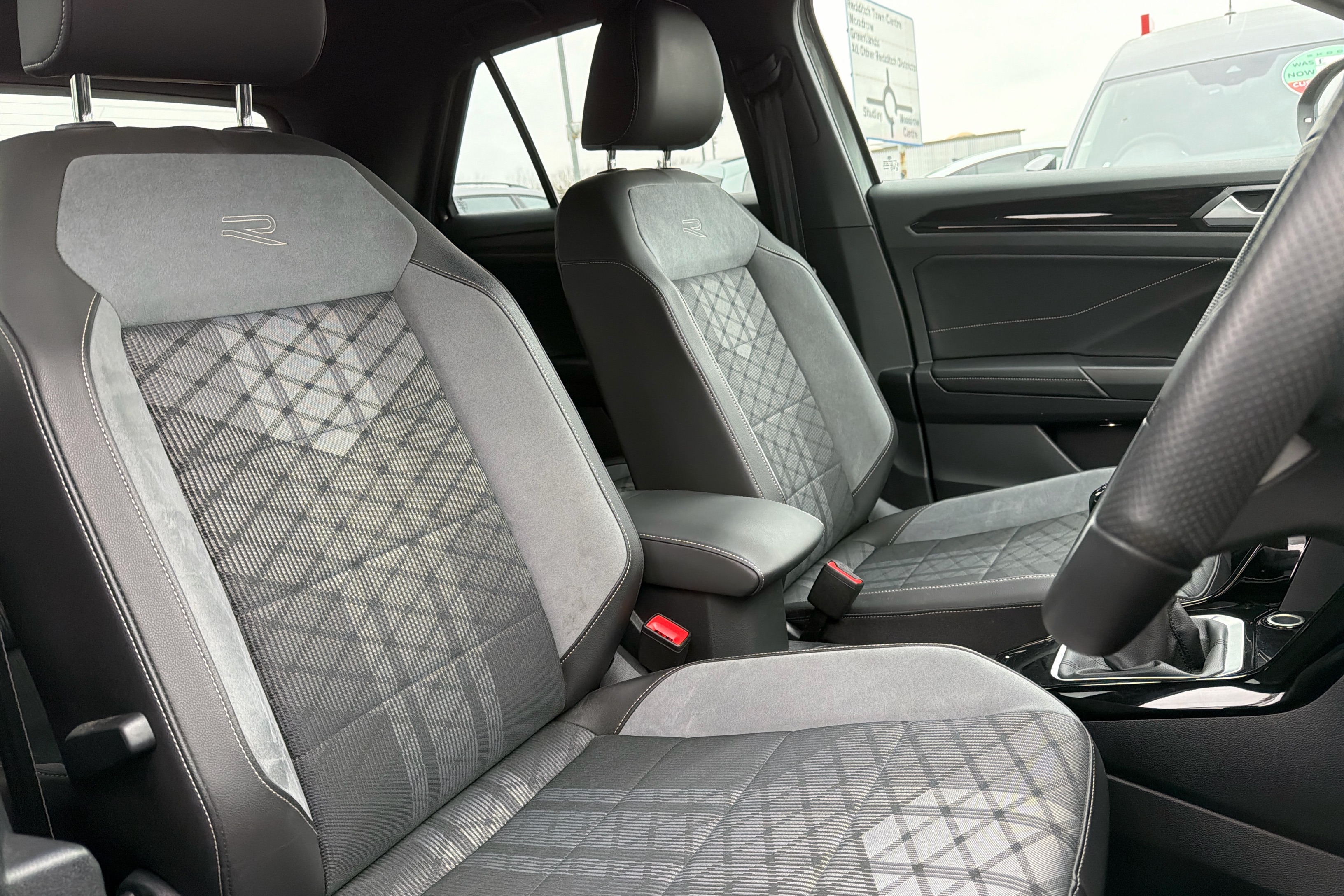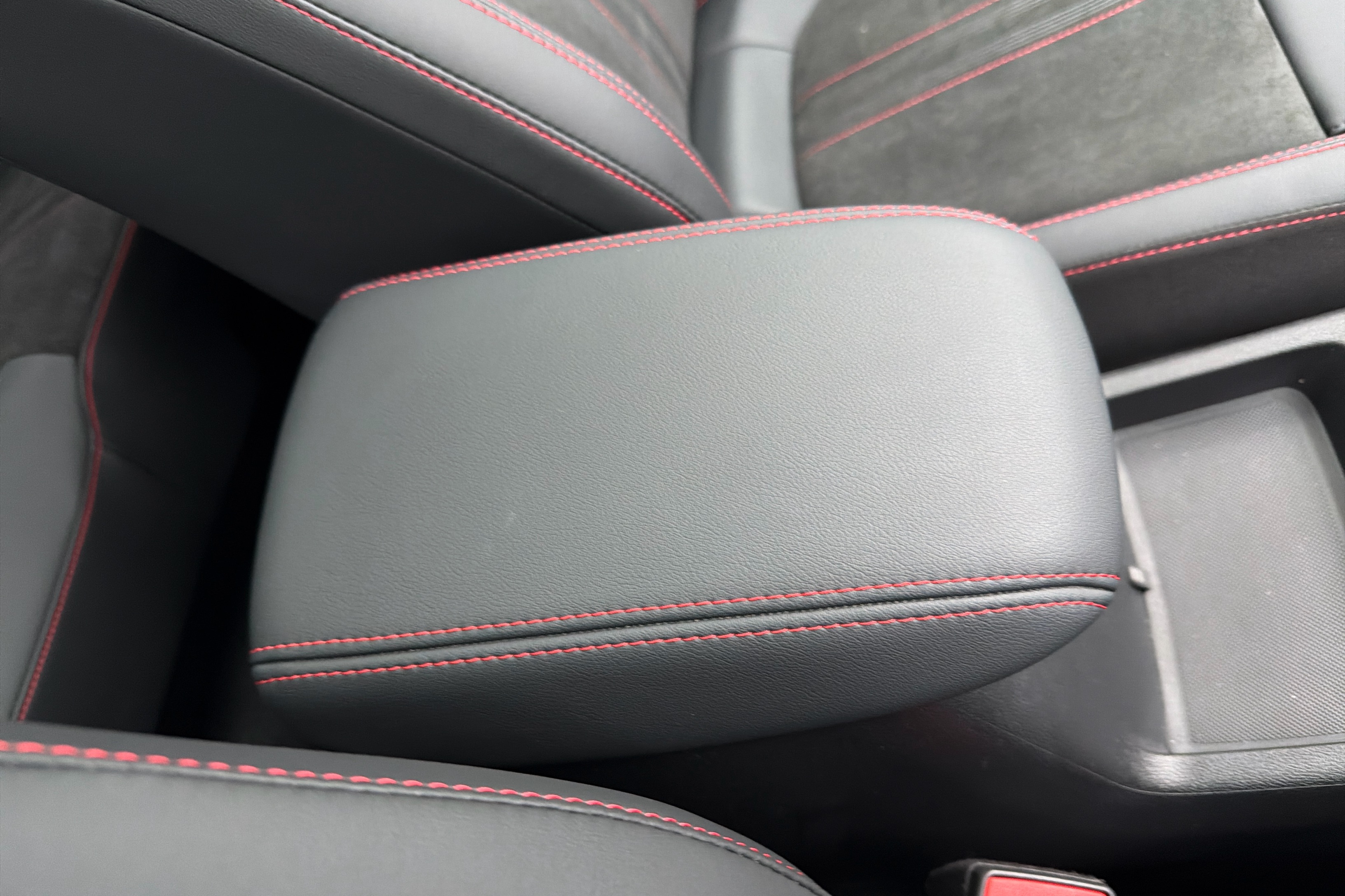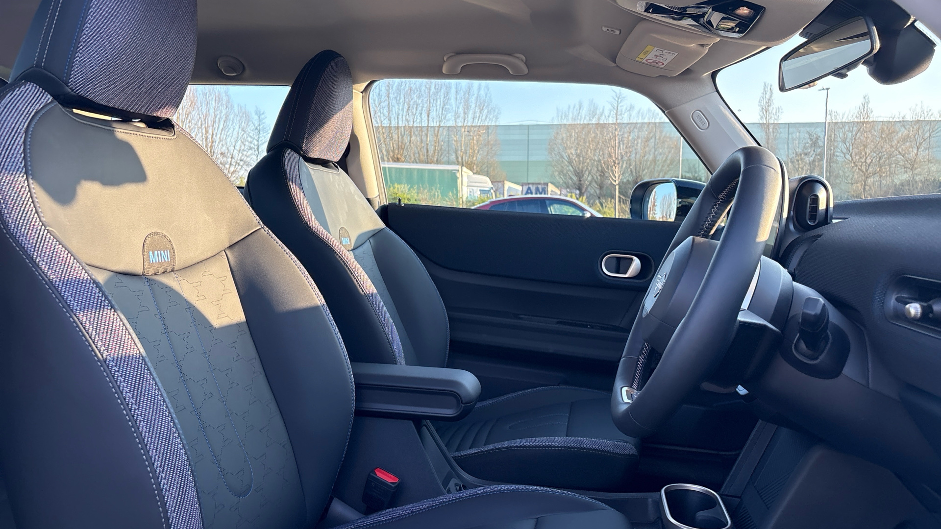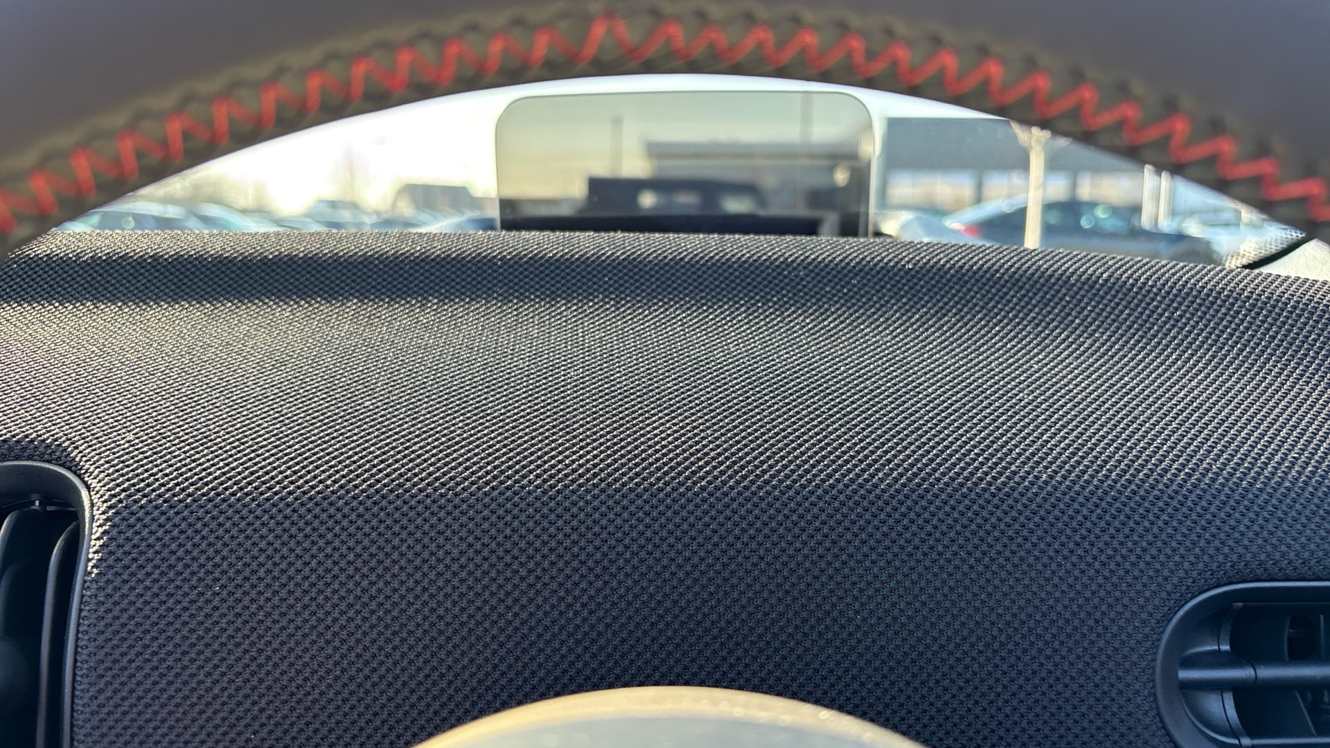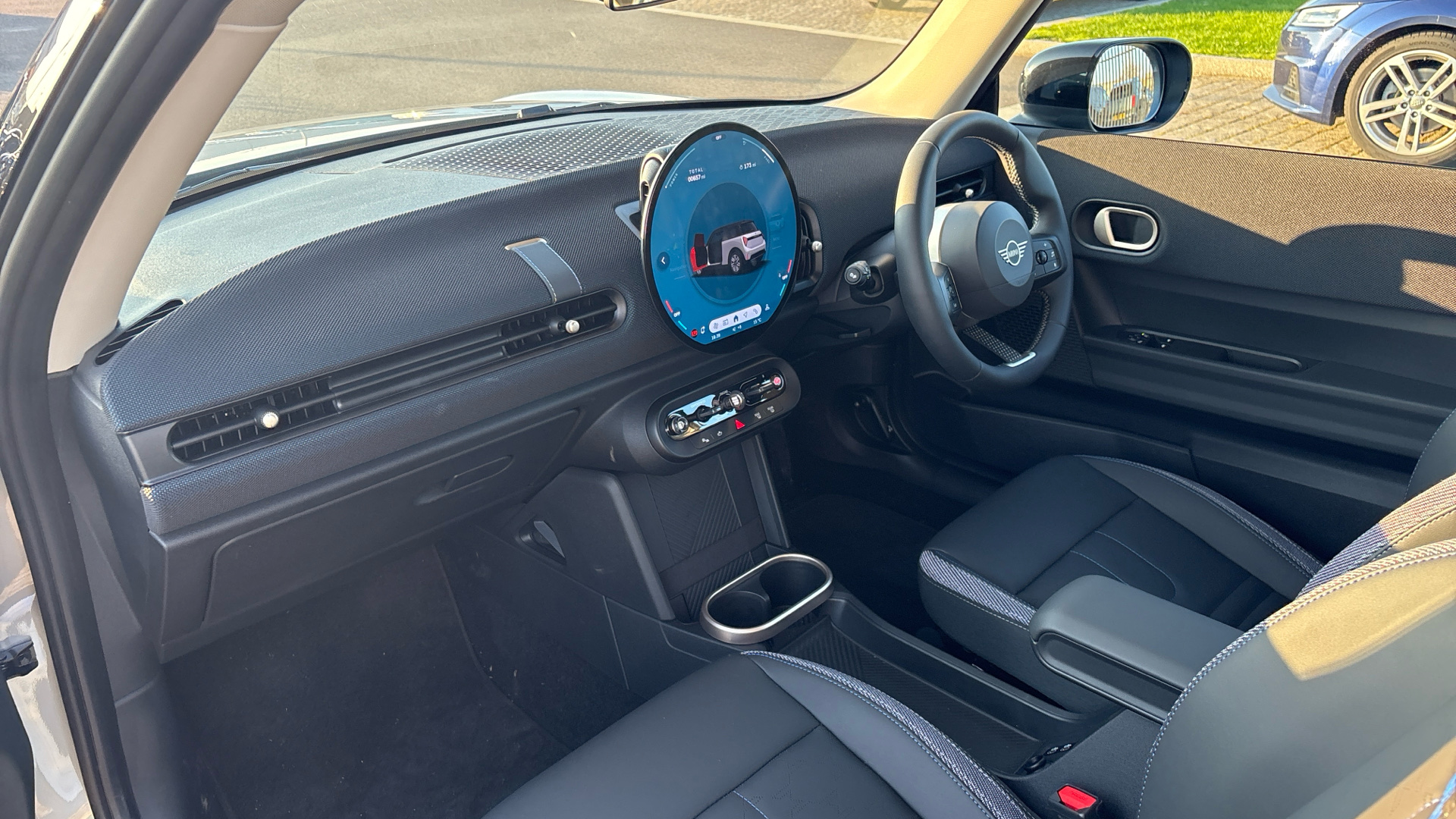 "Vescin/Cord combination JCW upholstery includes dash knit in black with red accents"