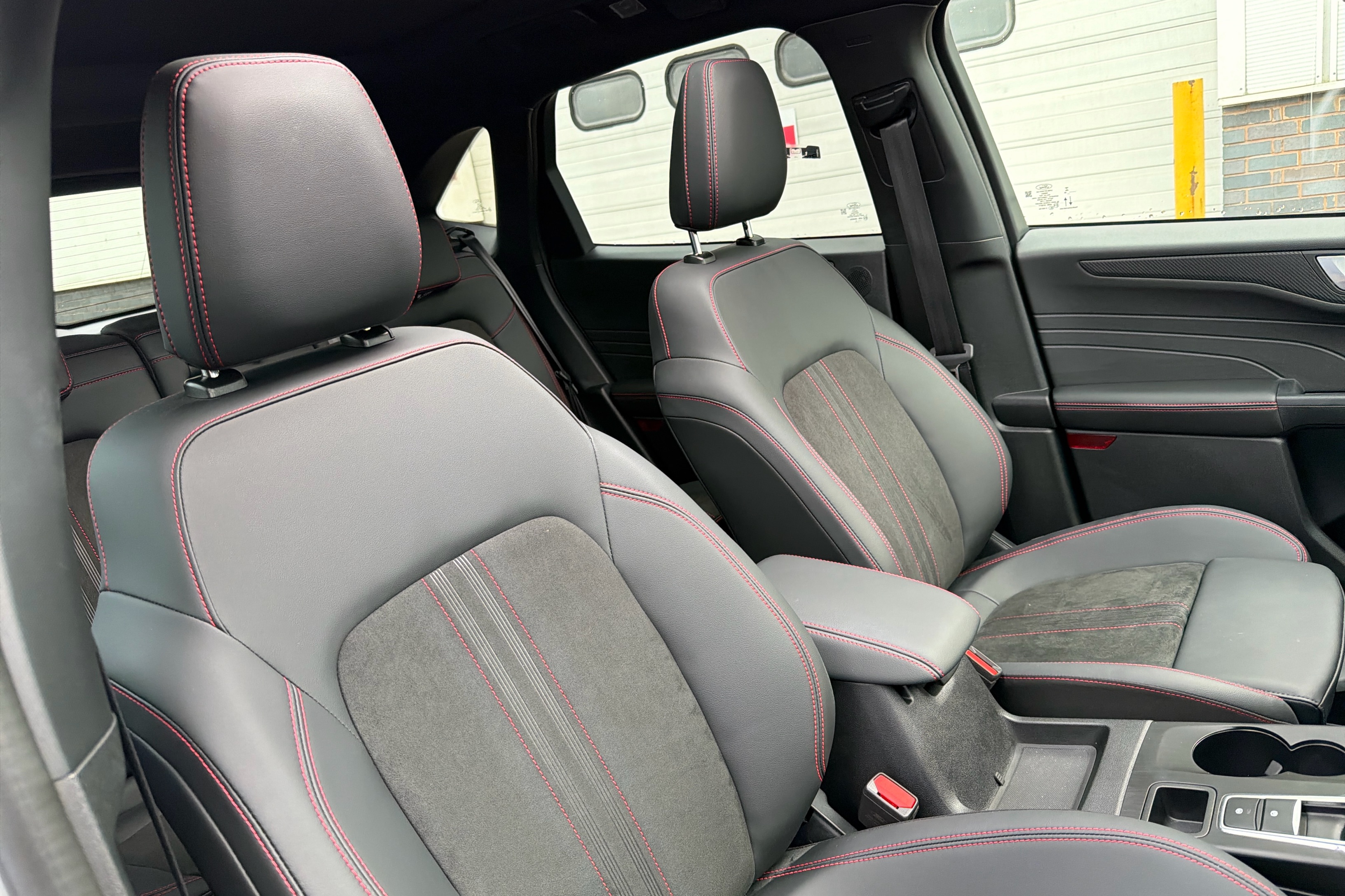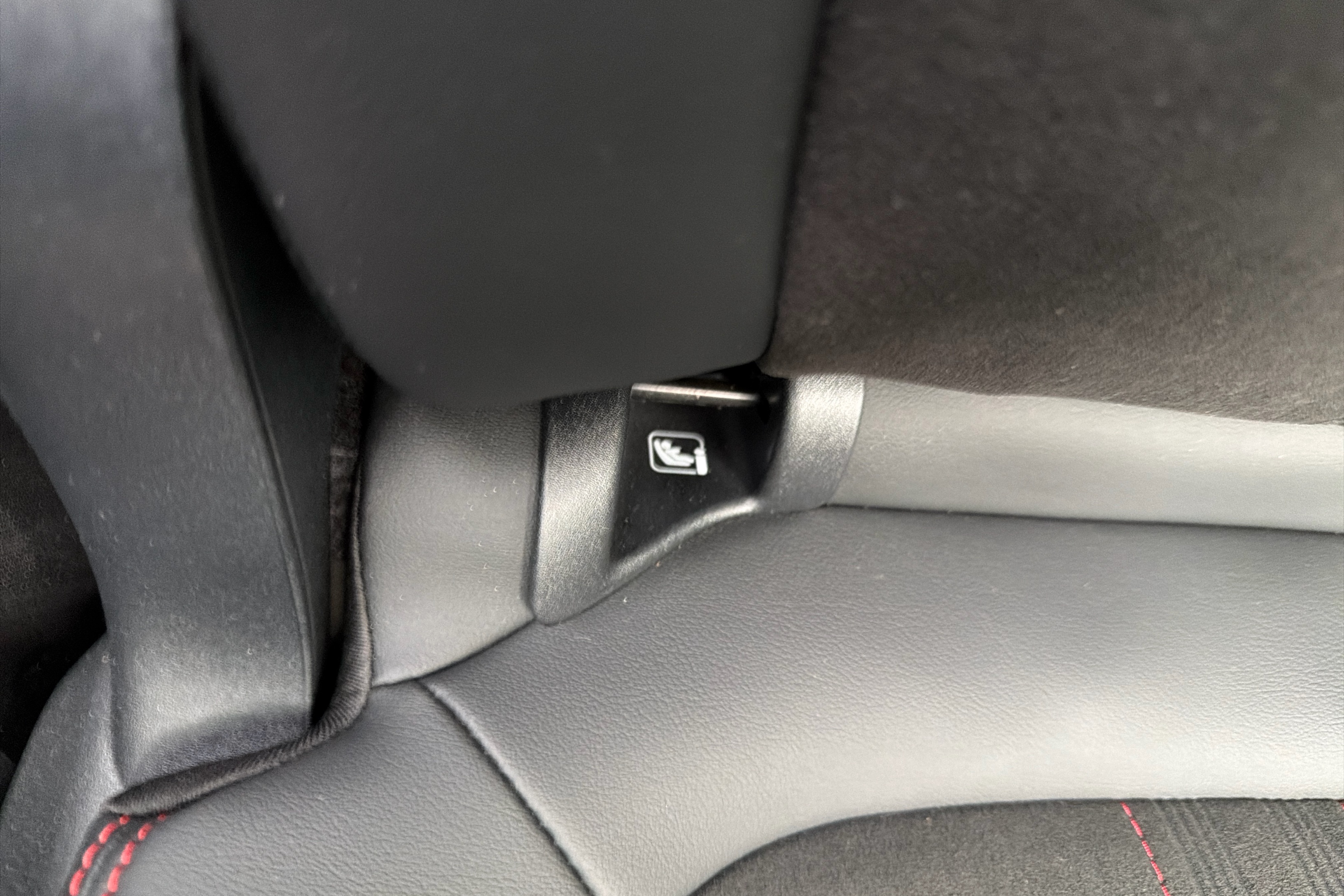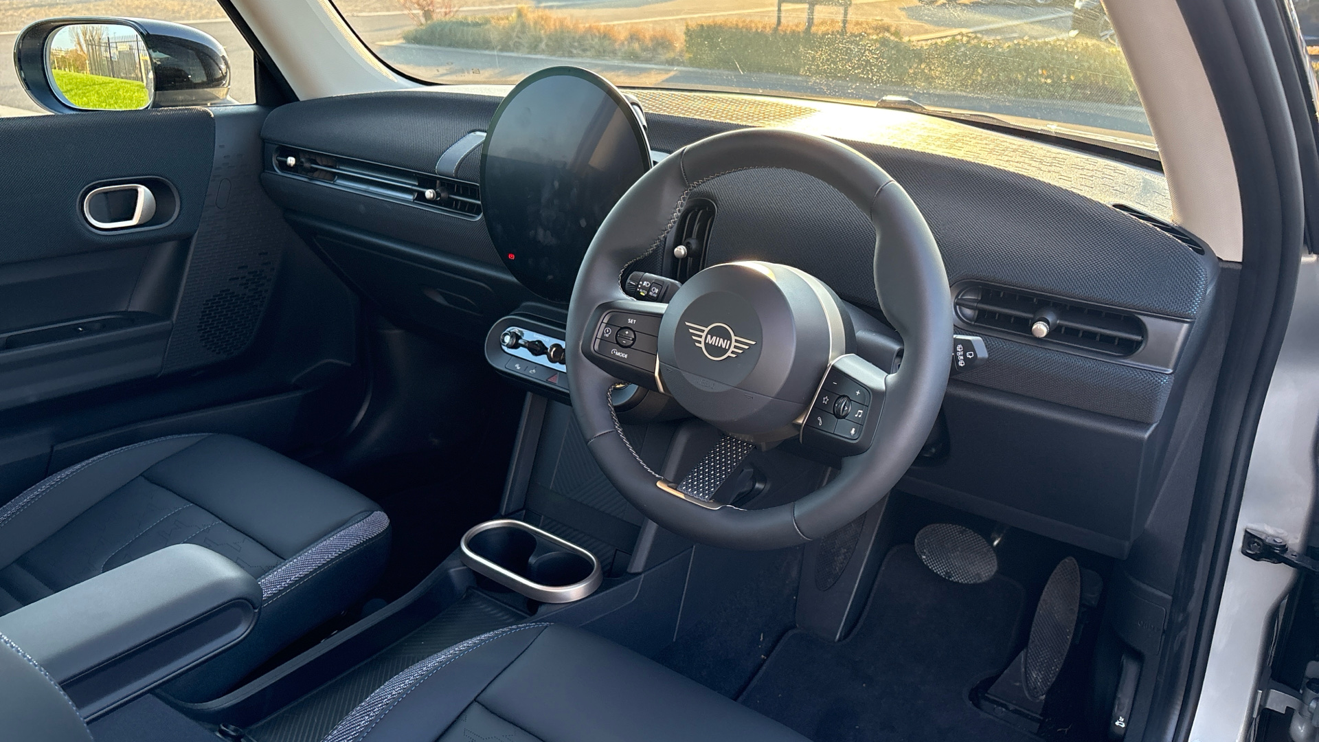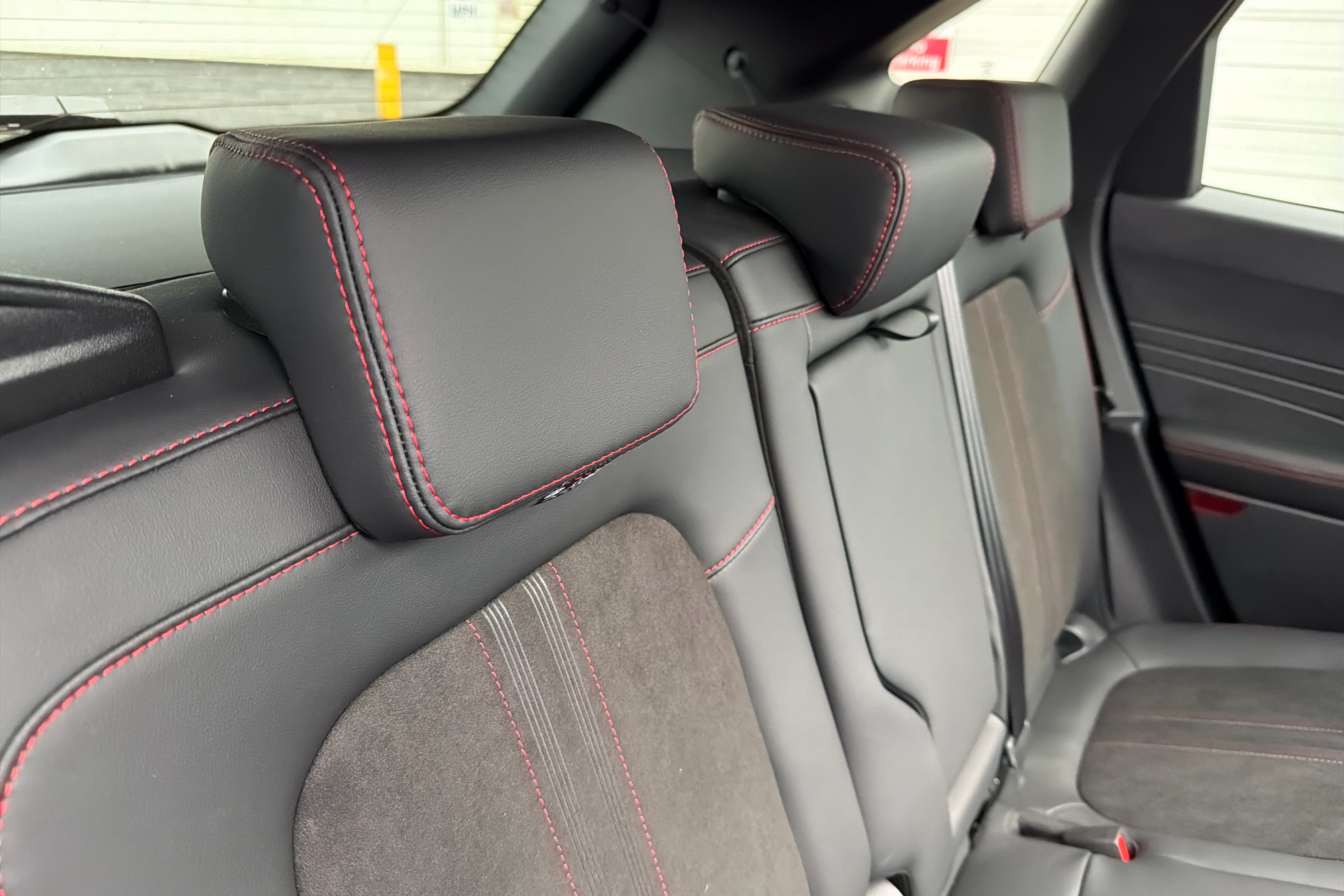 "Vescin/Cord combination JCW upholstery includes dash knit in black with red accents"