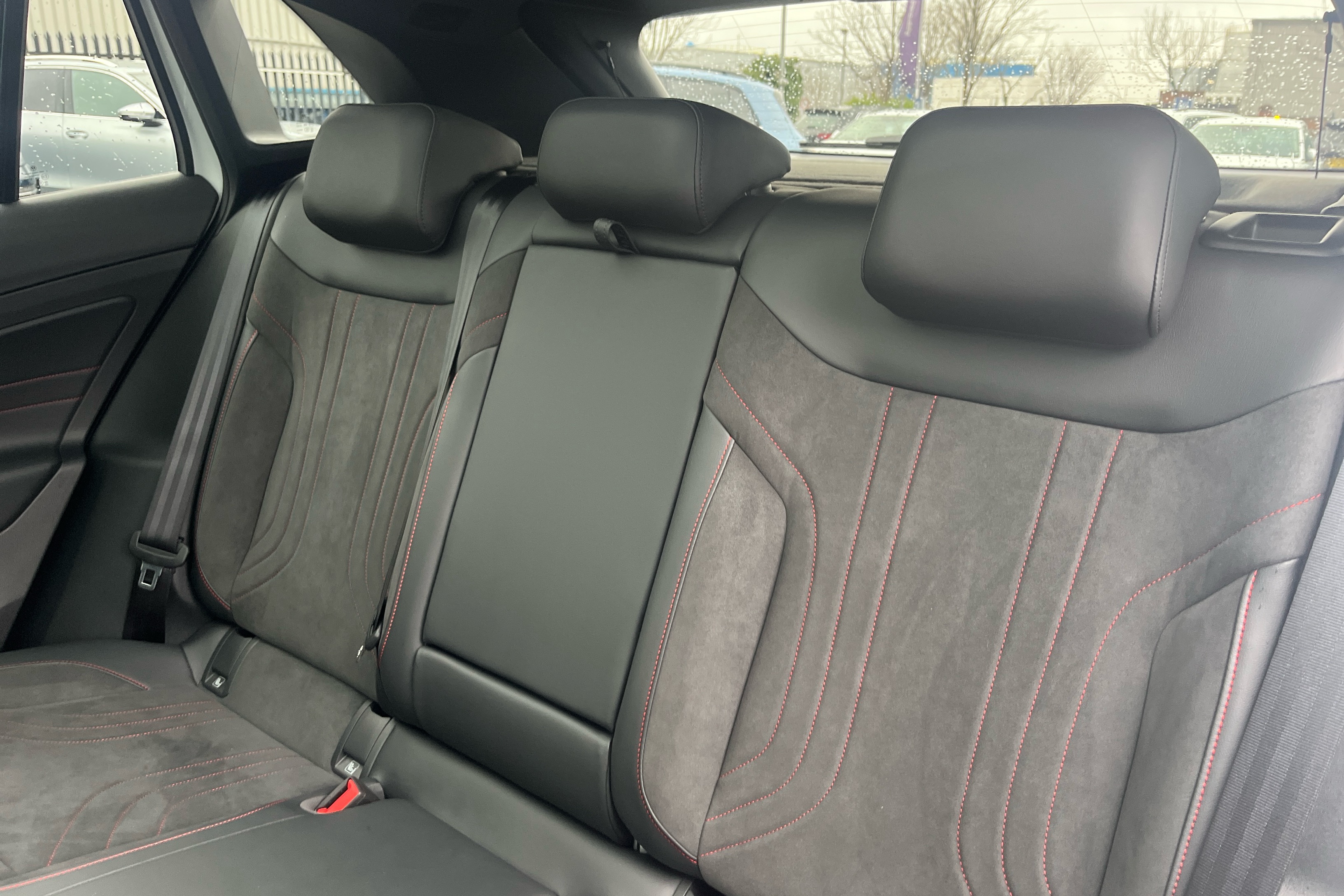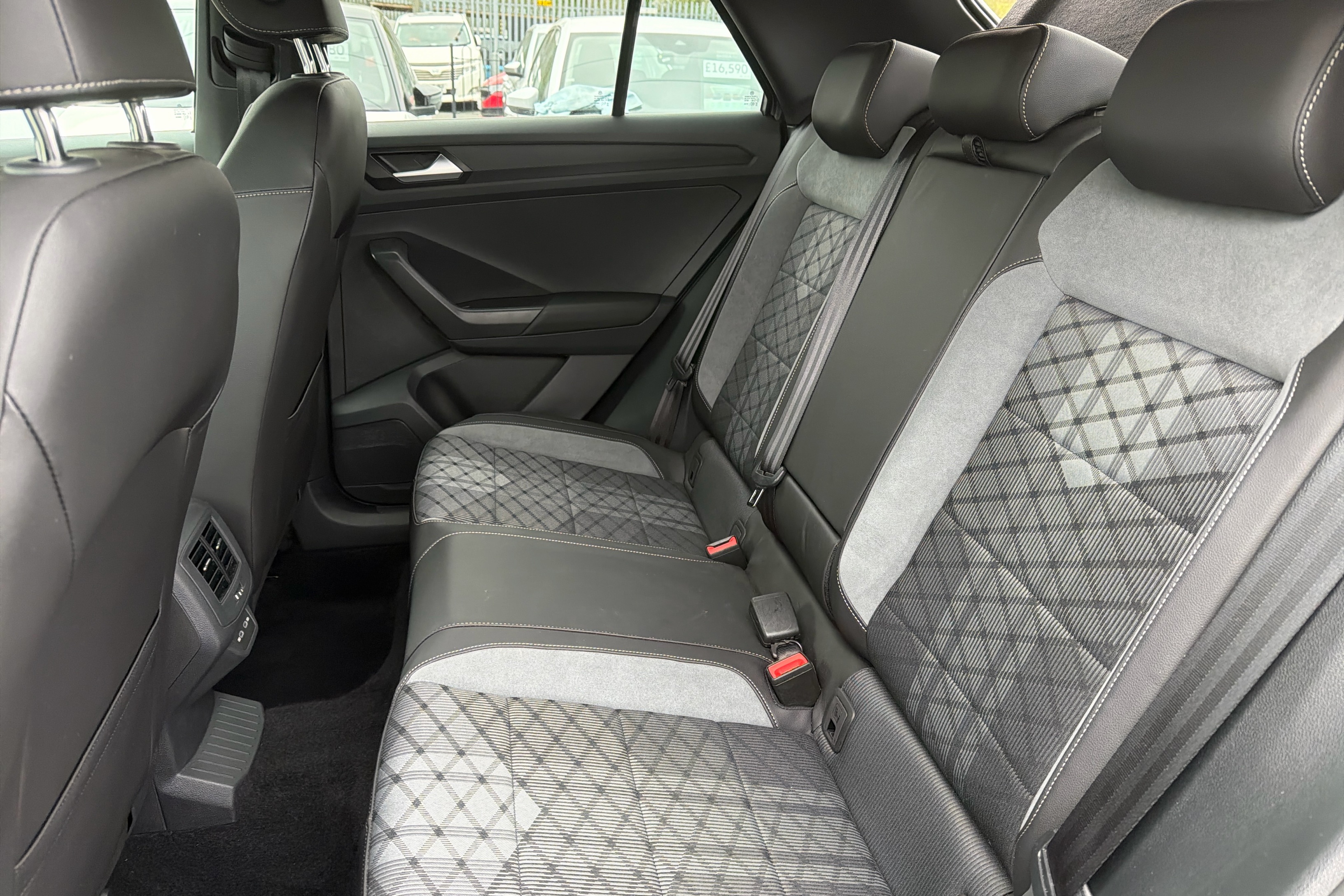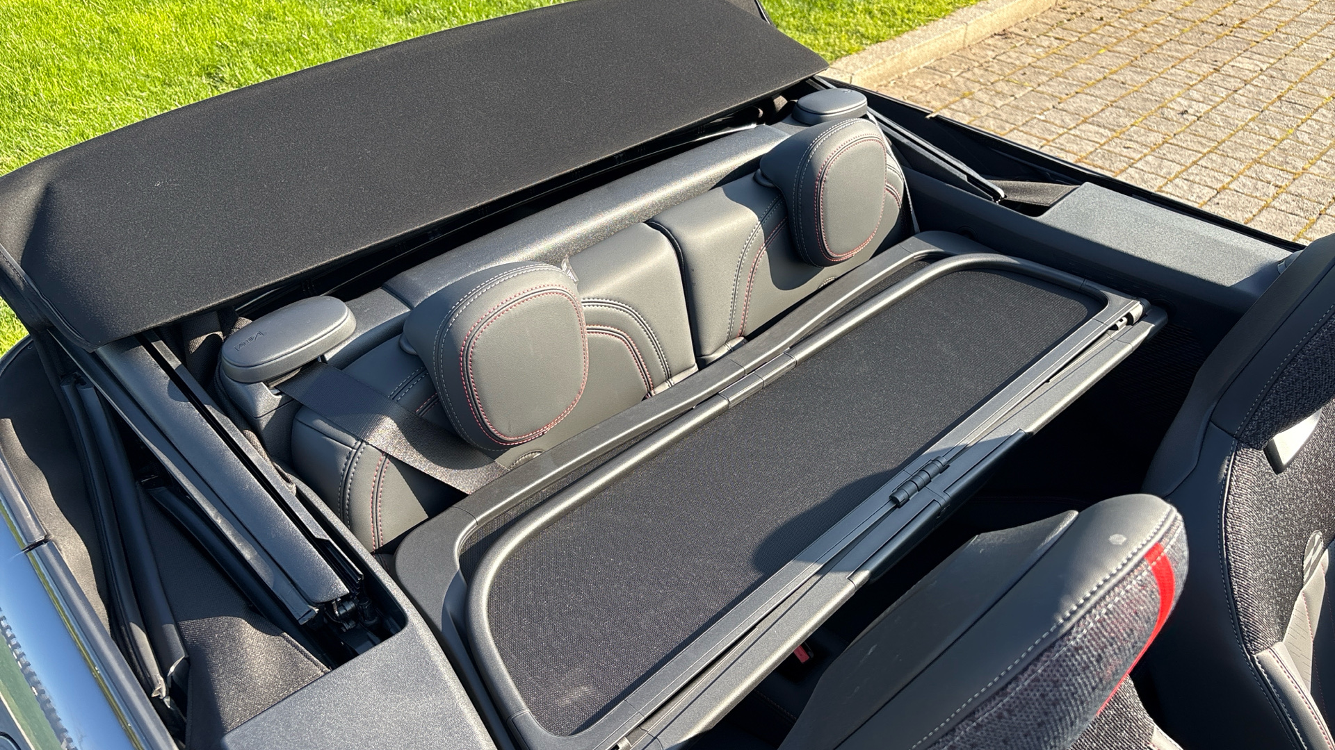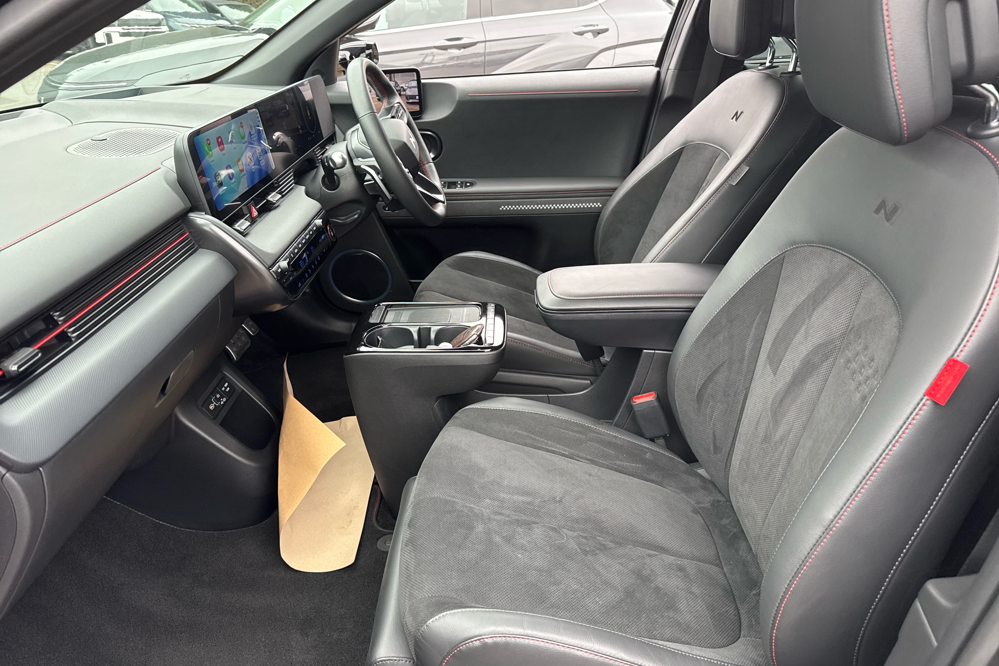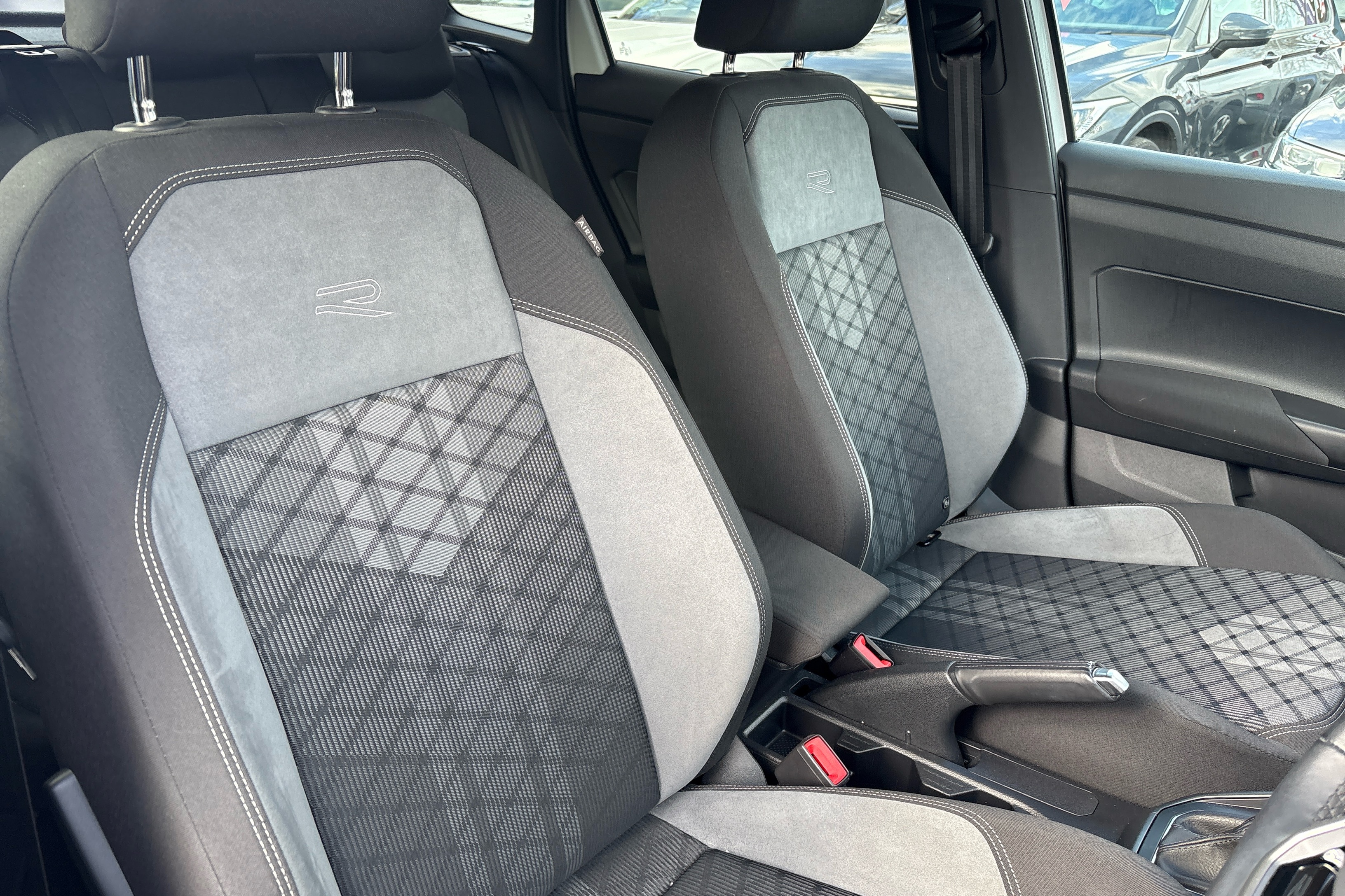 "Vescin/Cord combination JCW upholstery includes dash knit in black with red accents"