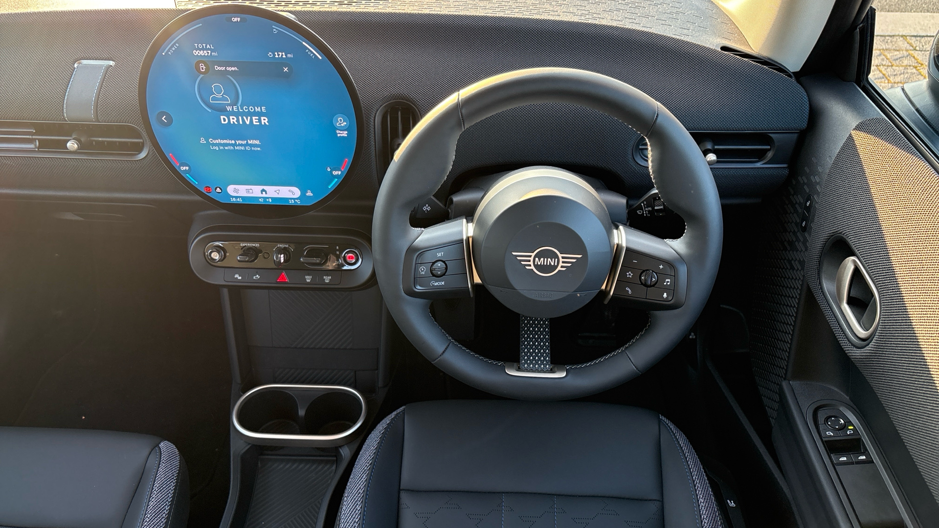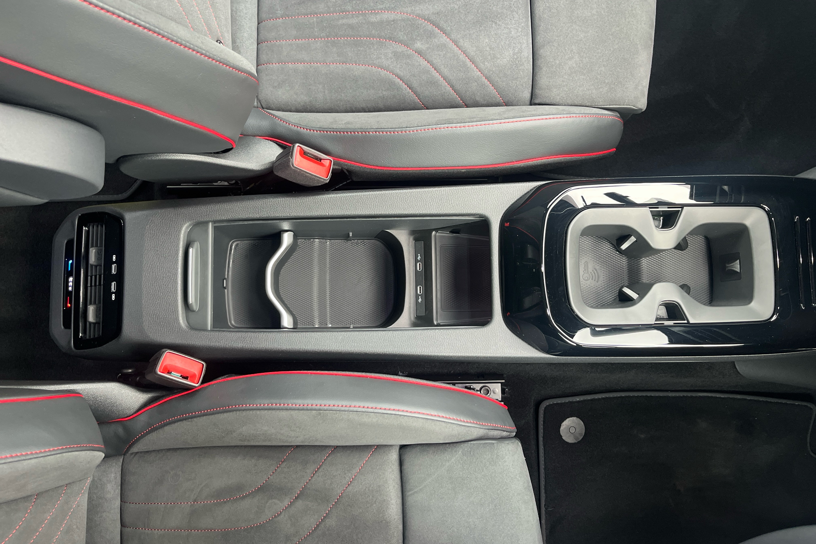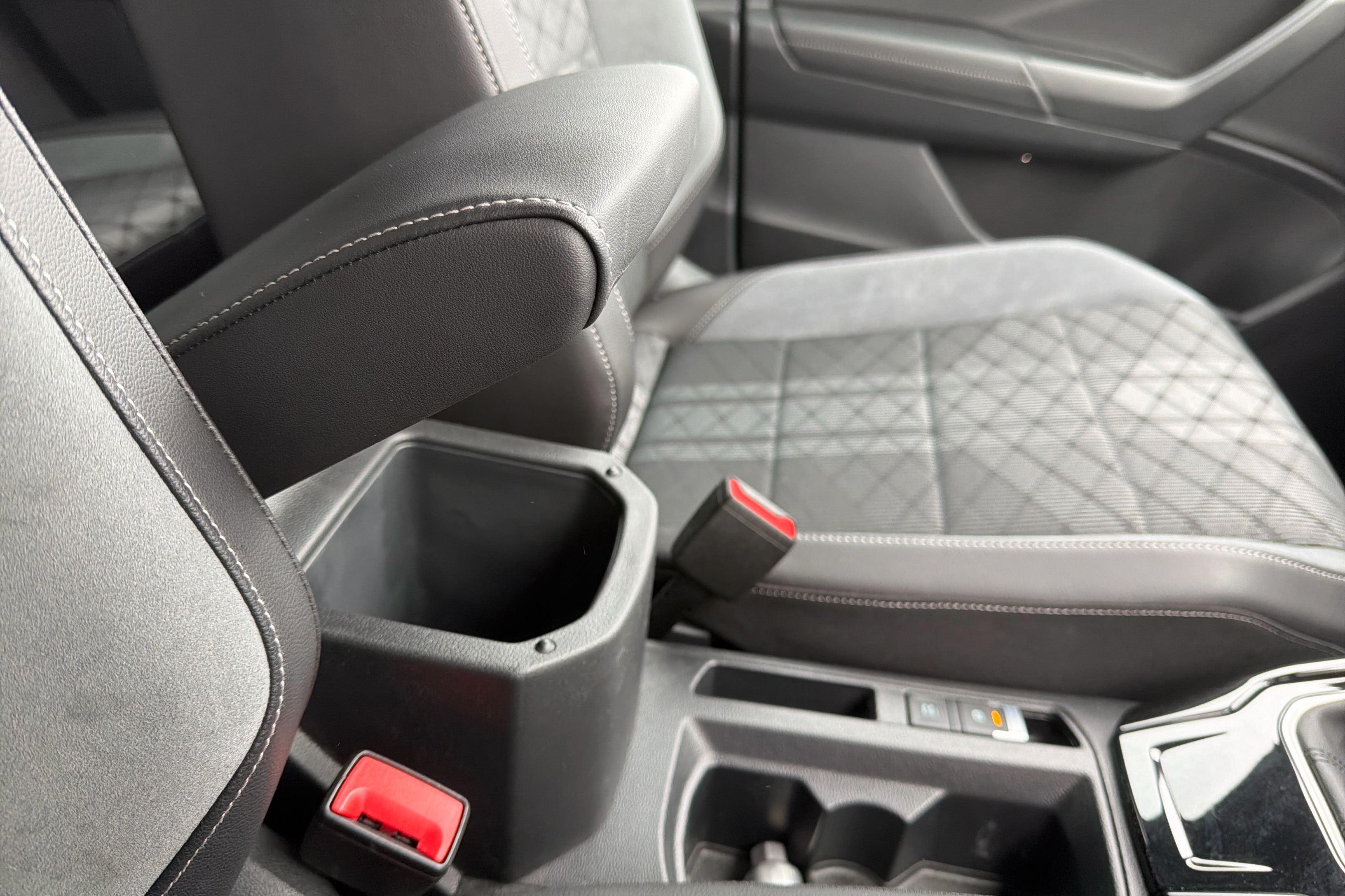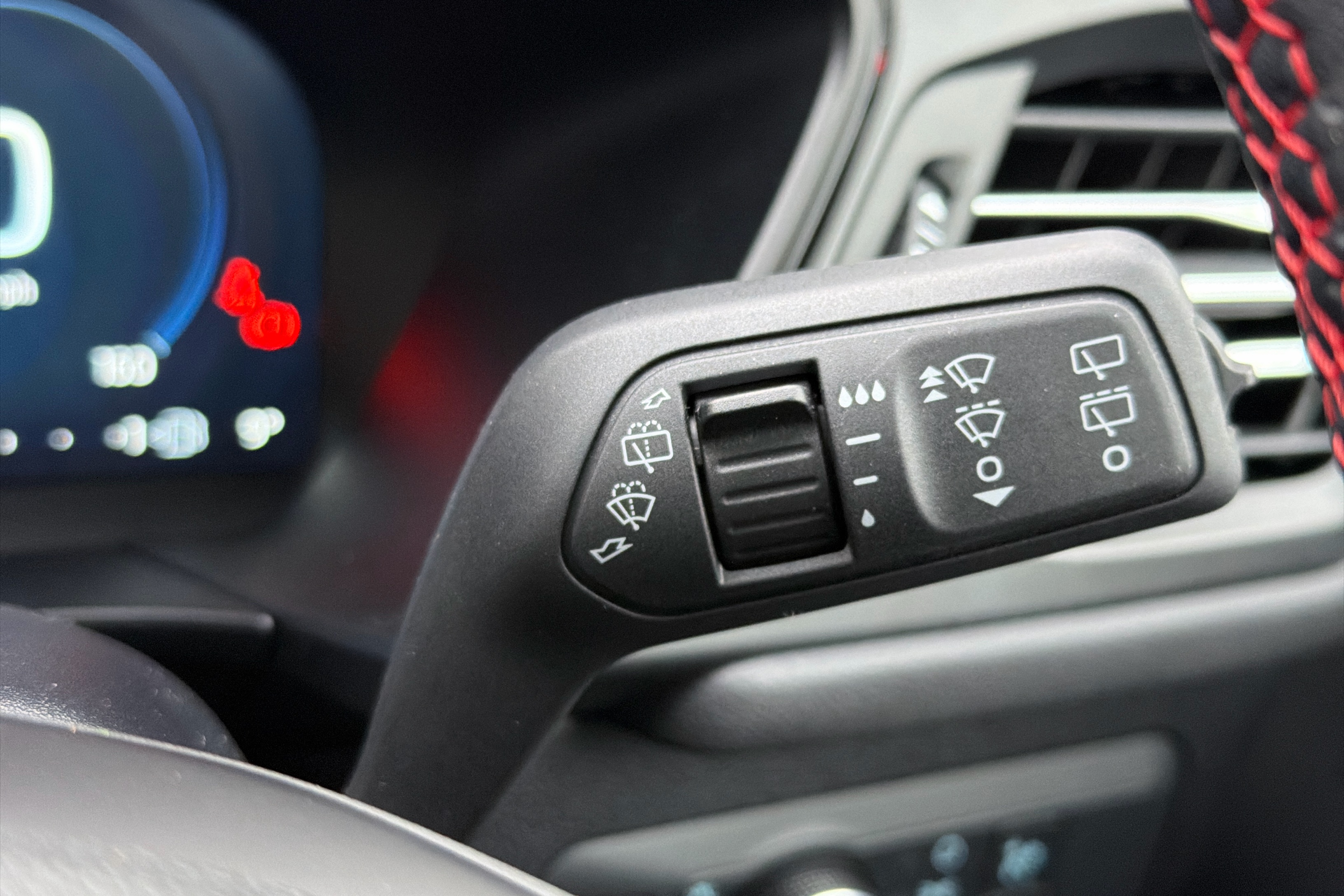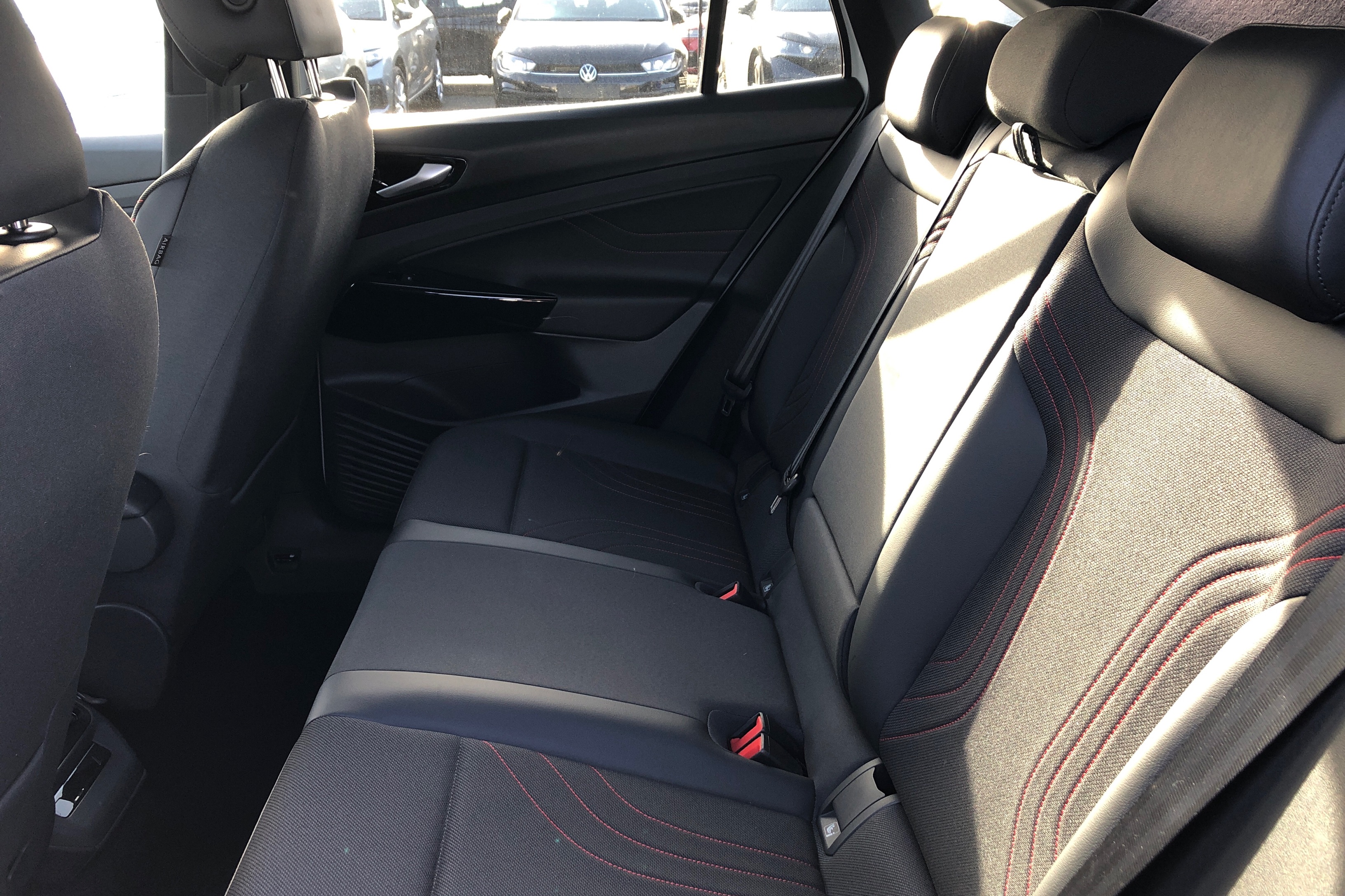 "Vescin/Cord combination JCW upholstery includes dash knit in black with red accents"