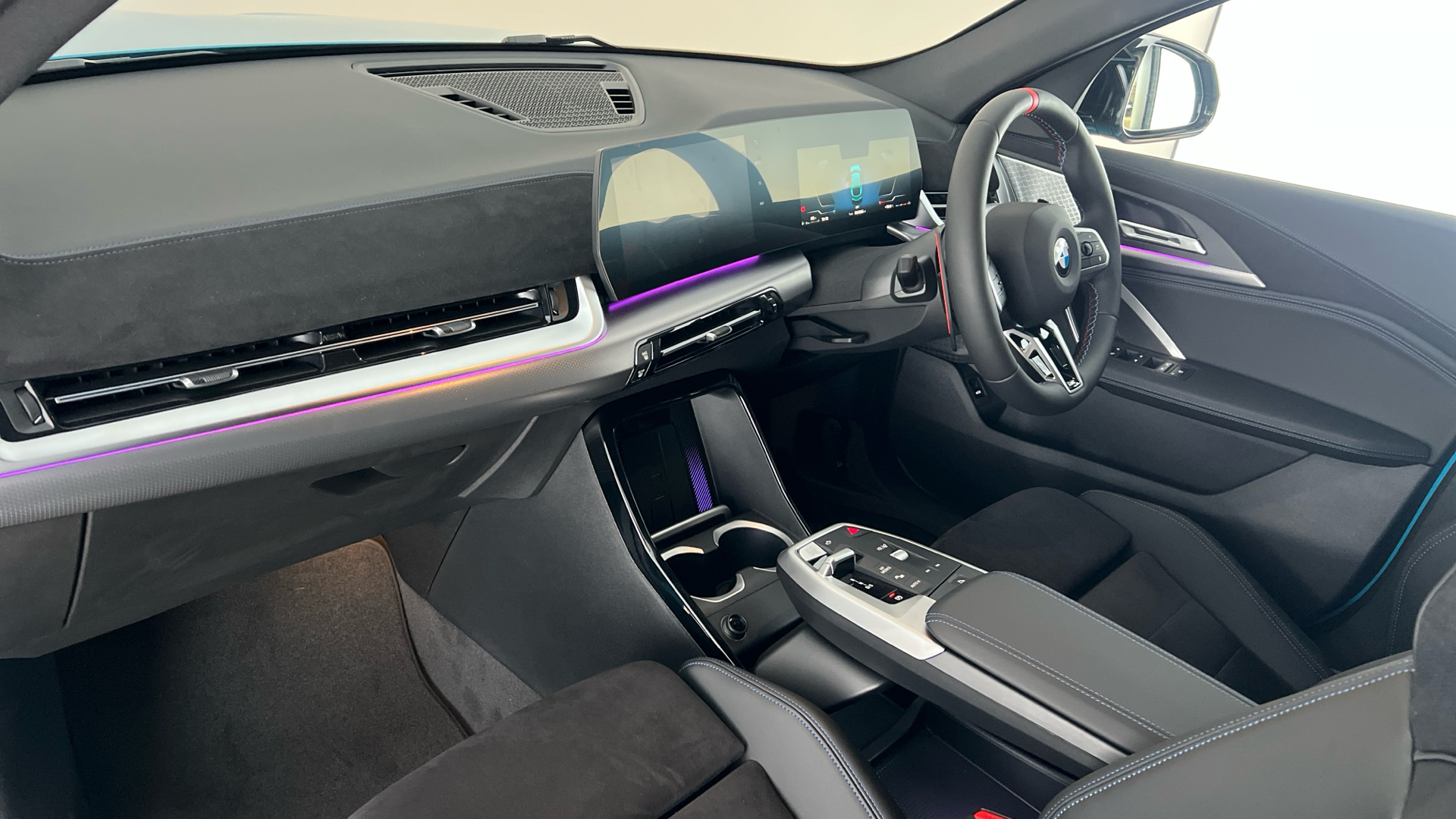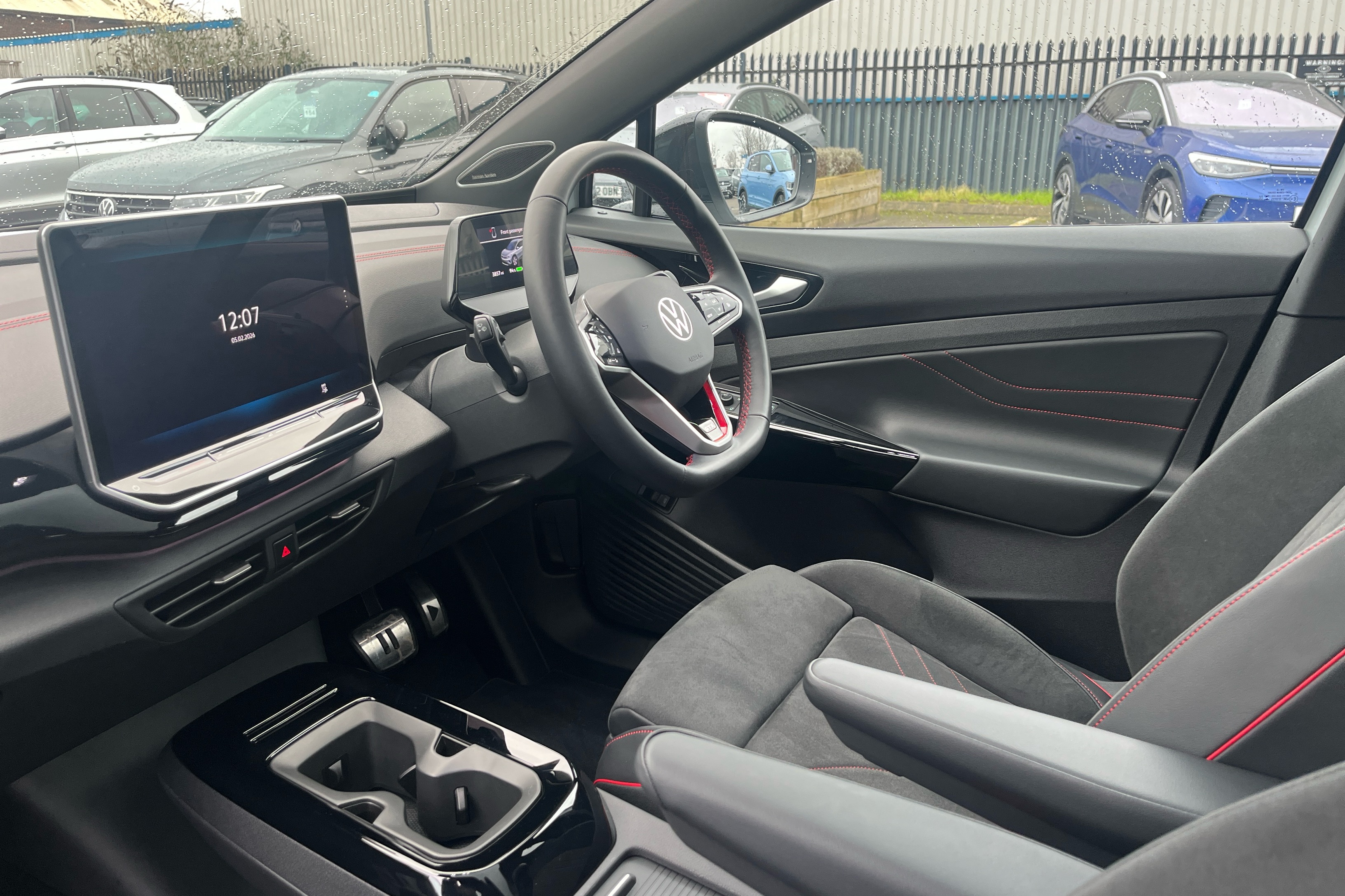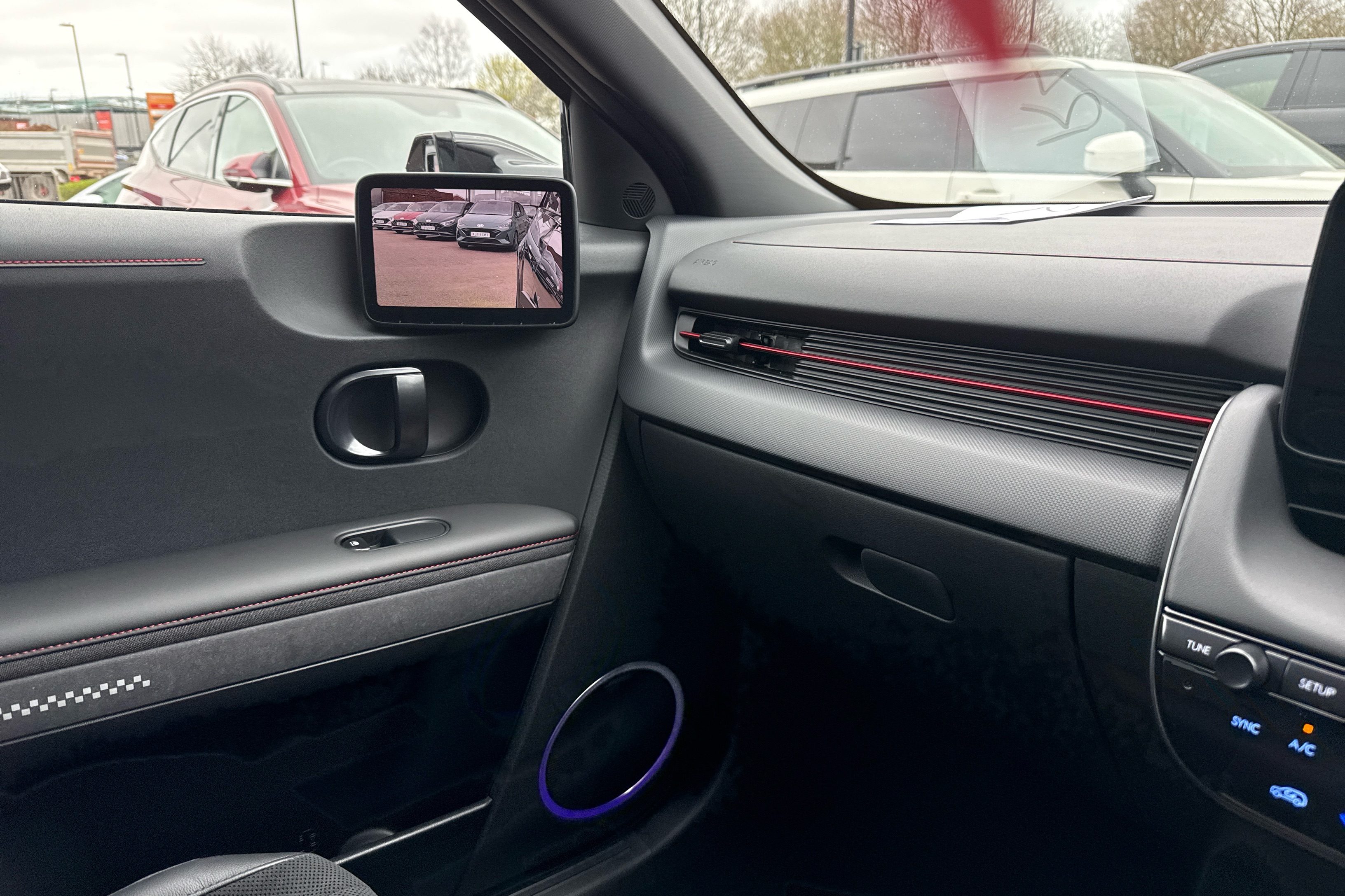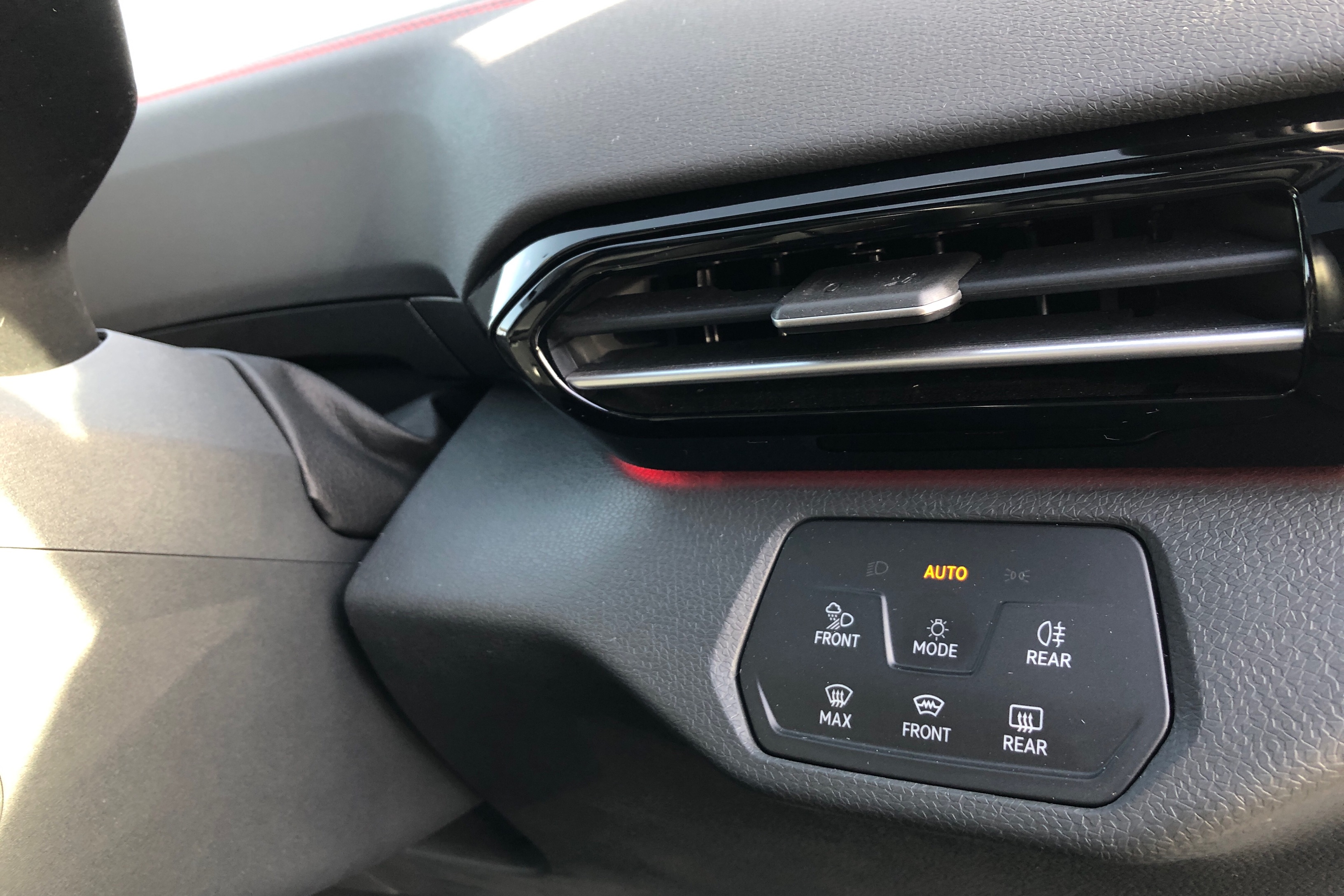 "Vescin/Cord combination JCW upholstery includes dash knit in black with red accents"