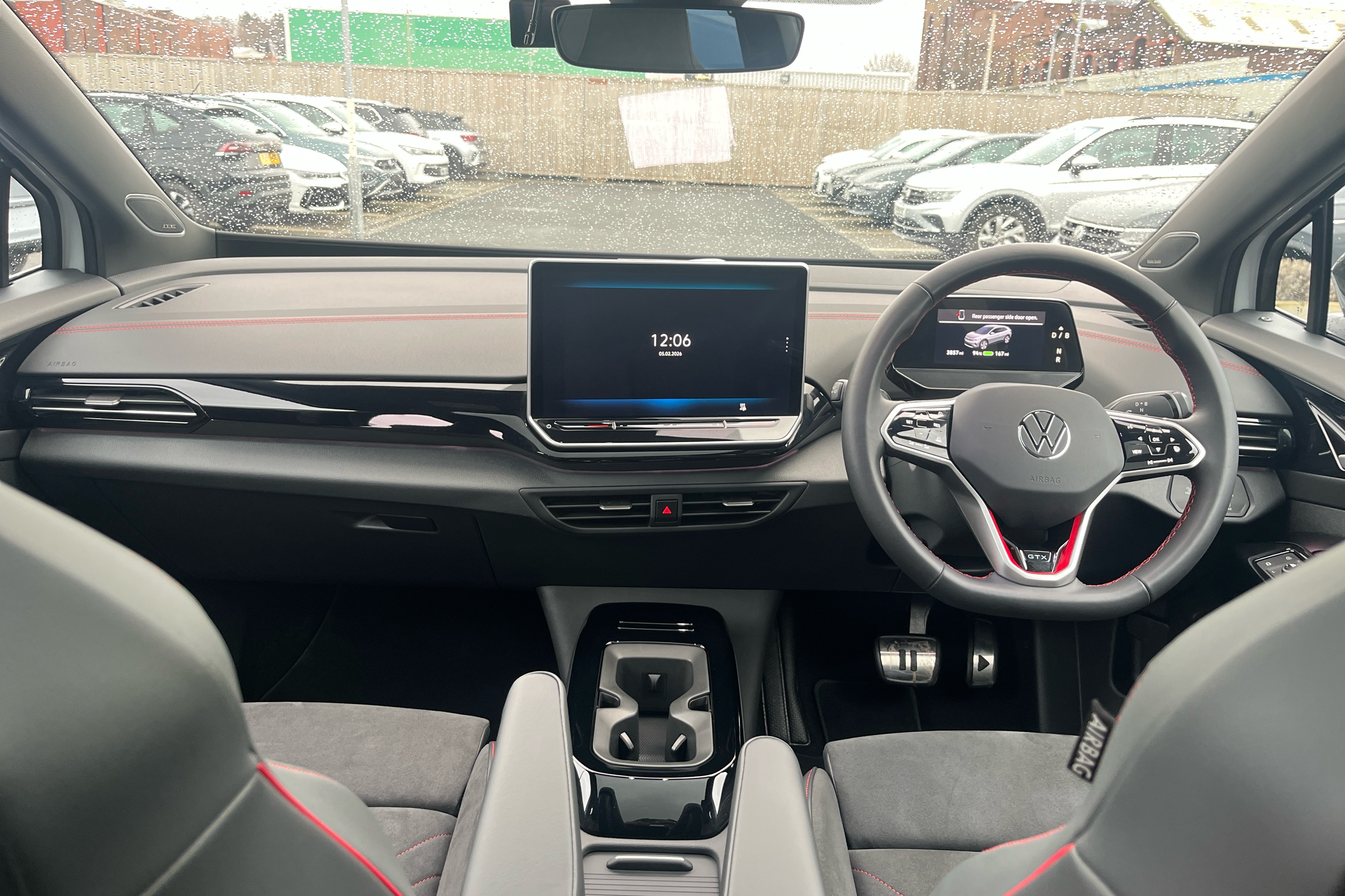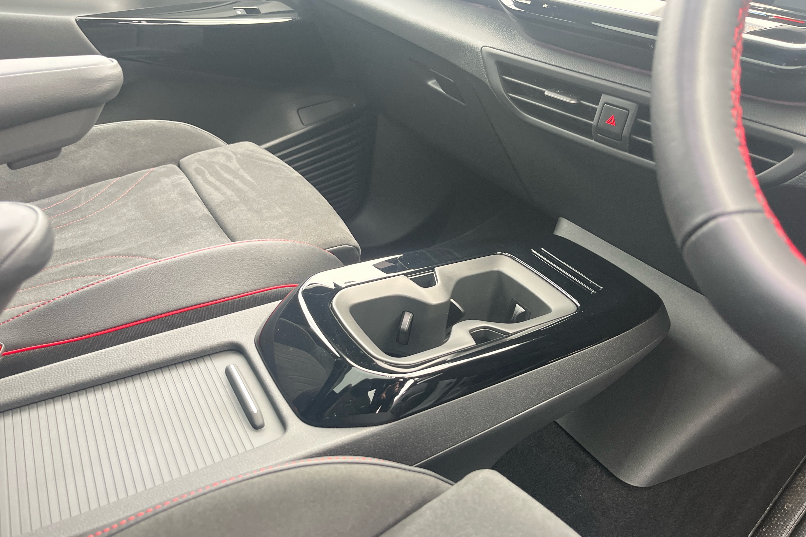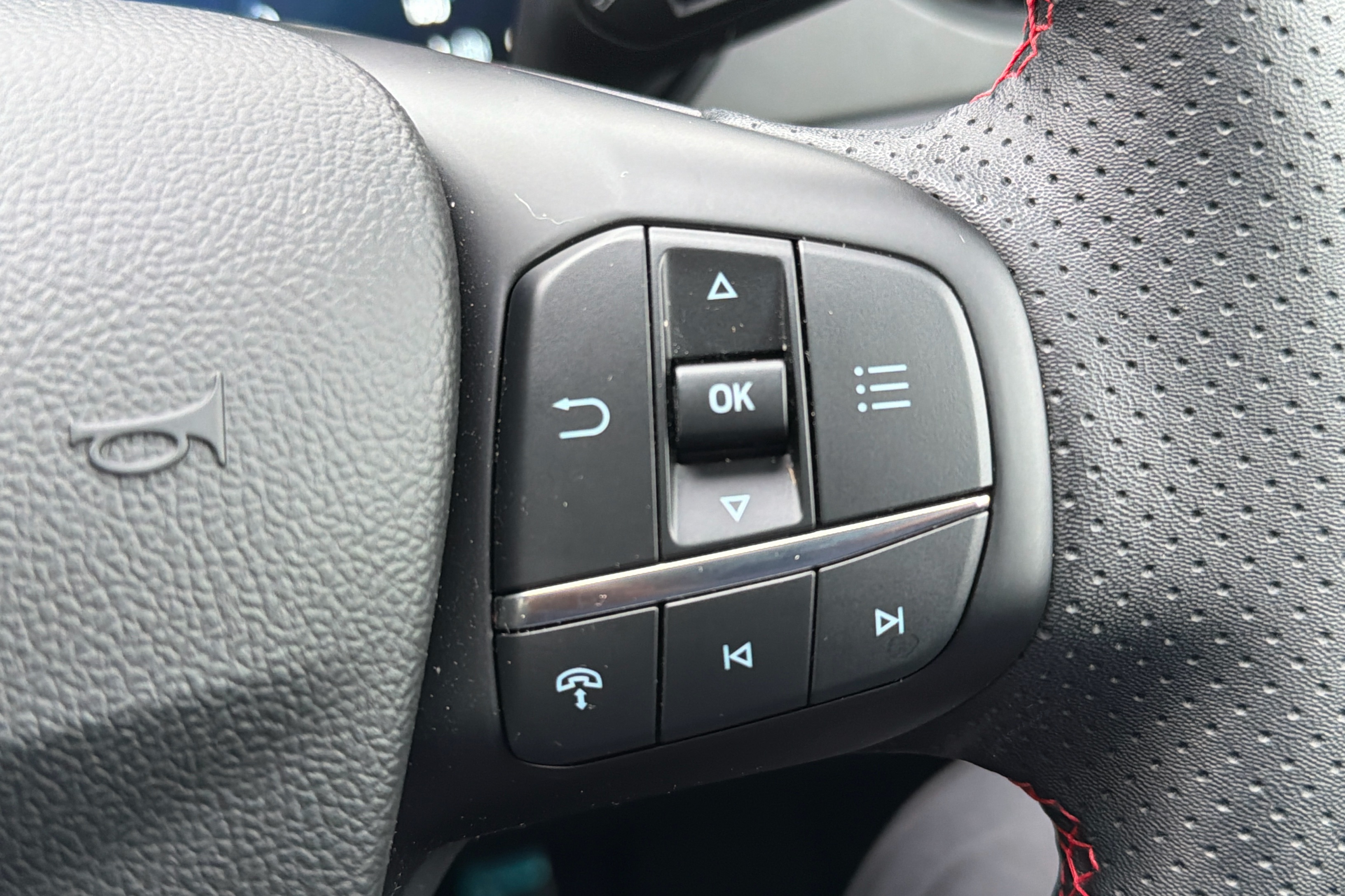 "Partially perforated vescin steering wheel with red accent, black/red decorative strap",