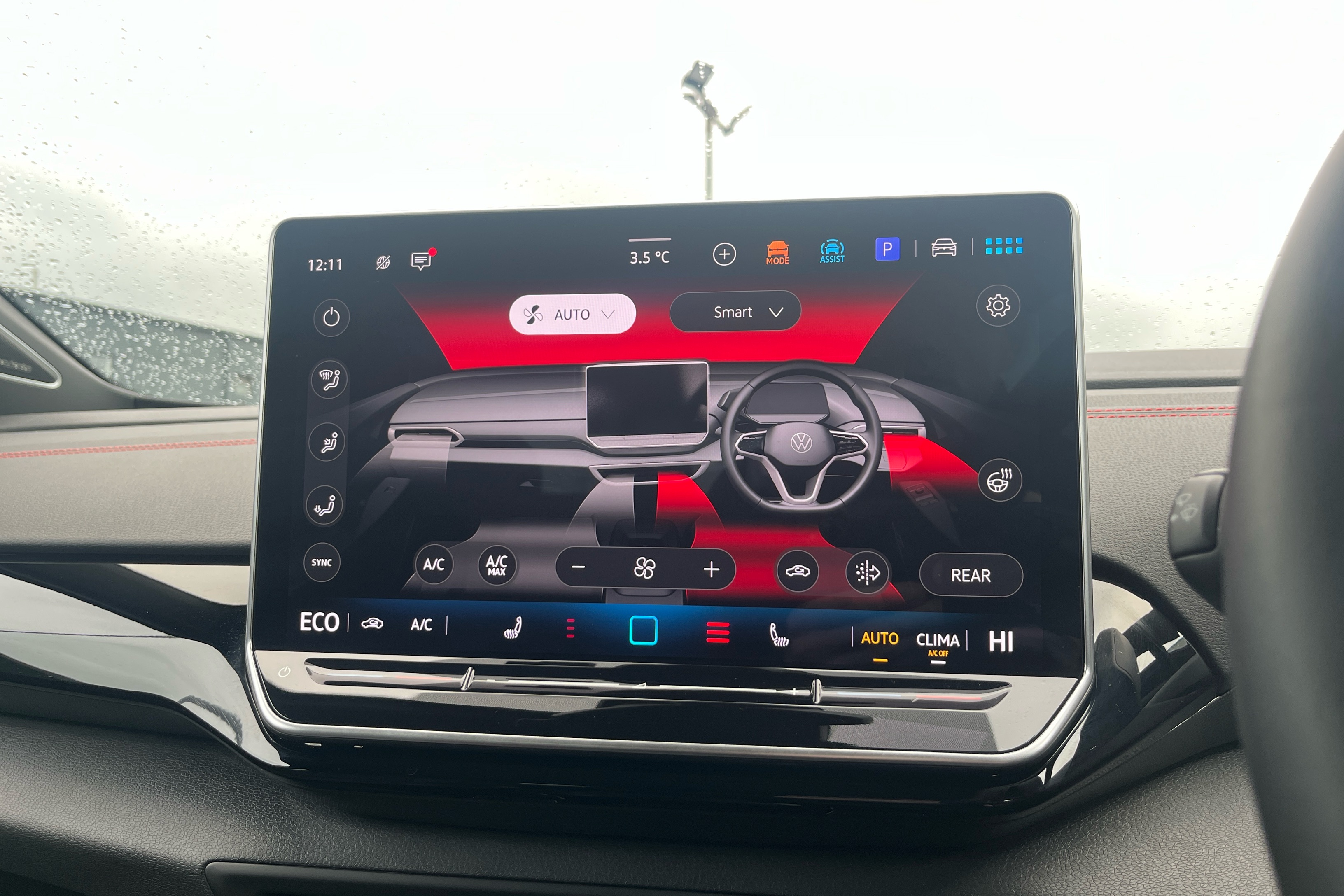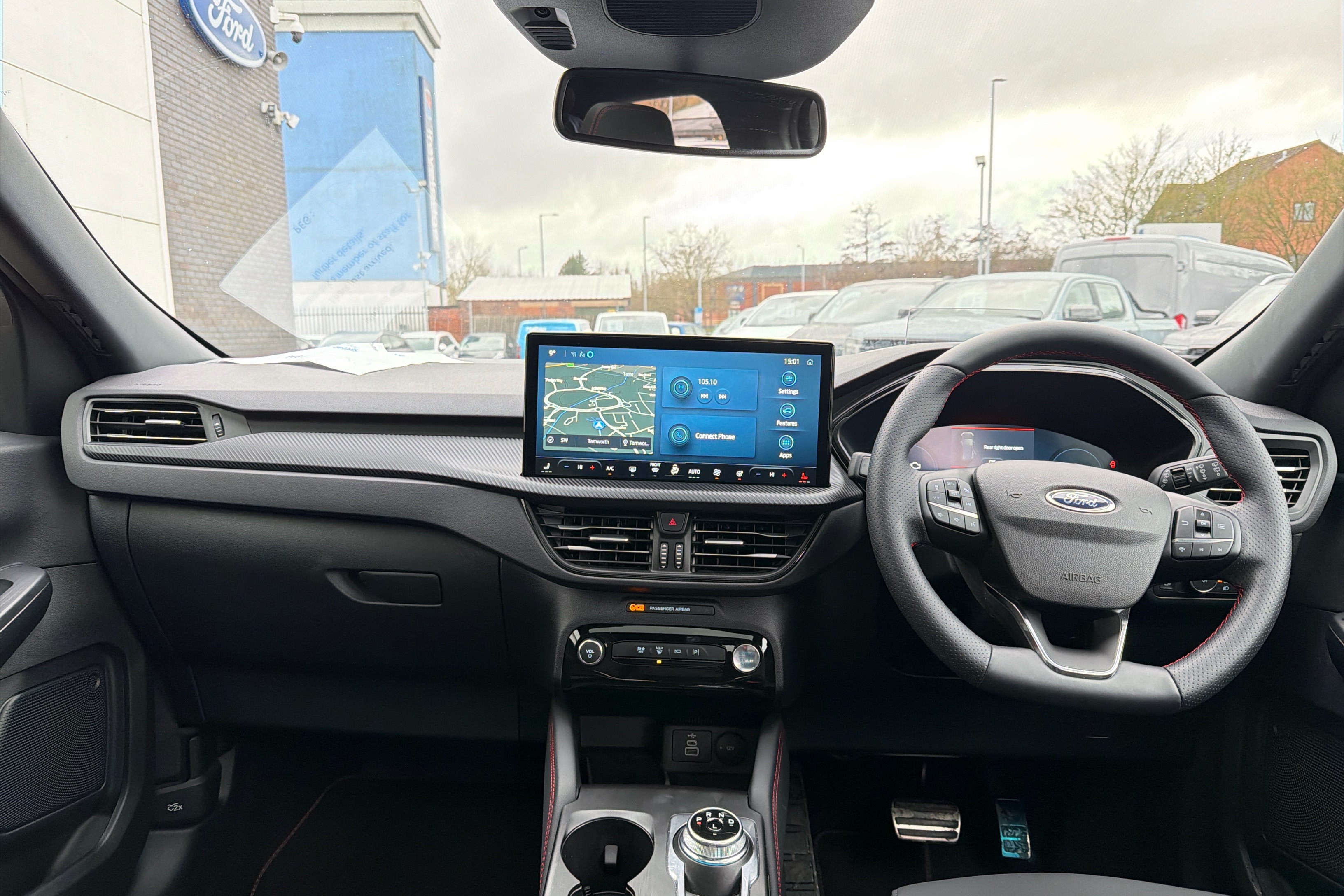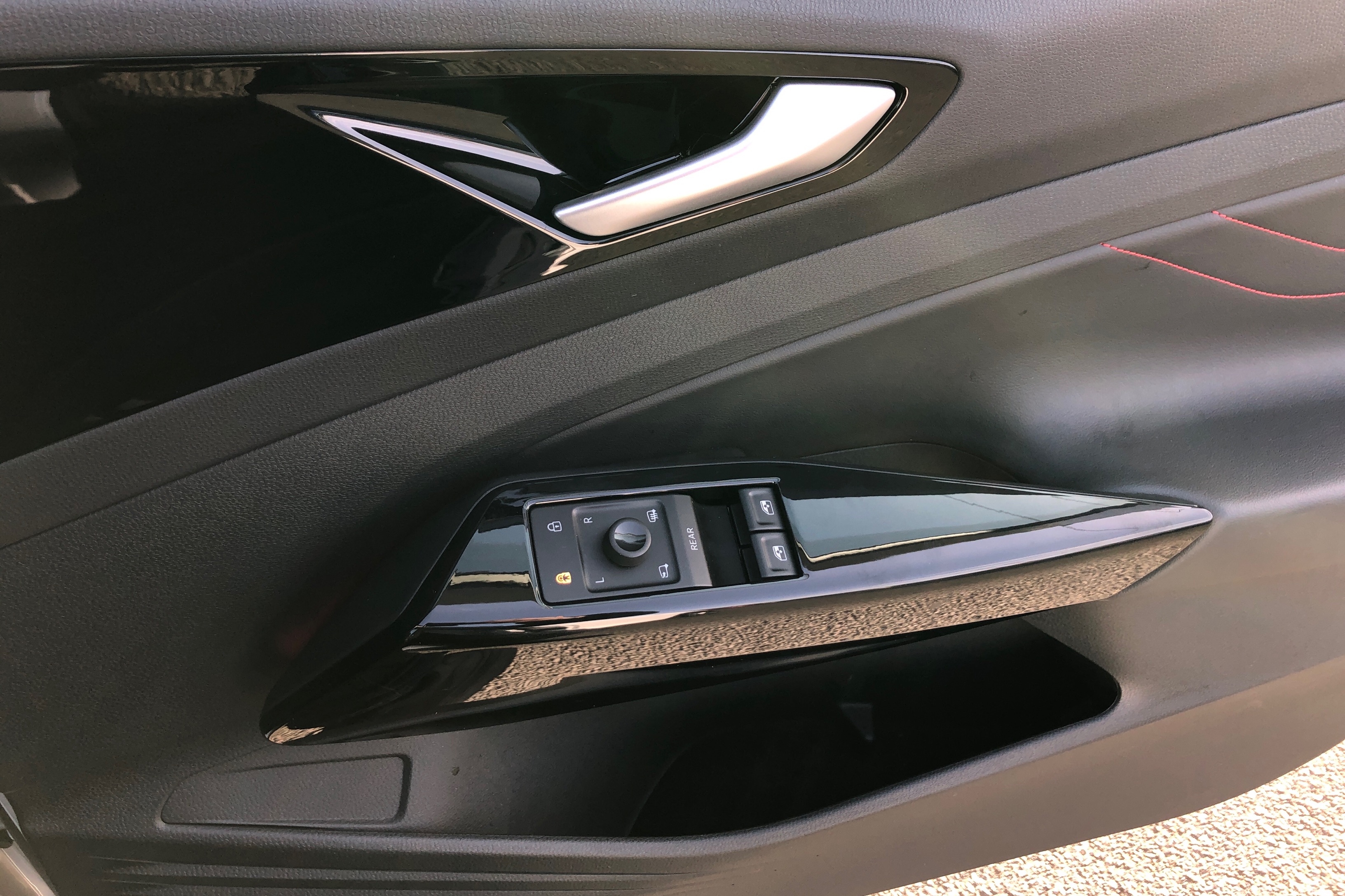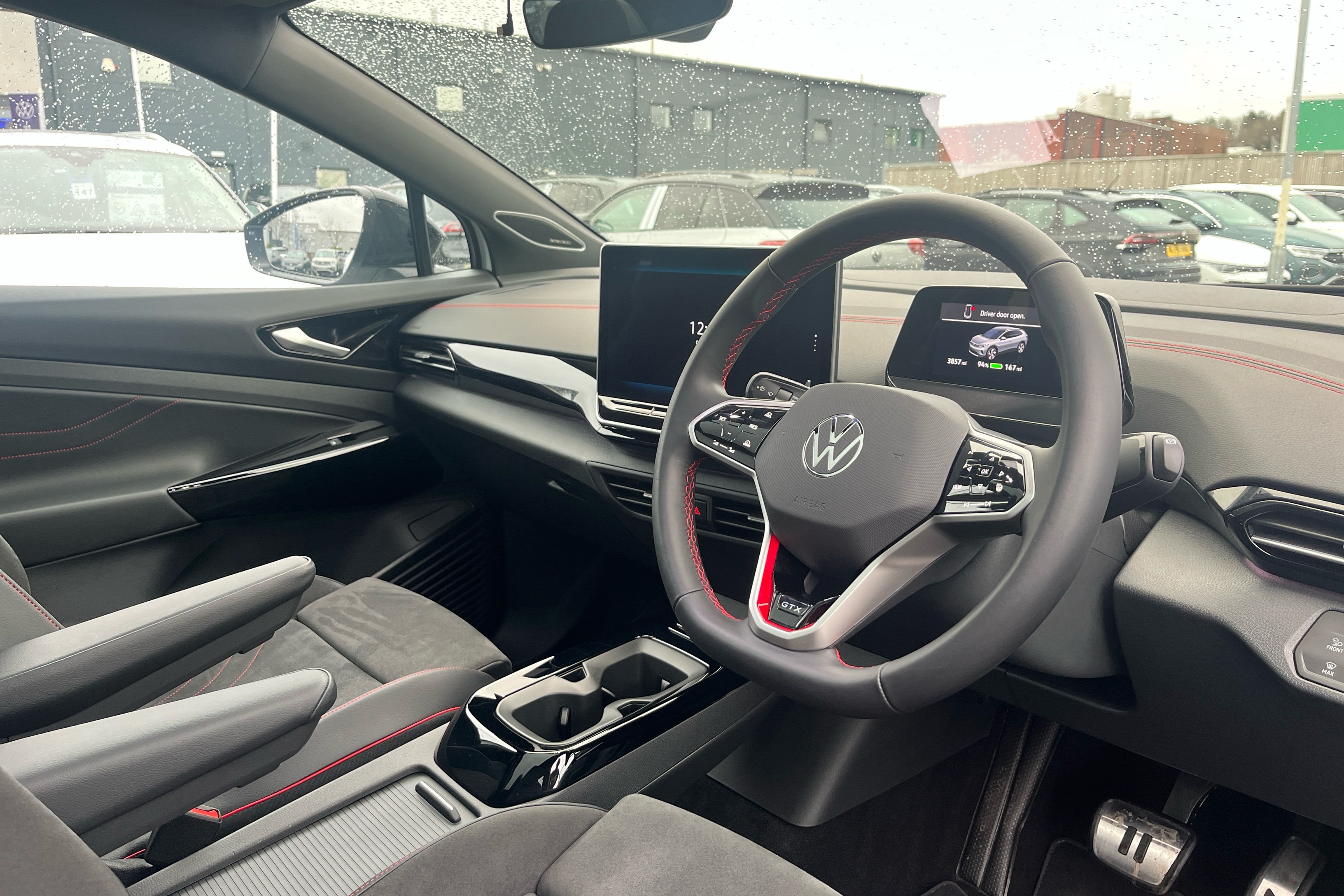 "Partially perforated vescin steering wheel with red accent, black/red decorative strap",