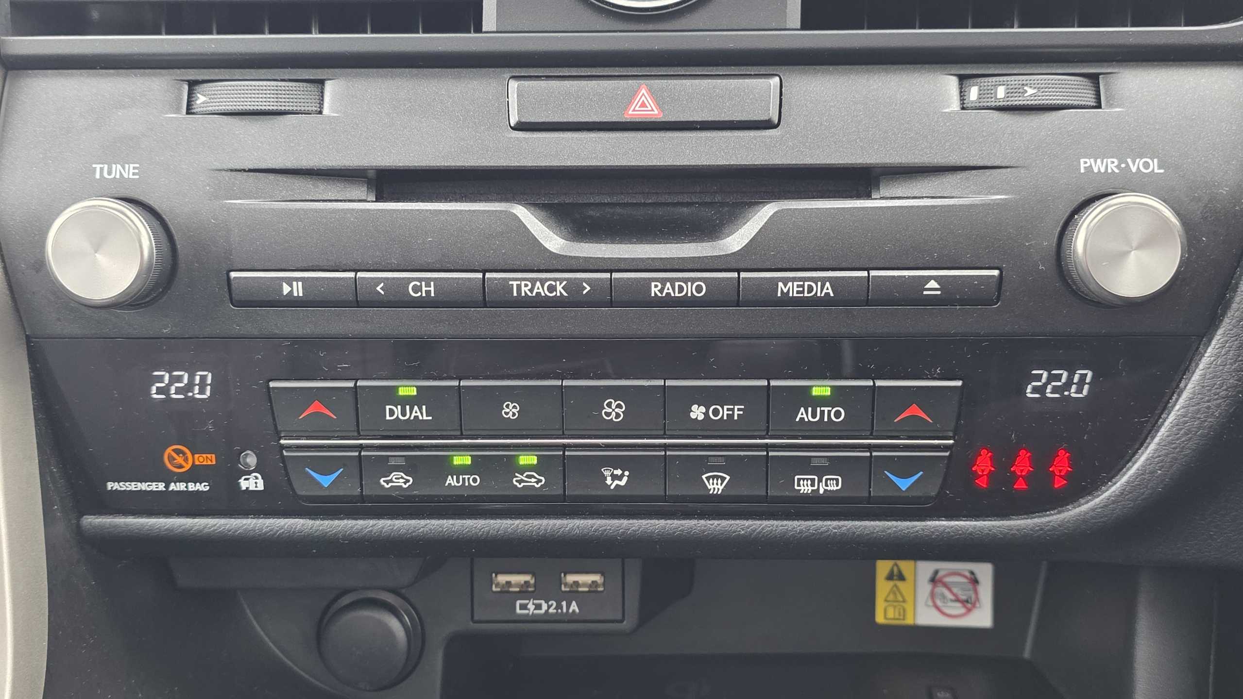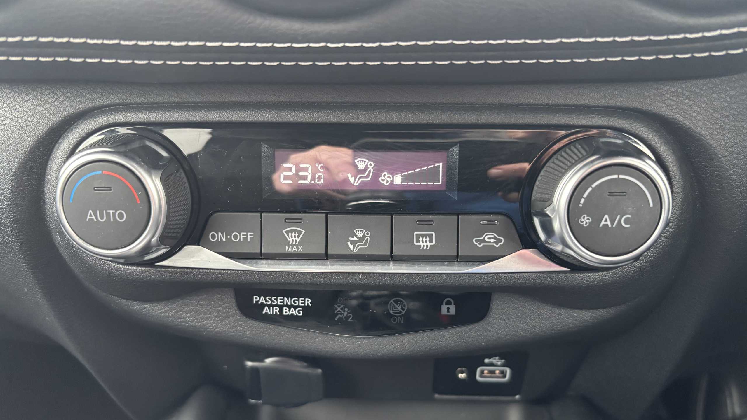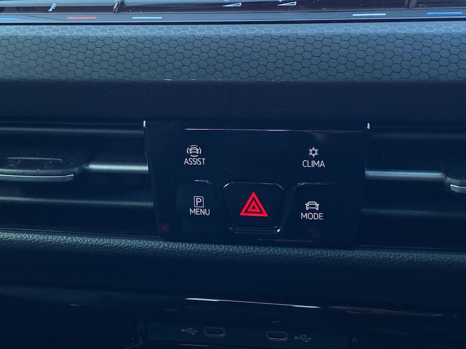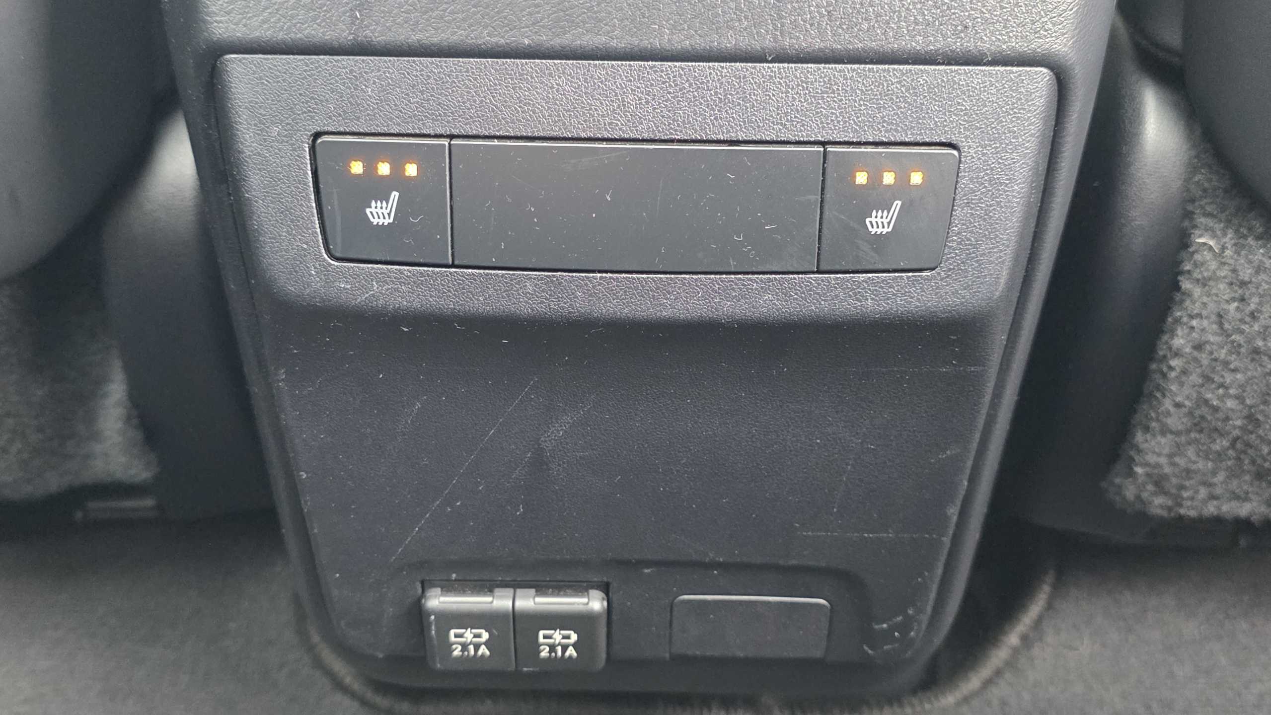 "Illuminated USB charging ports in lower dashboard area",