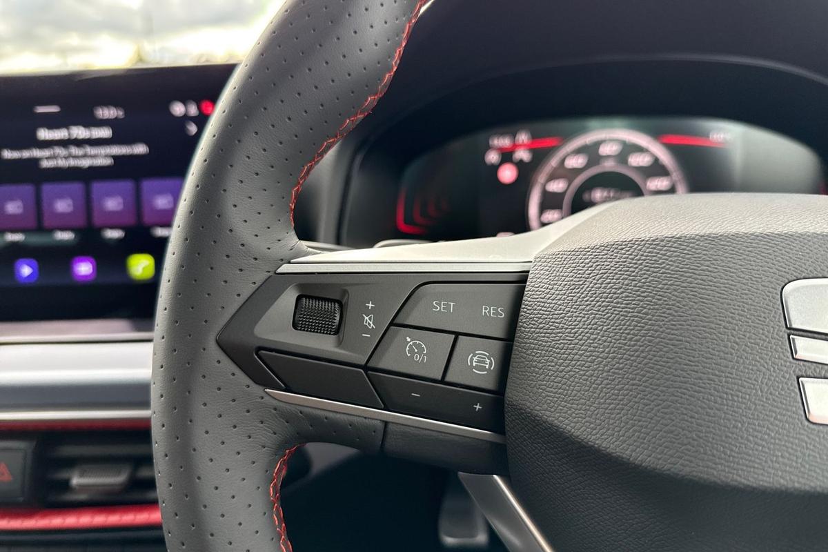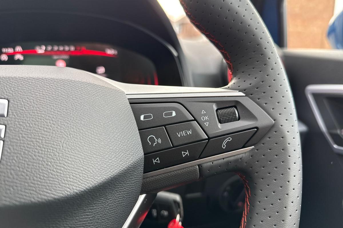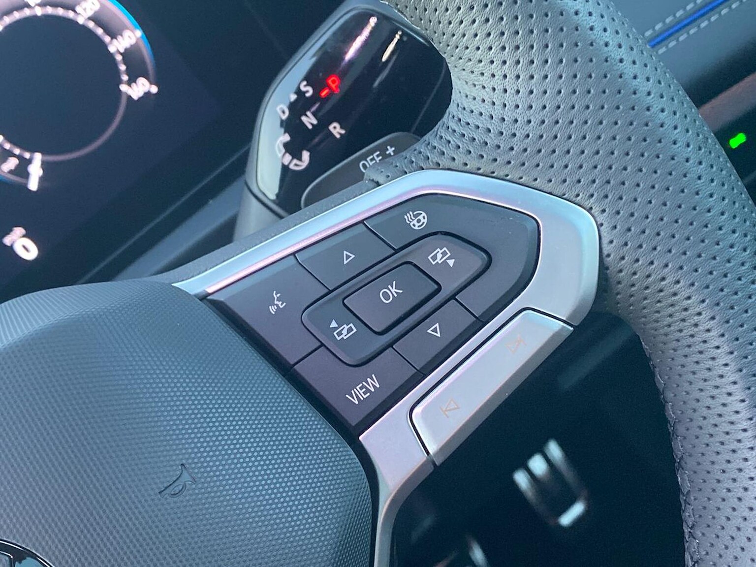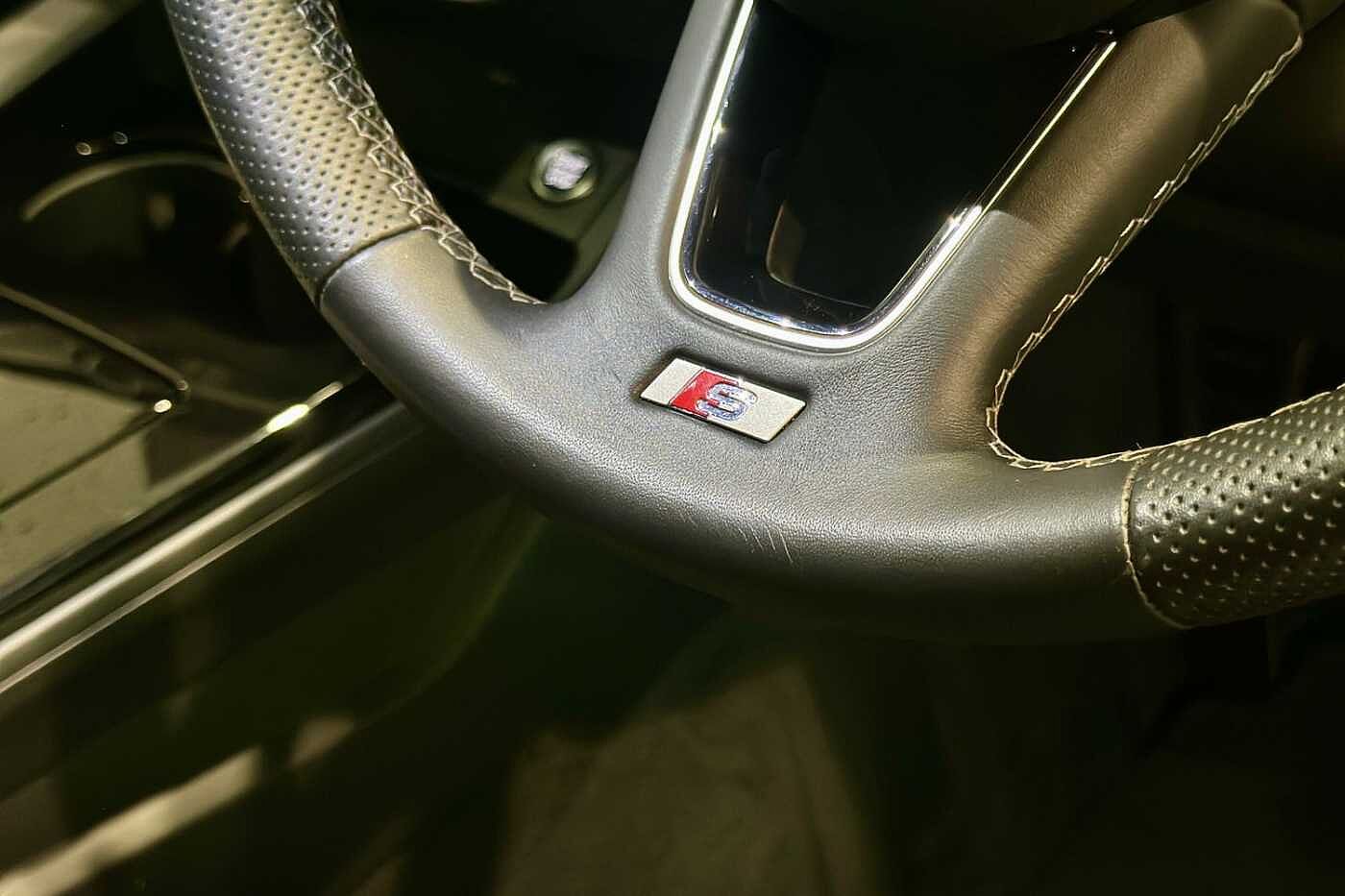 "3 spoke leather multi-function plus steering wheel features S badging and grips in perforated leather with contrast stitching",