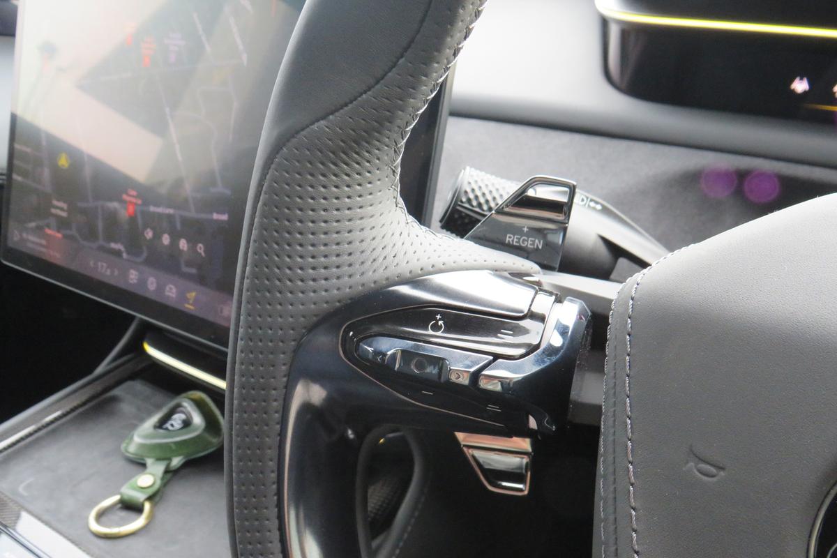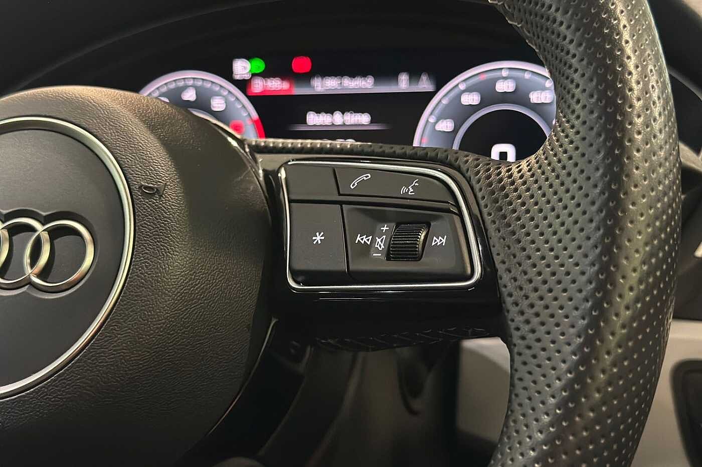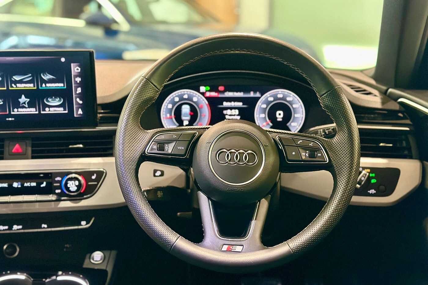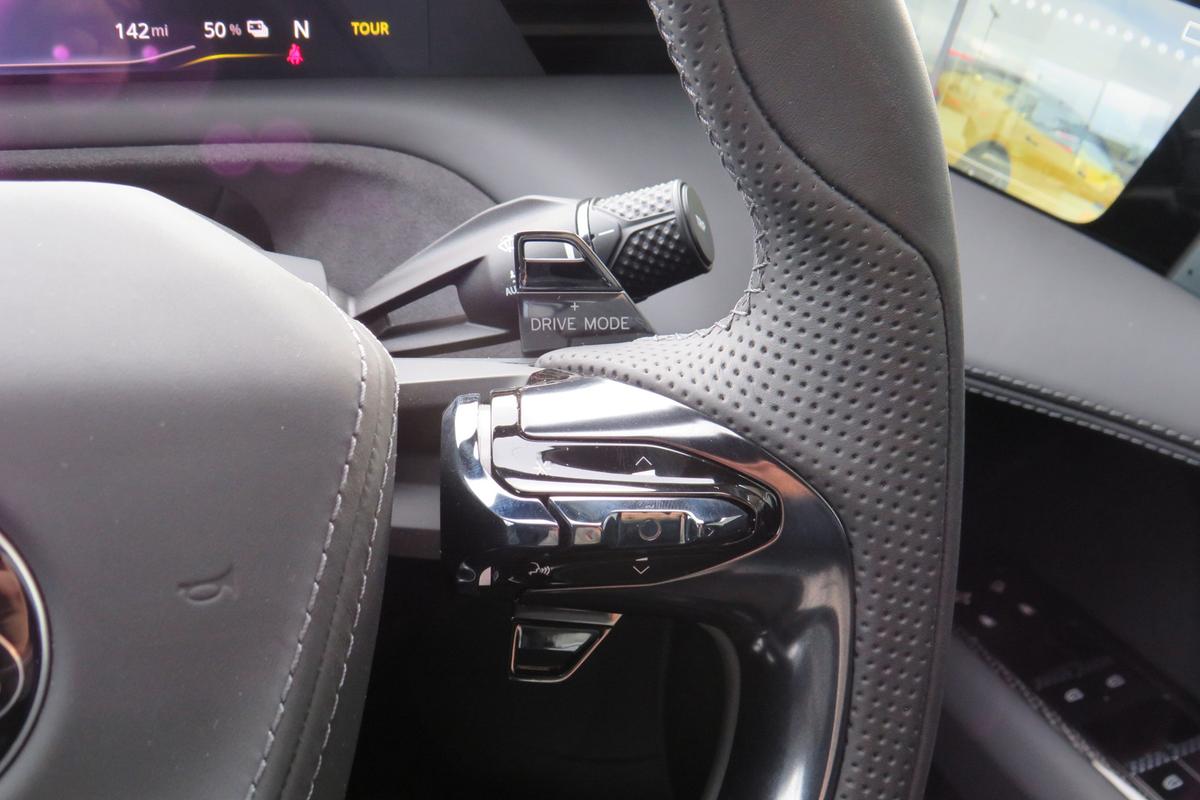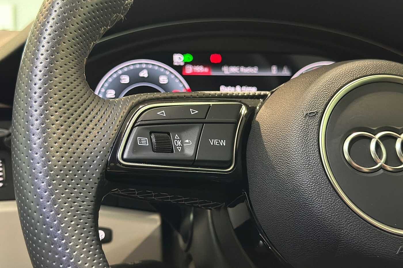"3 spoke leather multi-function plus steering wheel features S badging and grips in perforated leather with contrast stitching",
