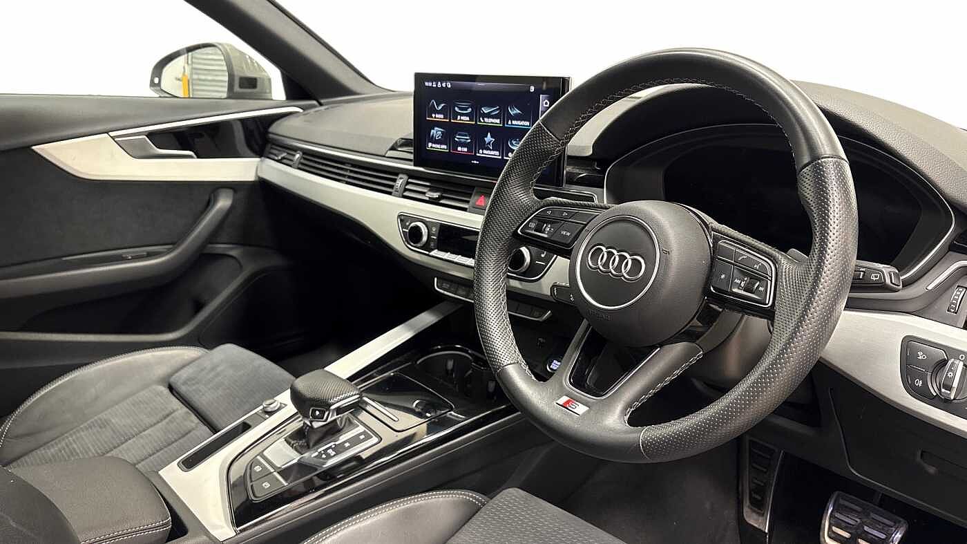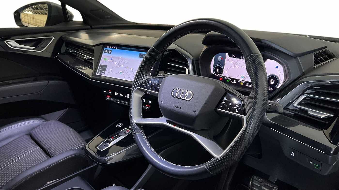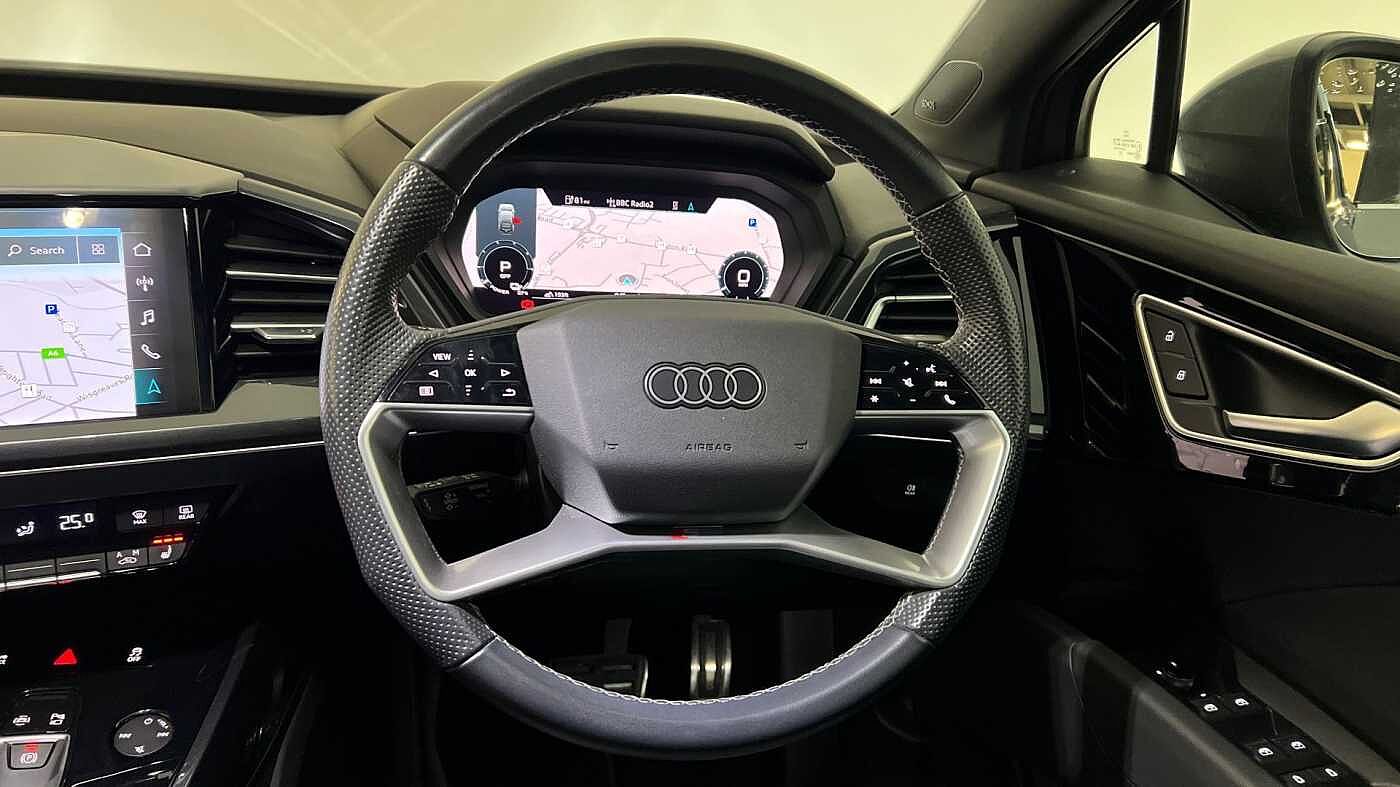 "S badging on the steering wheel",