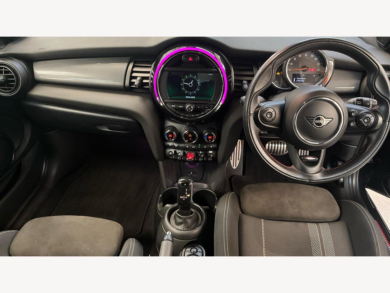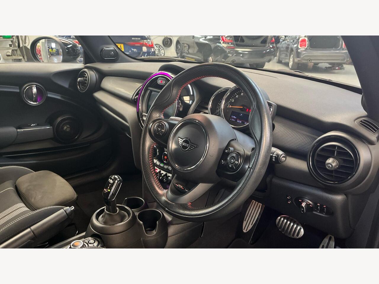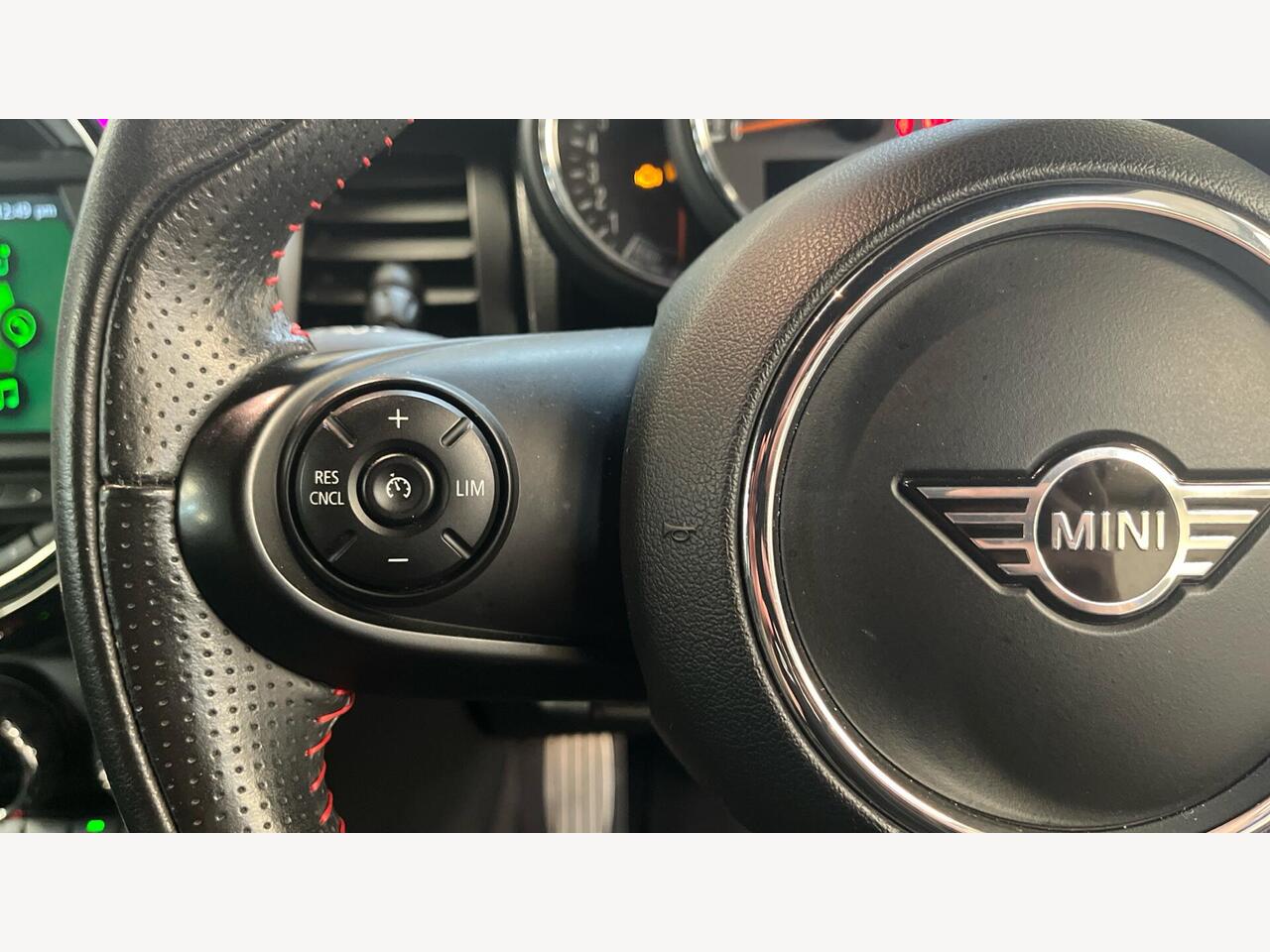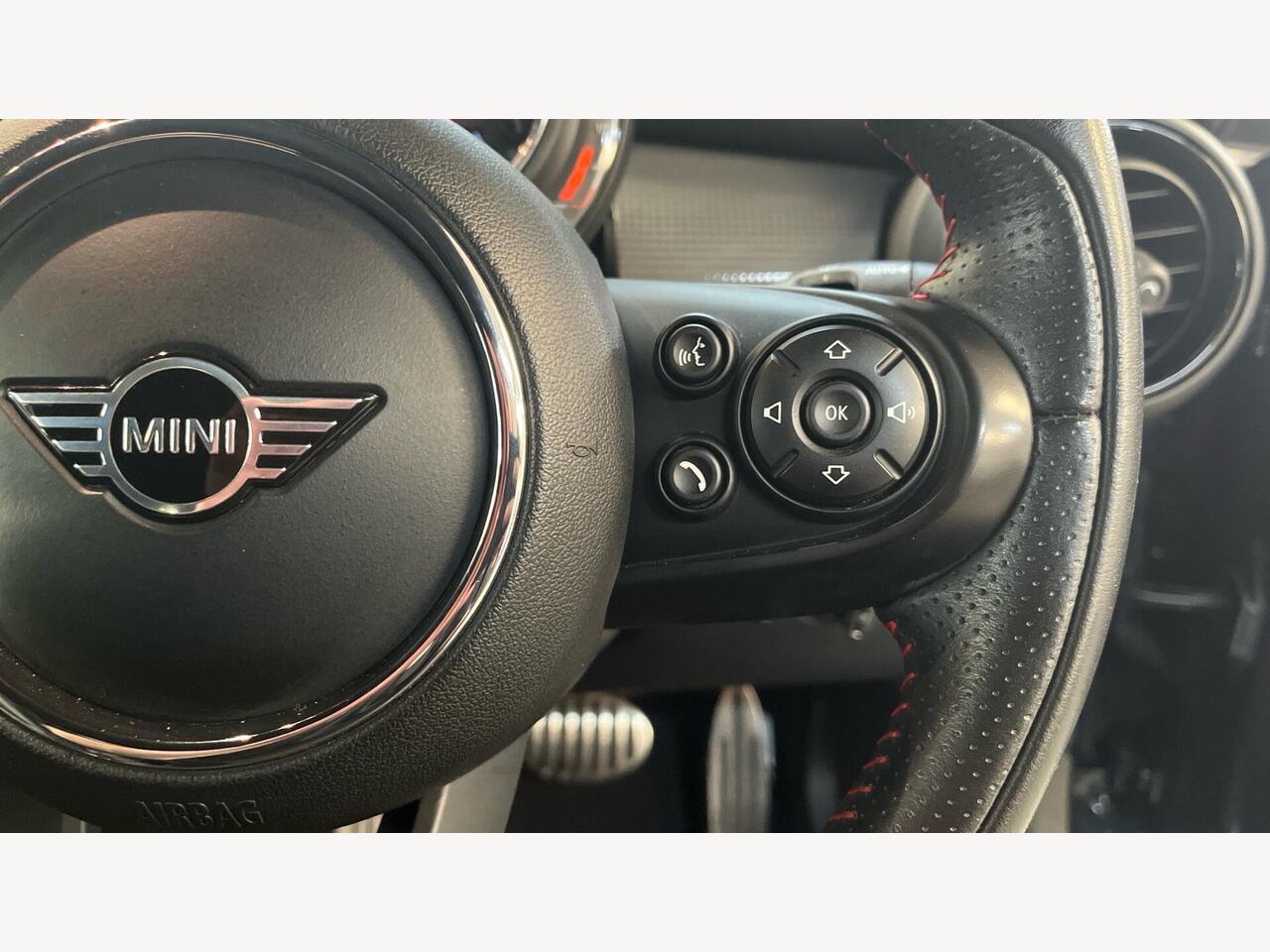 "John Cooper Works leather steering wheel with contrasting stitching in Chilli Red with John Cooper Works logo",