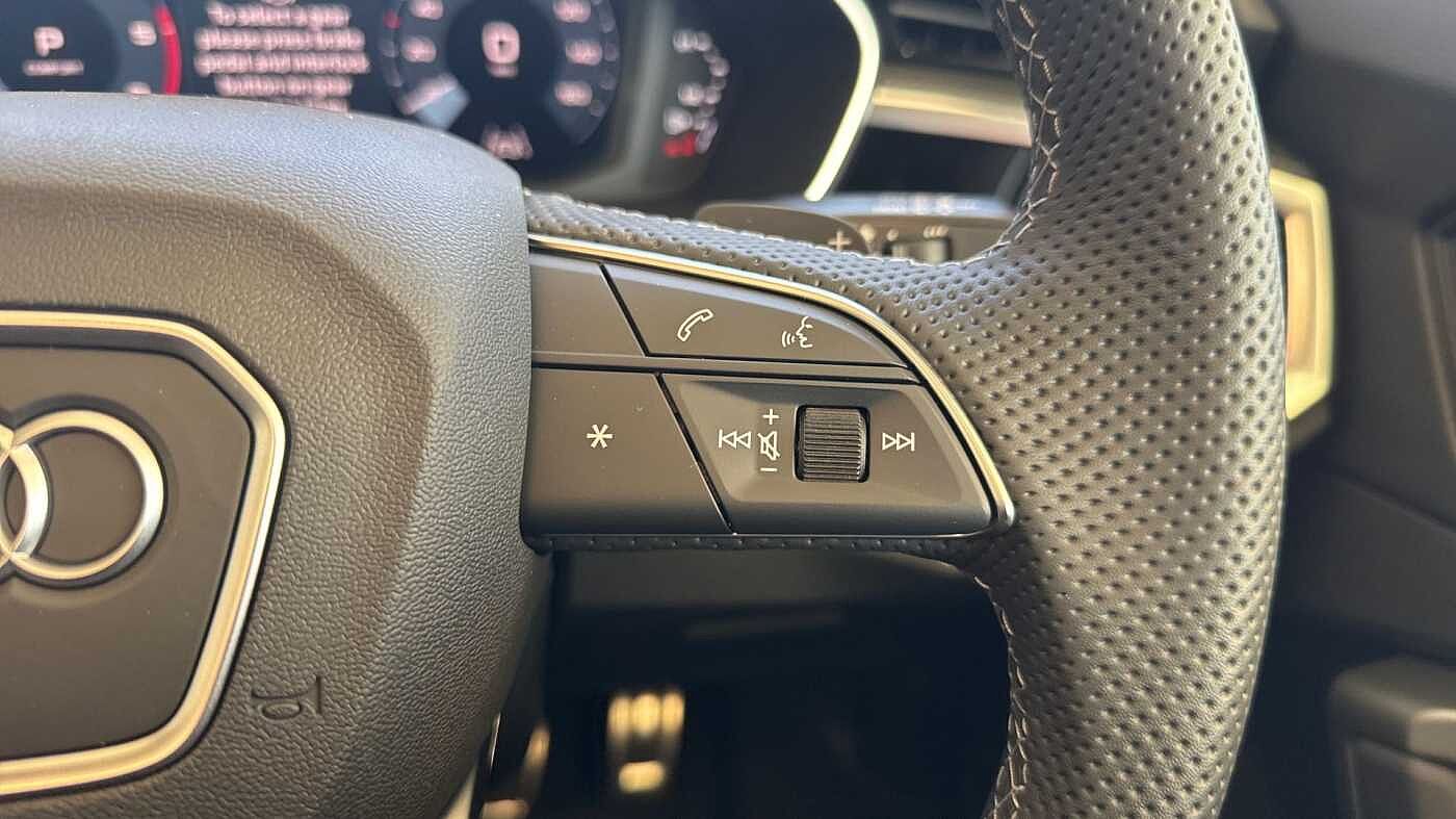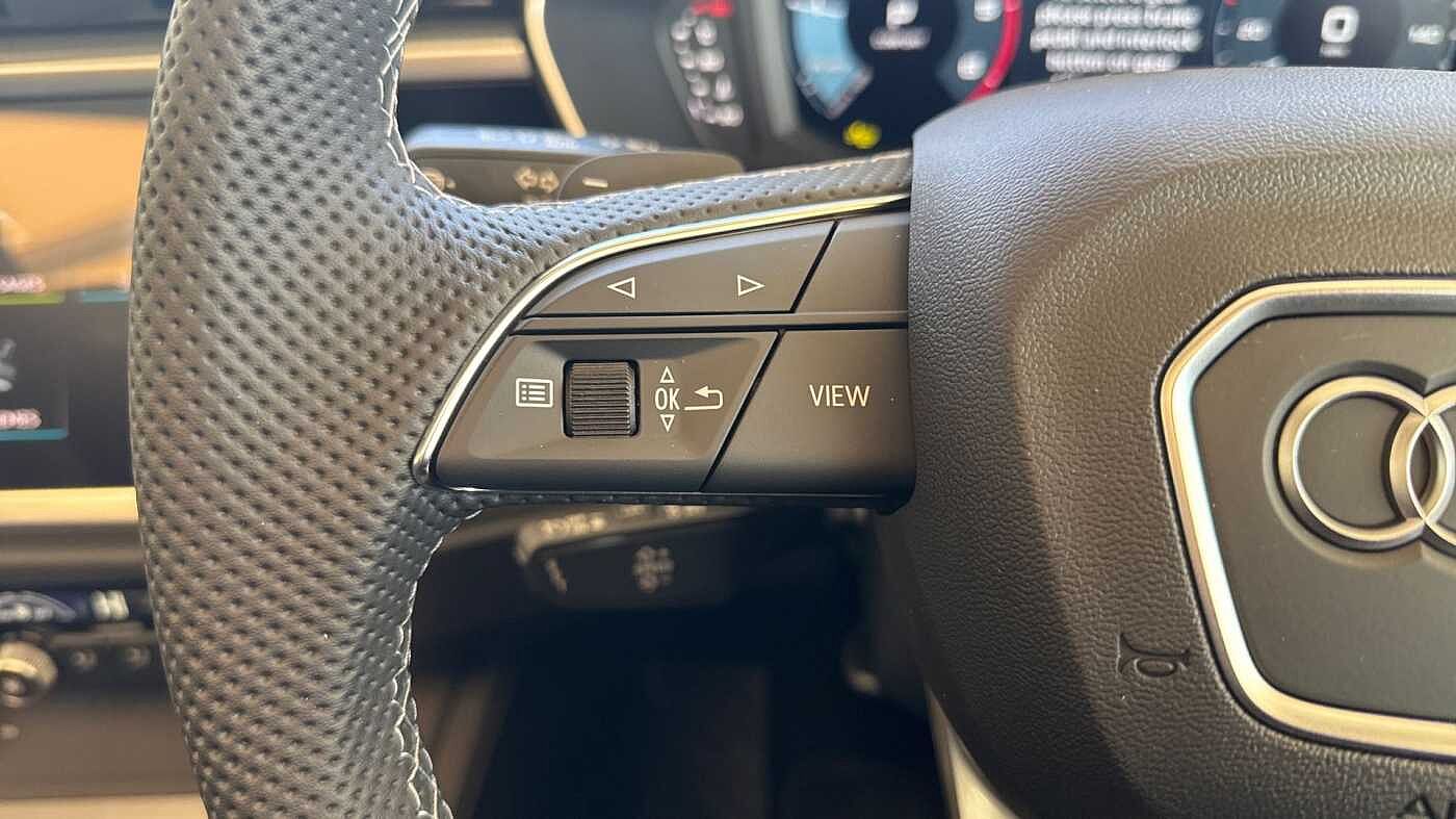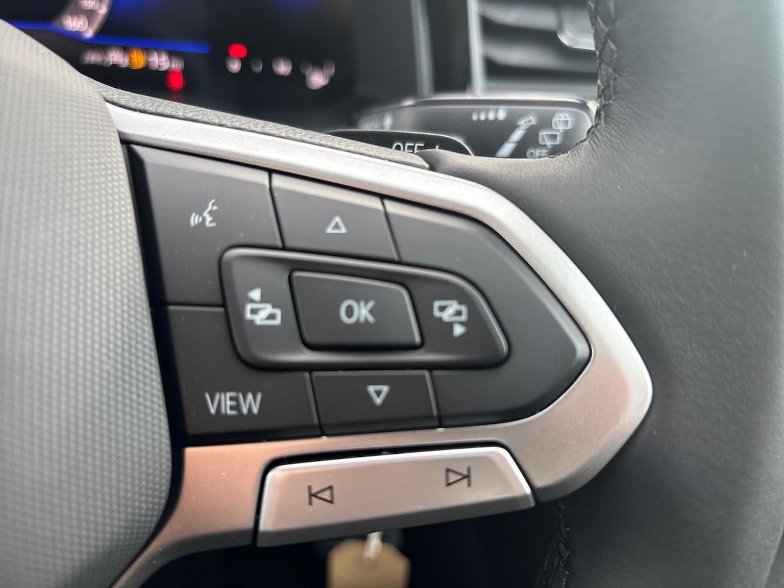 "Three spoke leather wrapped multifunction steering wheel with shifting paddles"