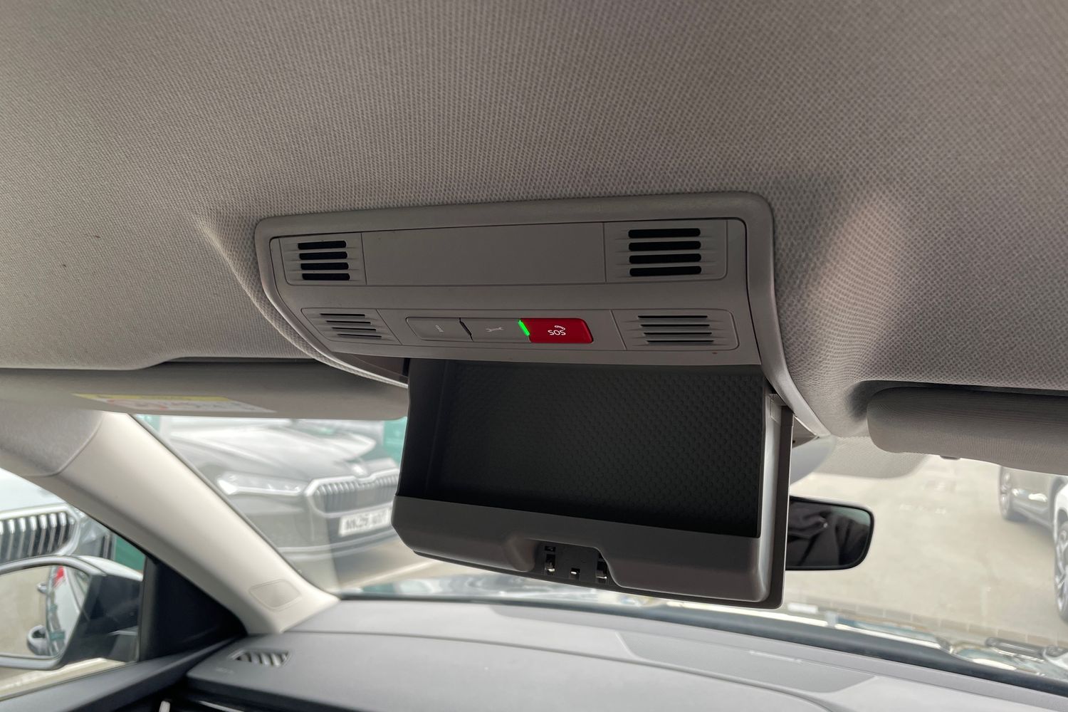 "Overhead glasses storage compartment",