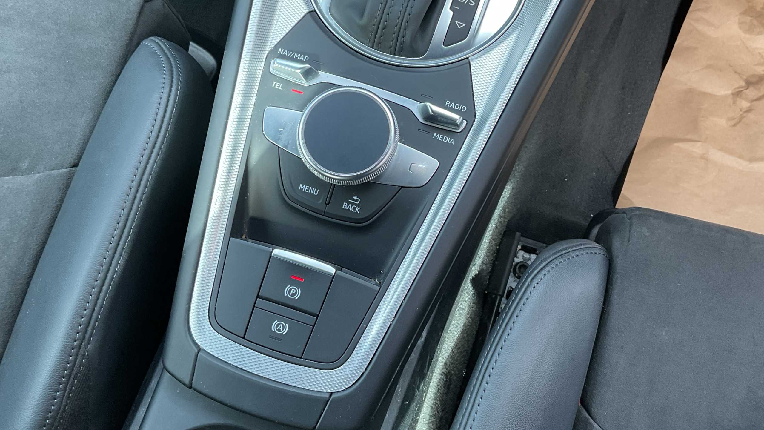 "Uncovered storage compartment in centre console"