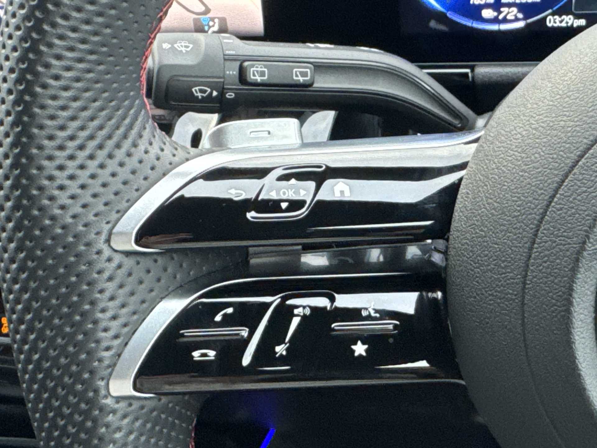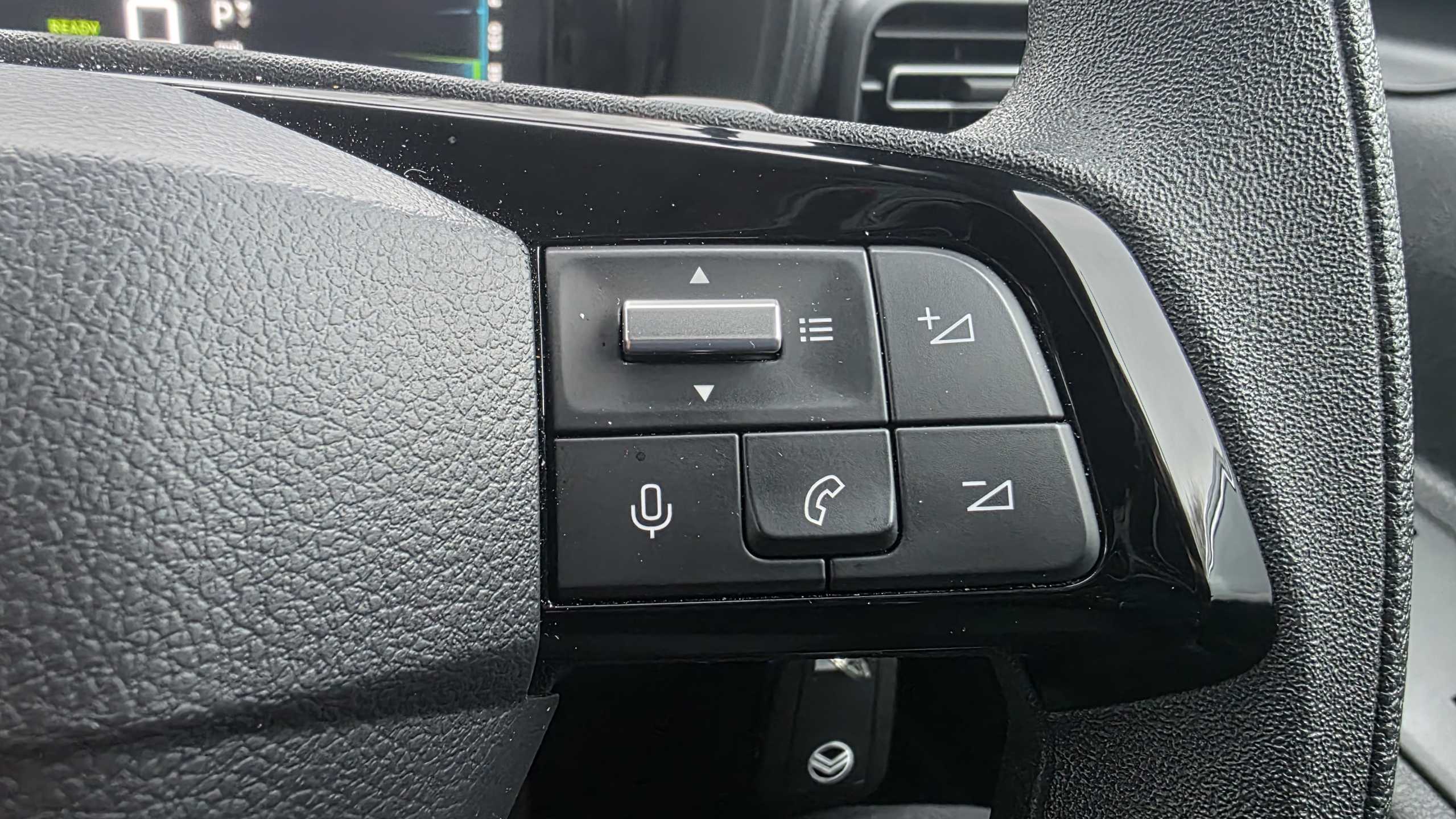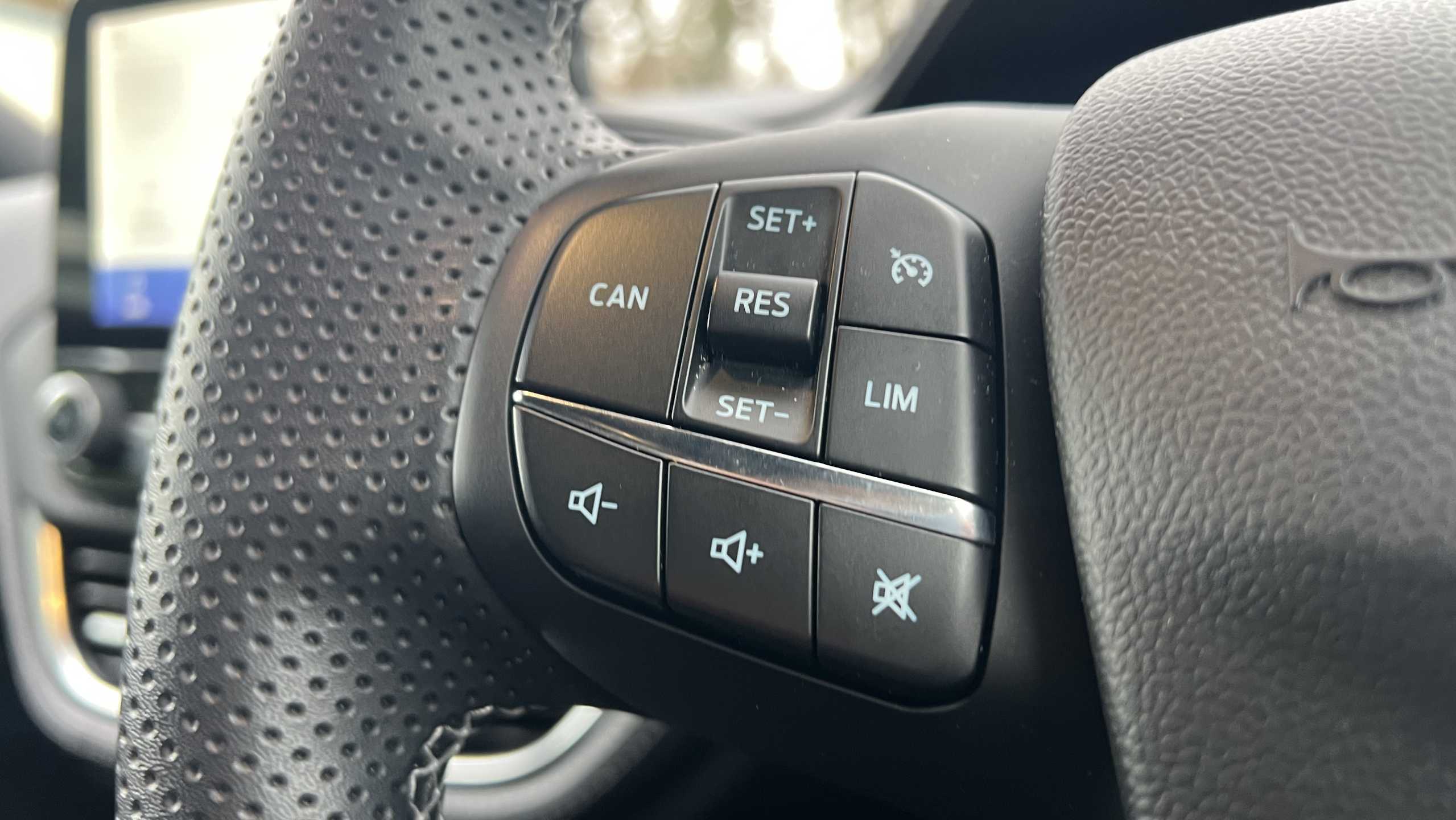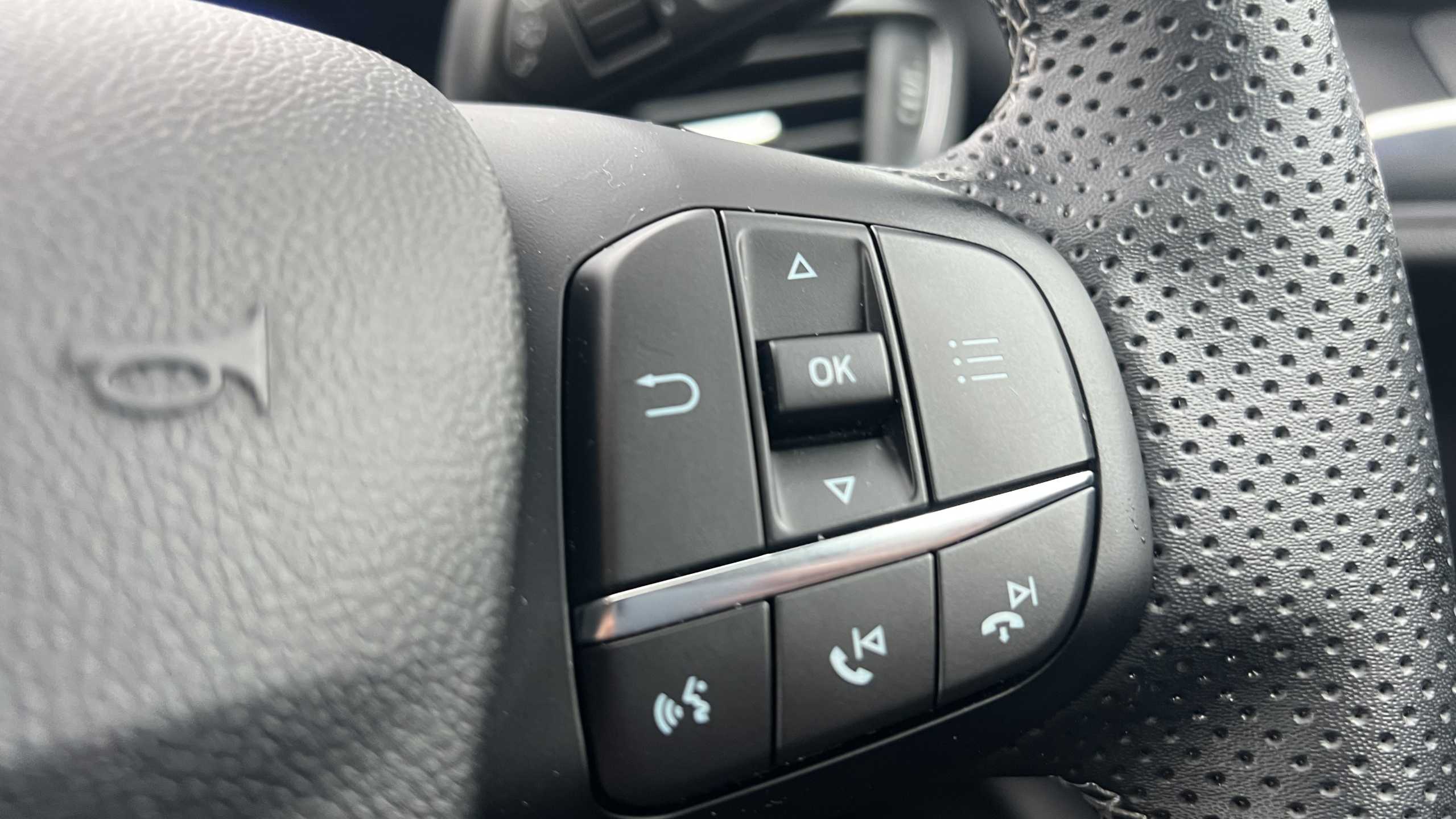 "3 Spoke flat bottom leather multi function steering wheel with perforated leather in grip area",