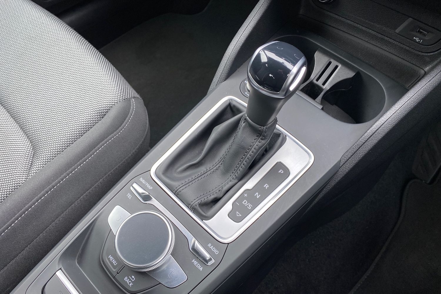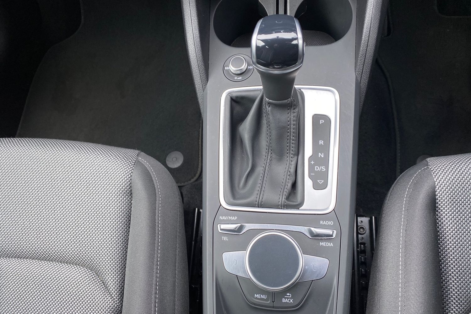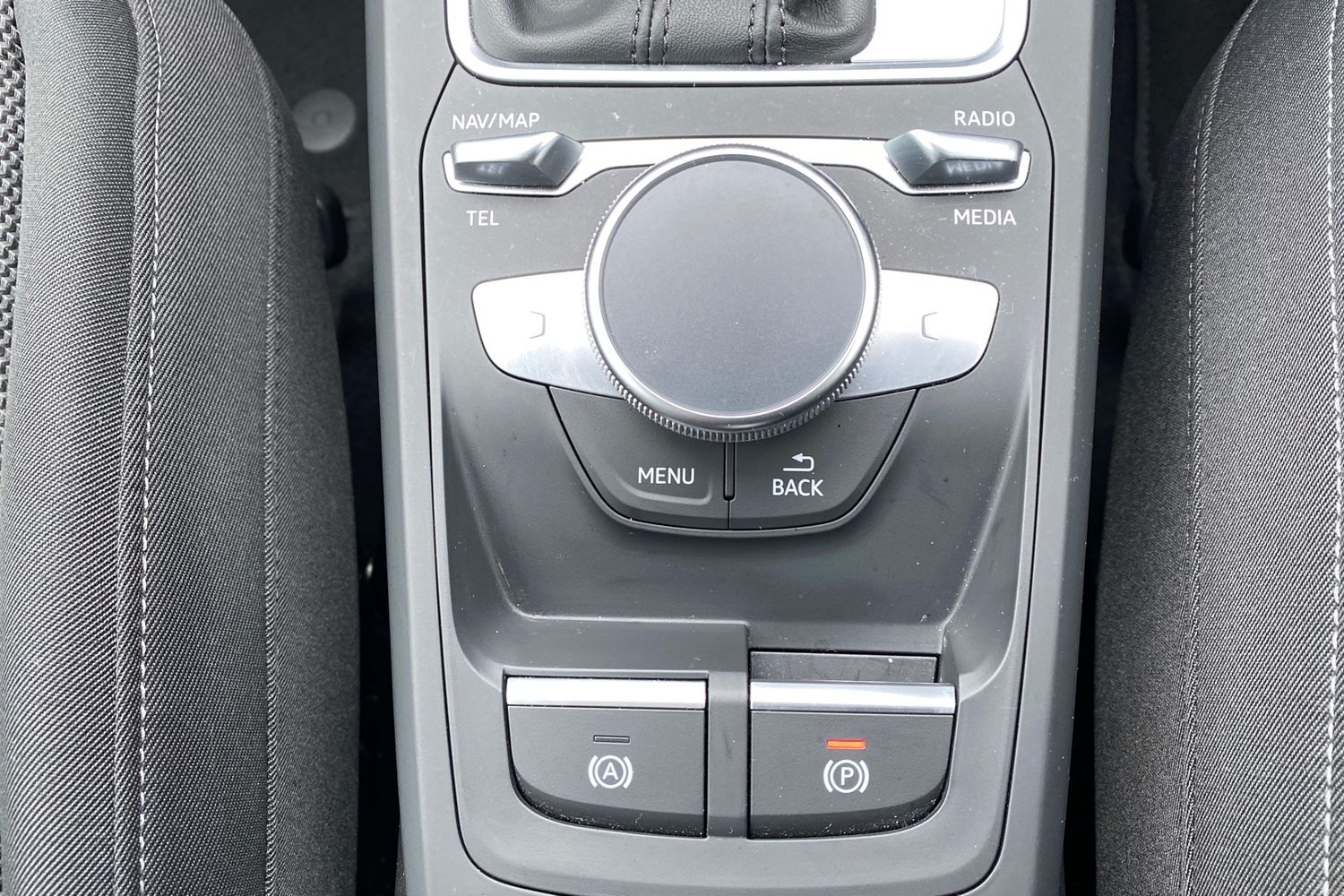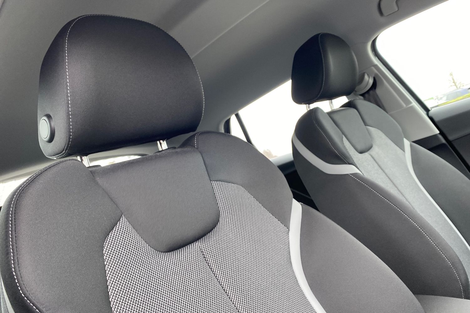 "Cloth upholstery with black and metallic grey syntech leather inserts",