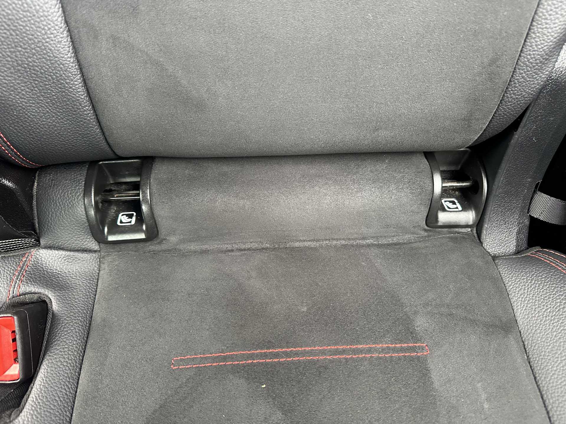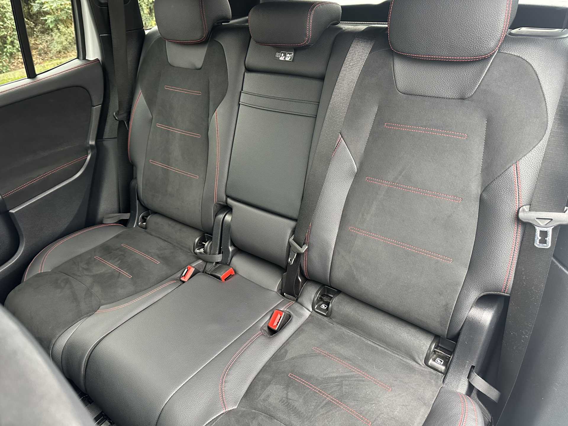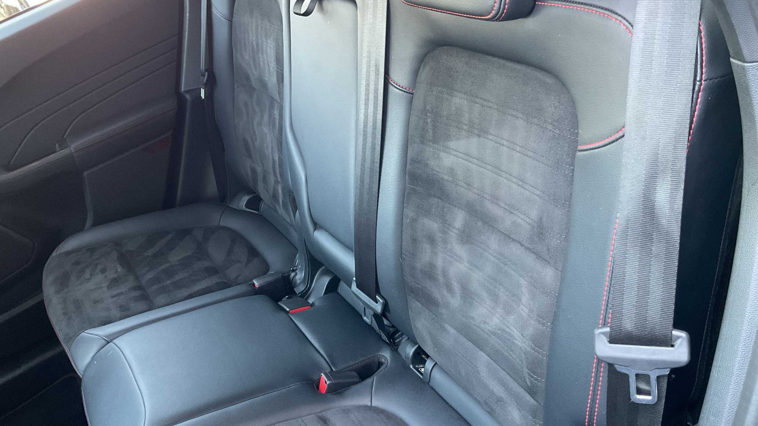 "Partial premium touch sensico leather upholstery with black cloth inserts and red stitching",