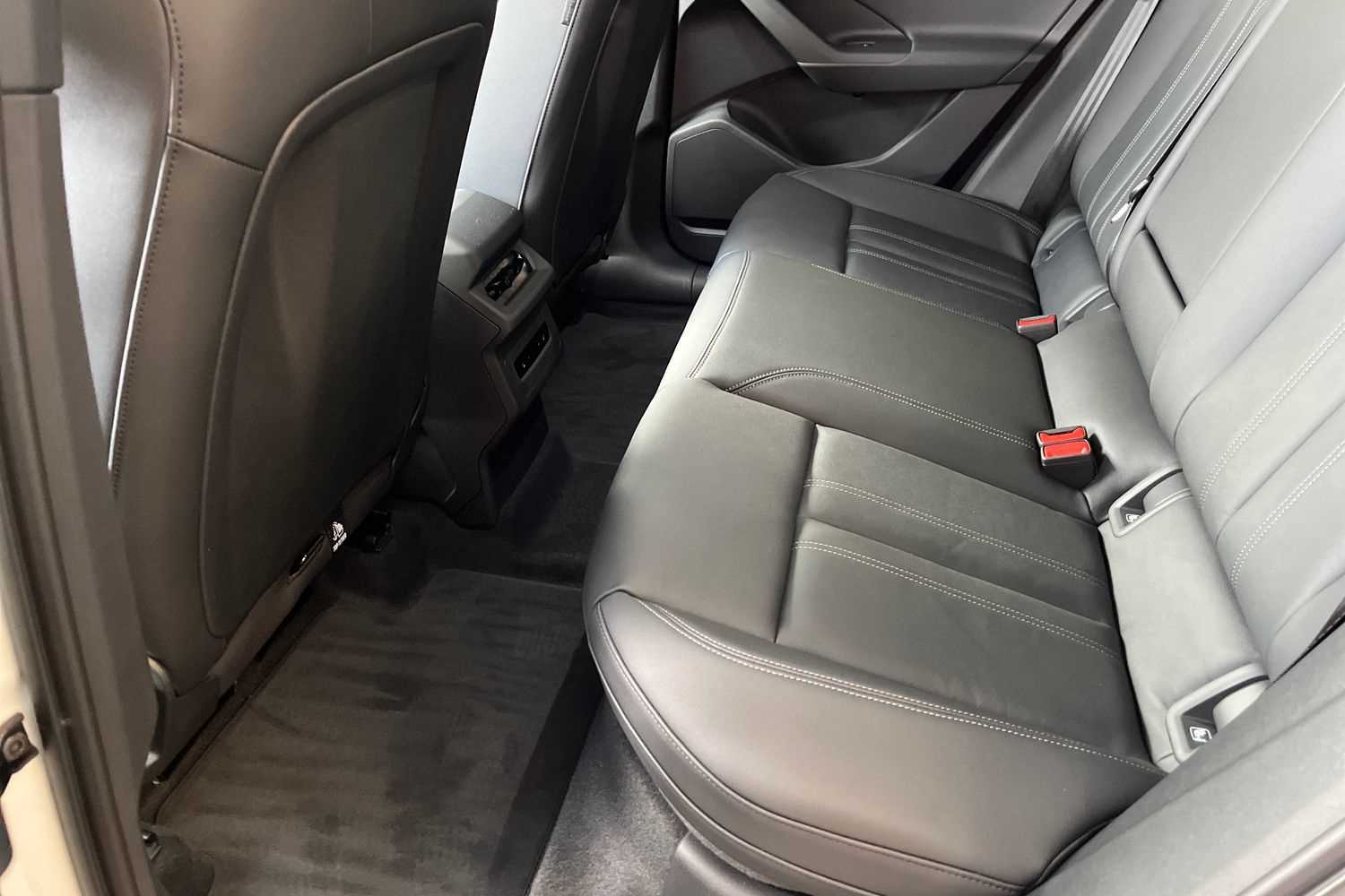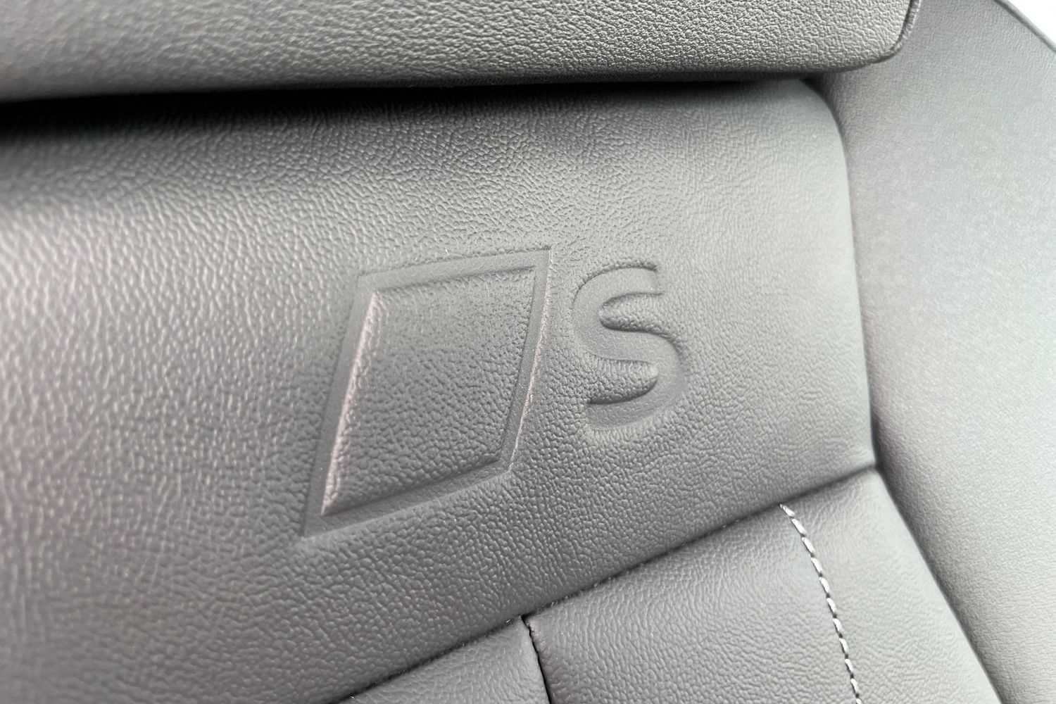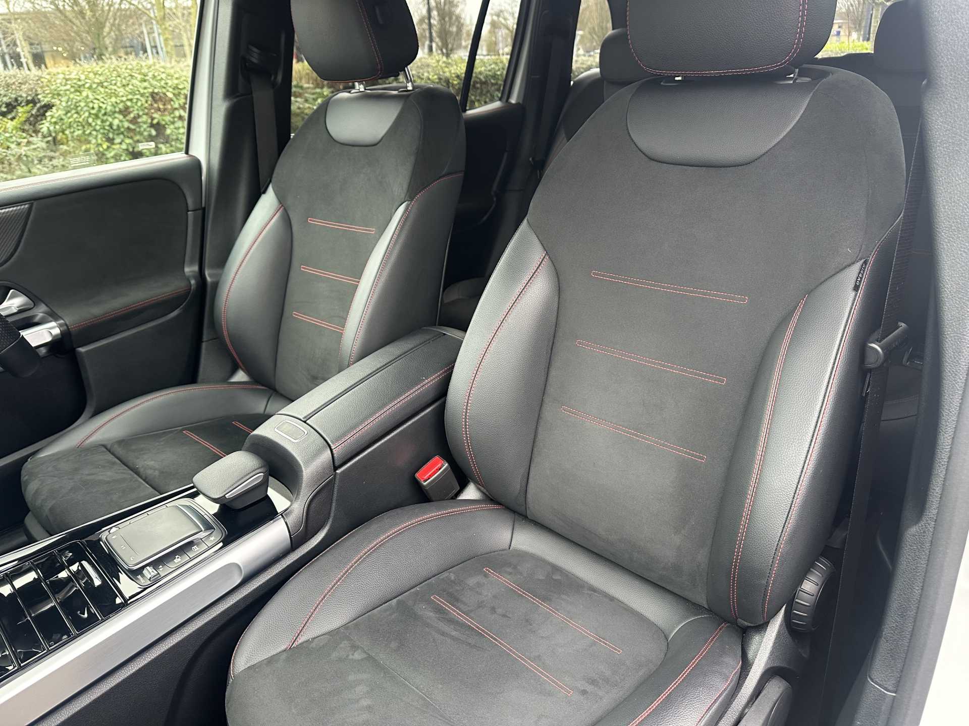"Partial premium touch sensico leather upholstery with black cloth inserts and red stitching",