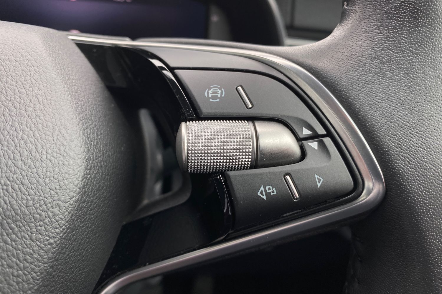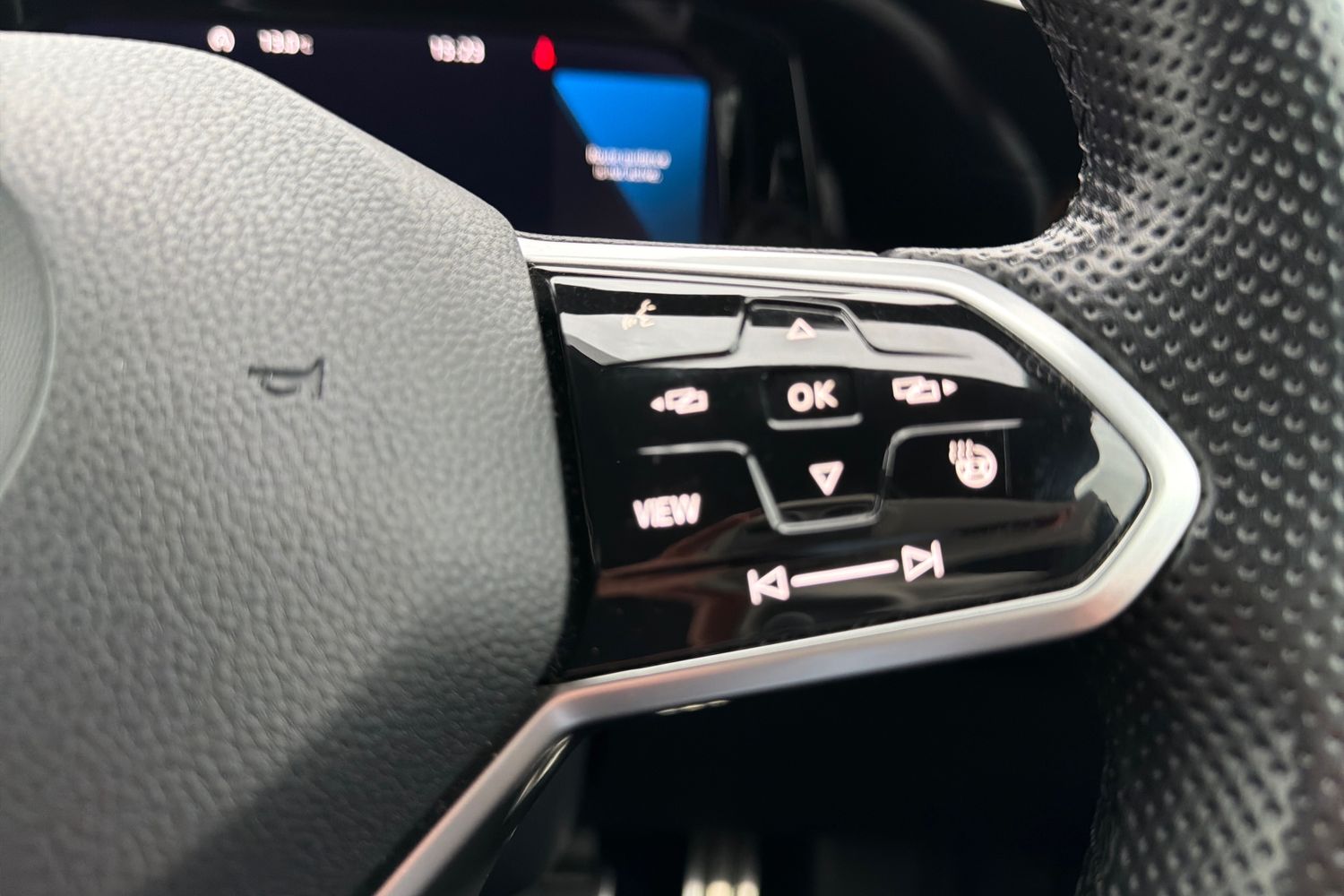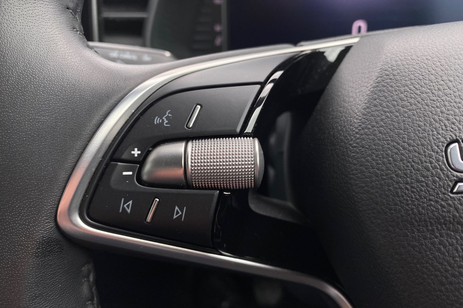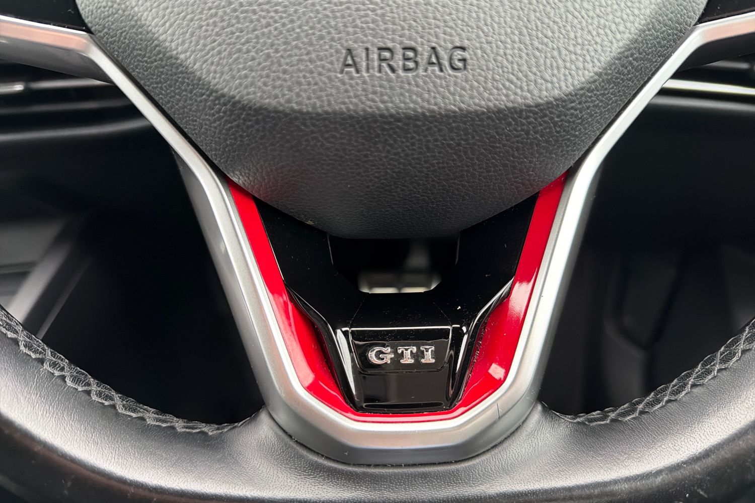 "3 spoke flat bottomed multi-function plus leather steering wheel with S badging, grips in preforated leather, contrast stitching and paddle shift",