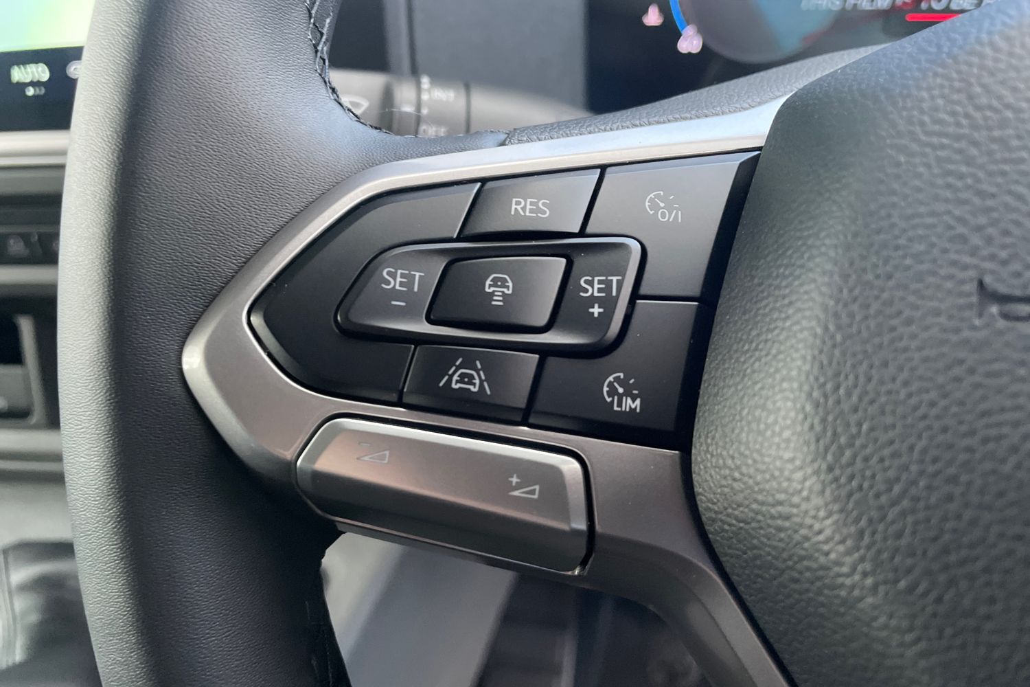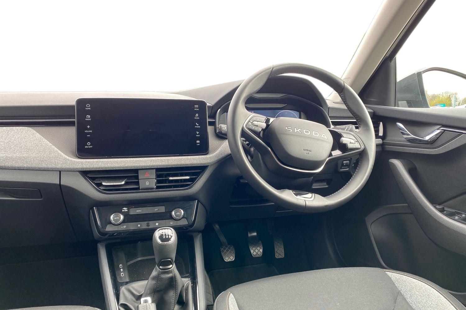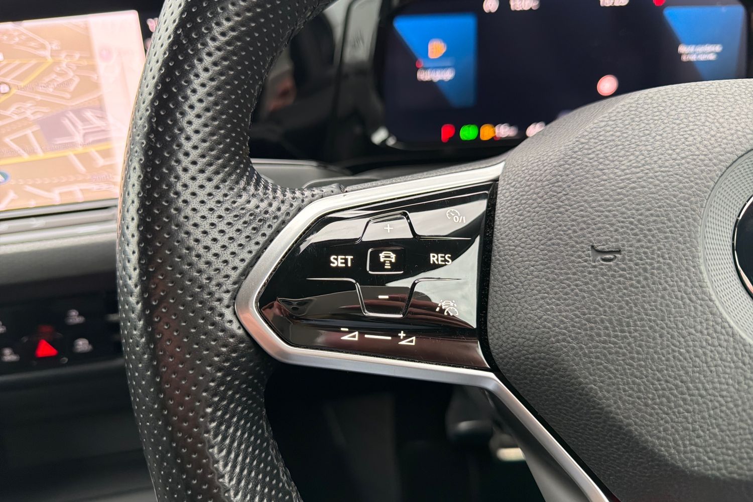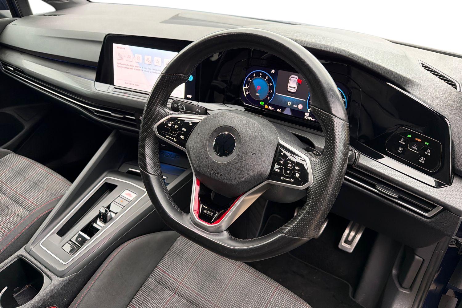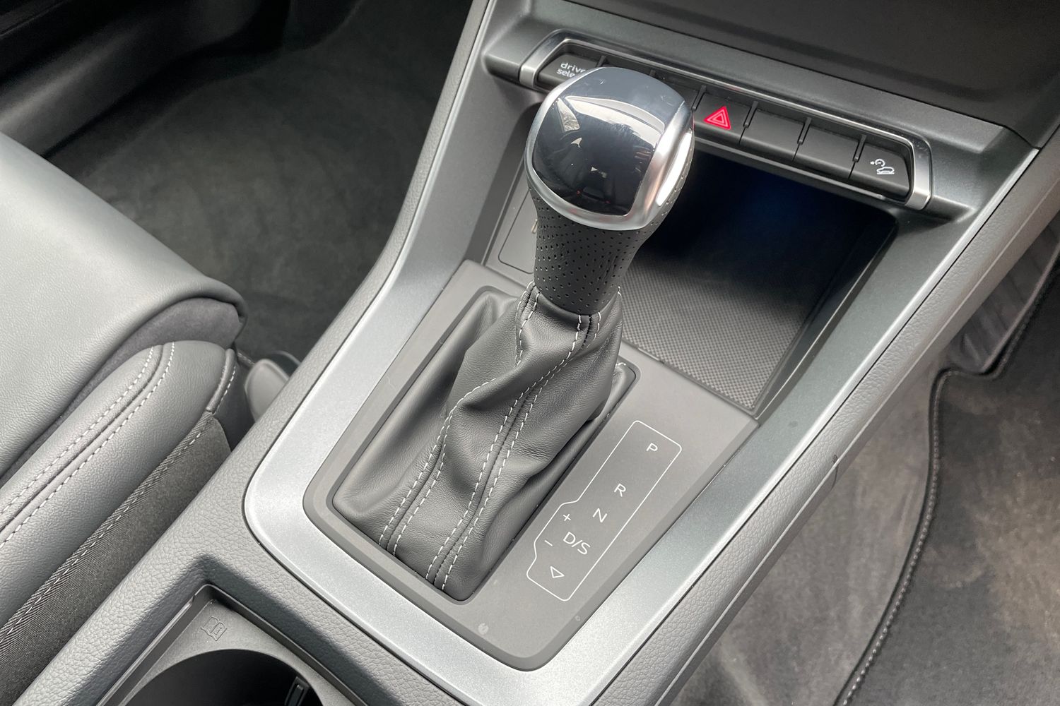 "3 spoke flat bottomed multi-function plus leather steering wheel with S badging, grips in preforated leather, contrast stitching and paddle shift",