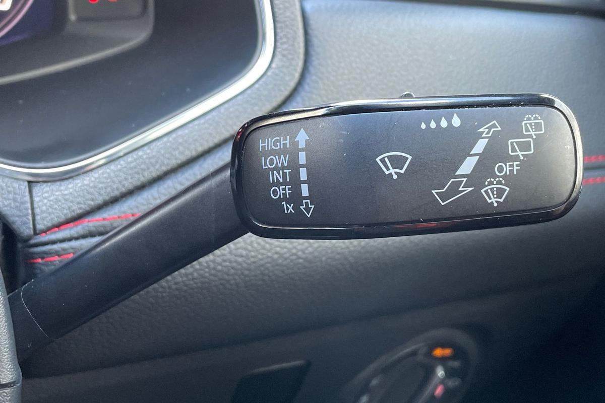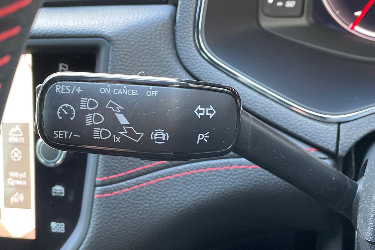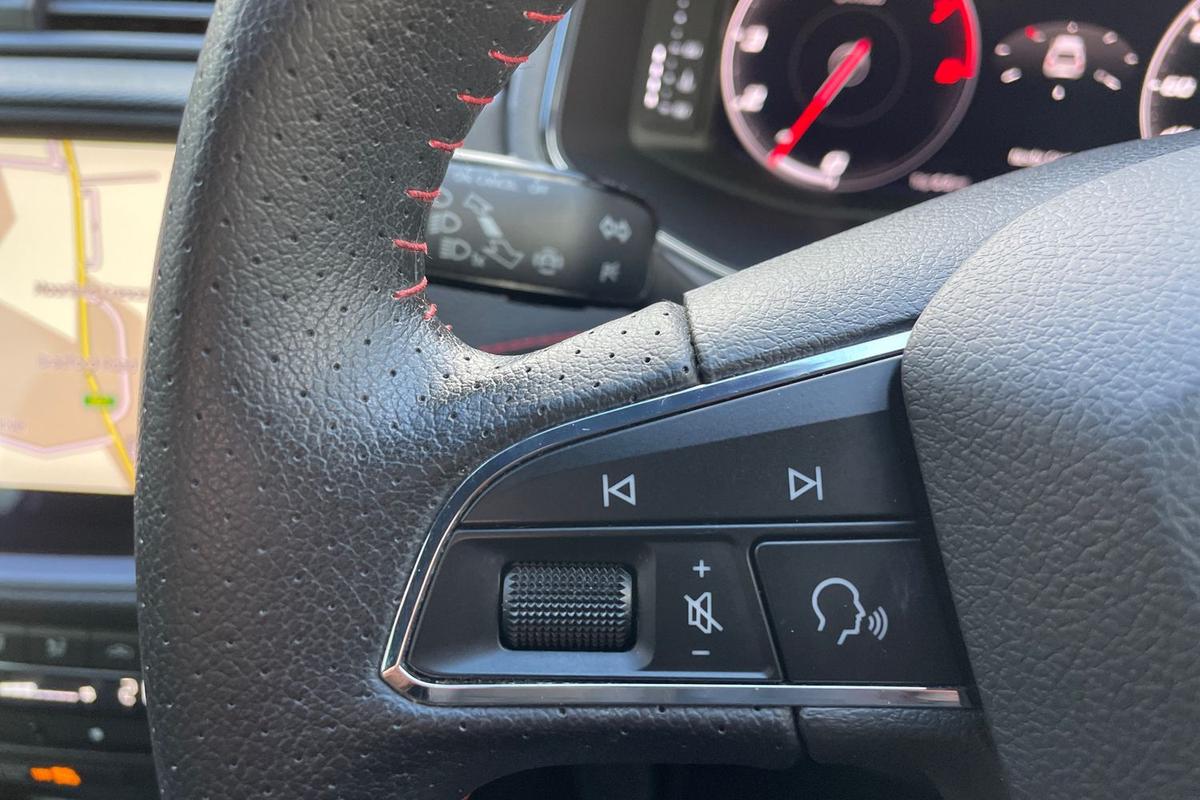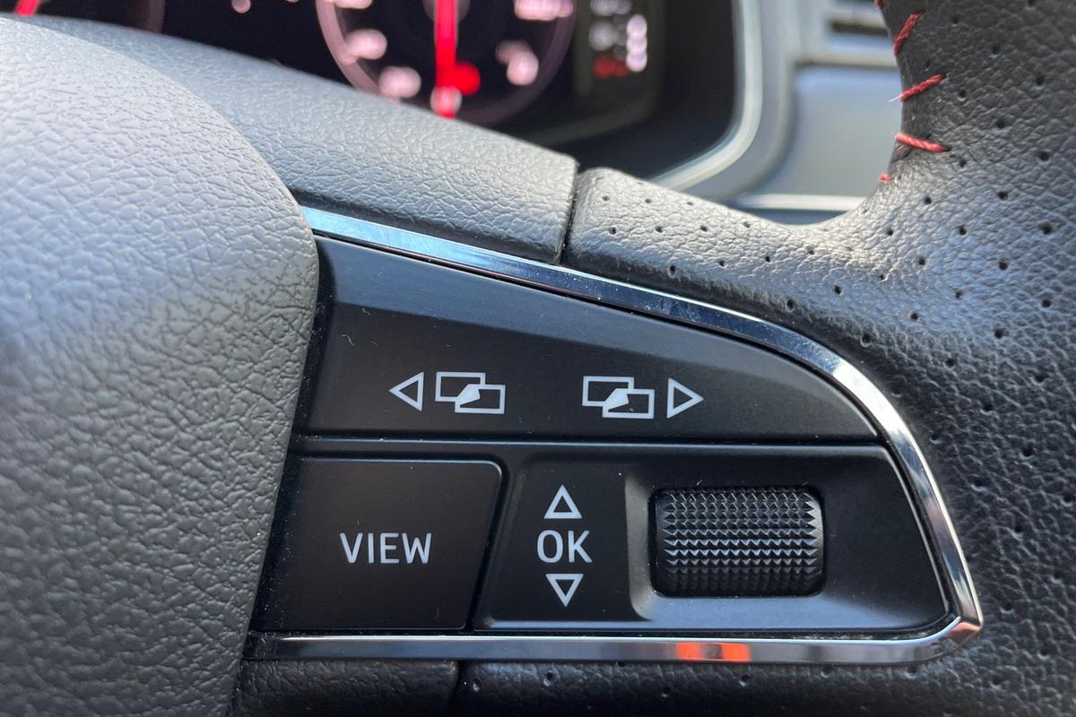 "D-cut steering wheel with red stitching",