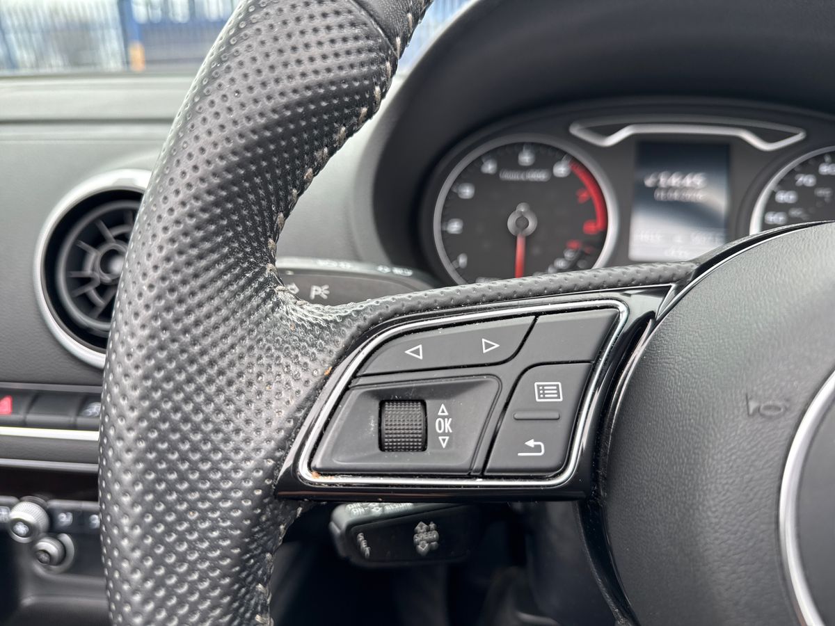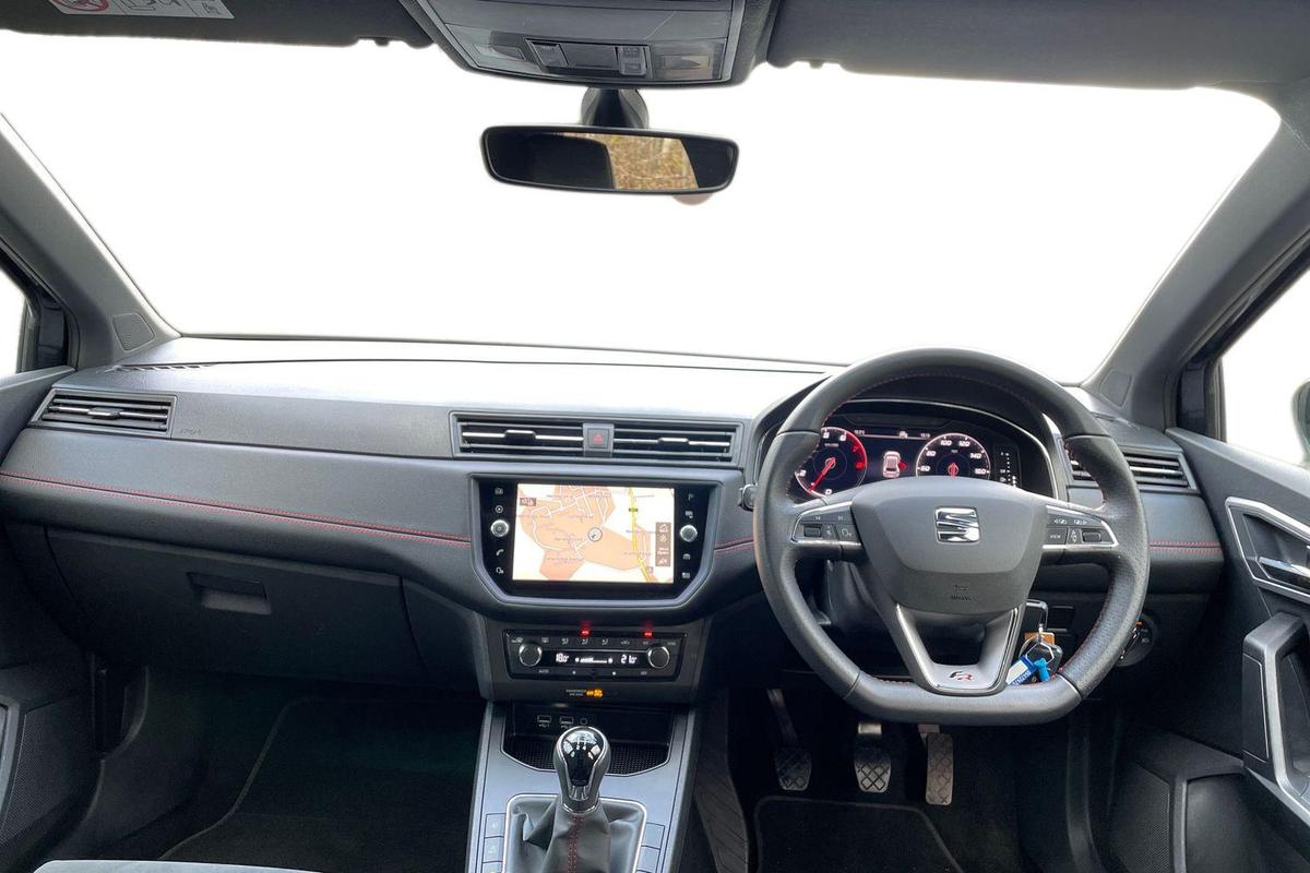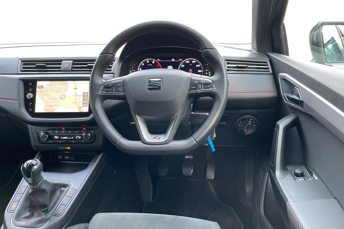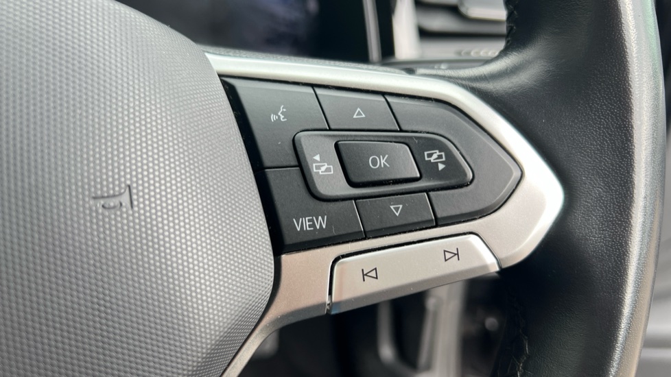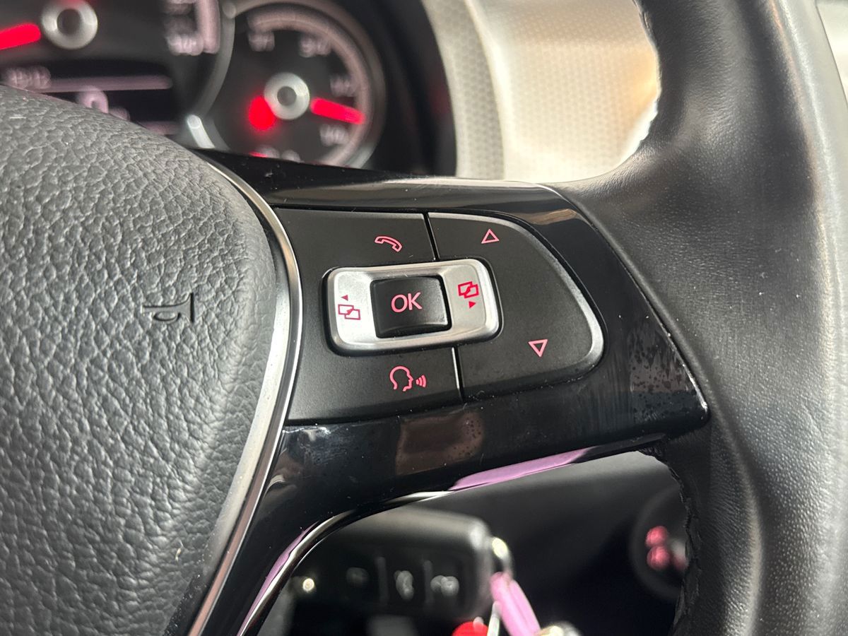 "D-cut steering wheel with red stitching",
