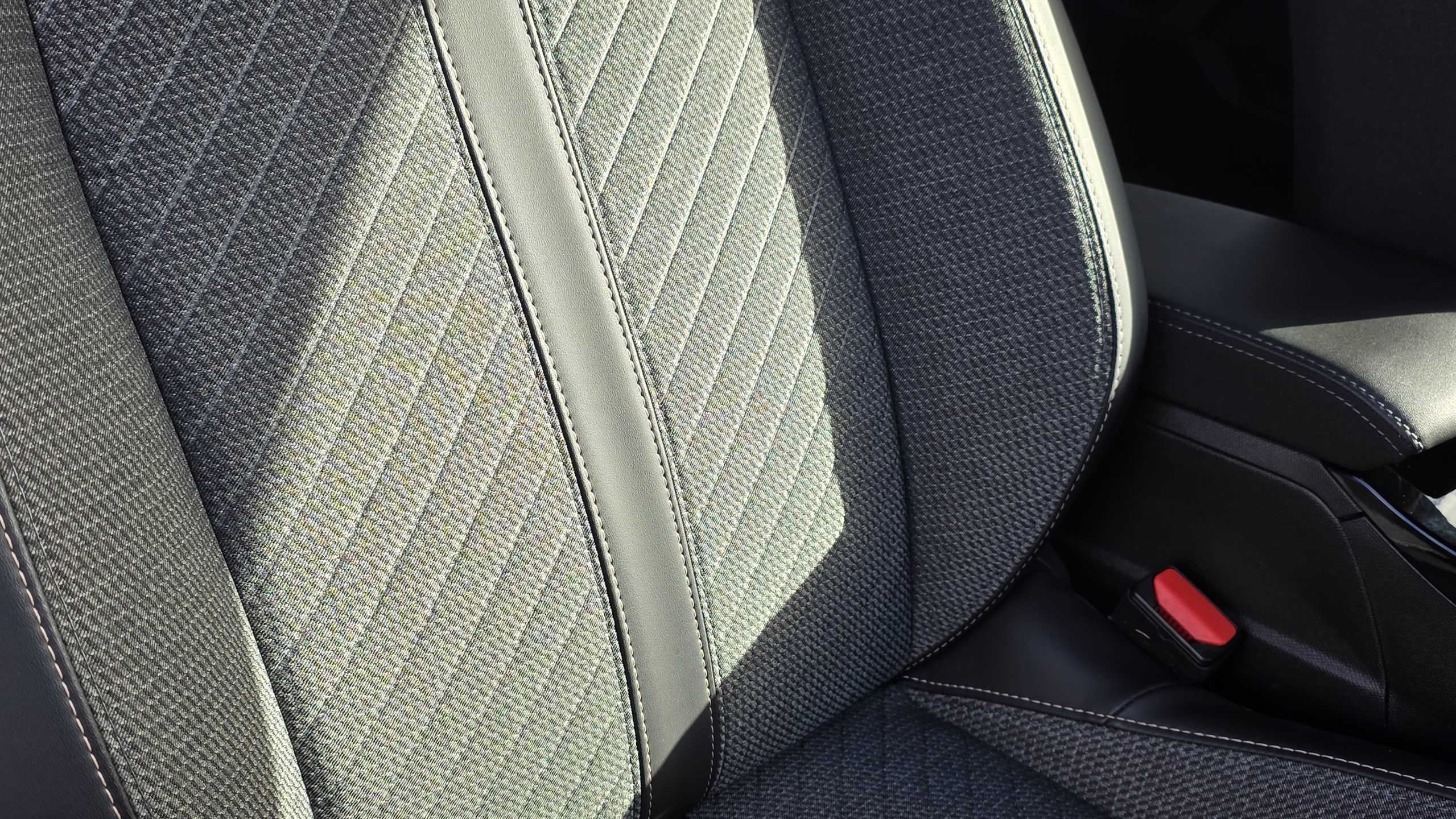 "Cloth upholstery with black and metallic grey syntech leather inserts",