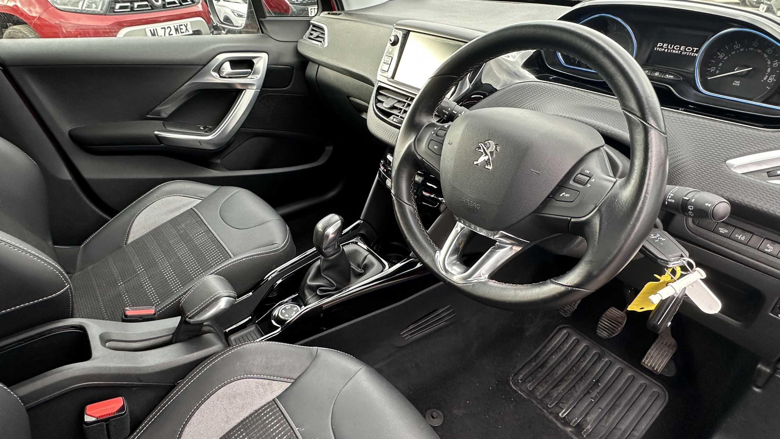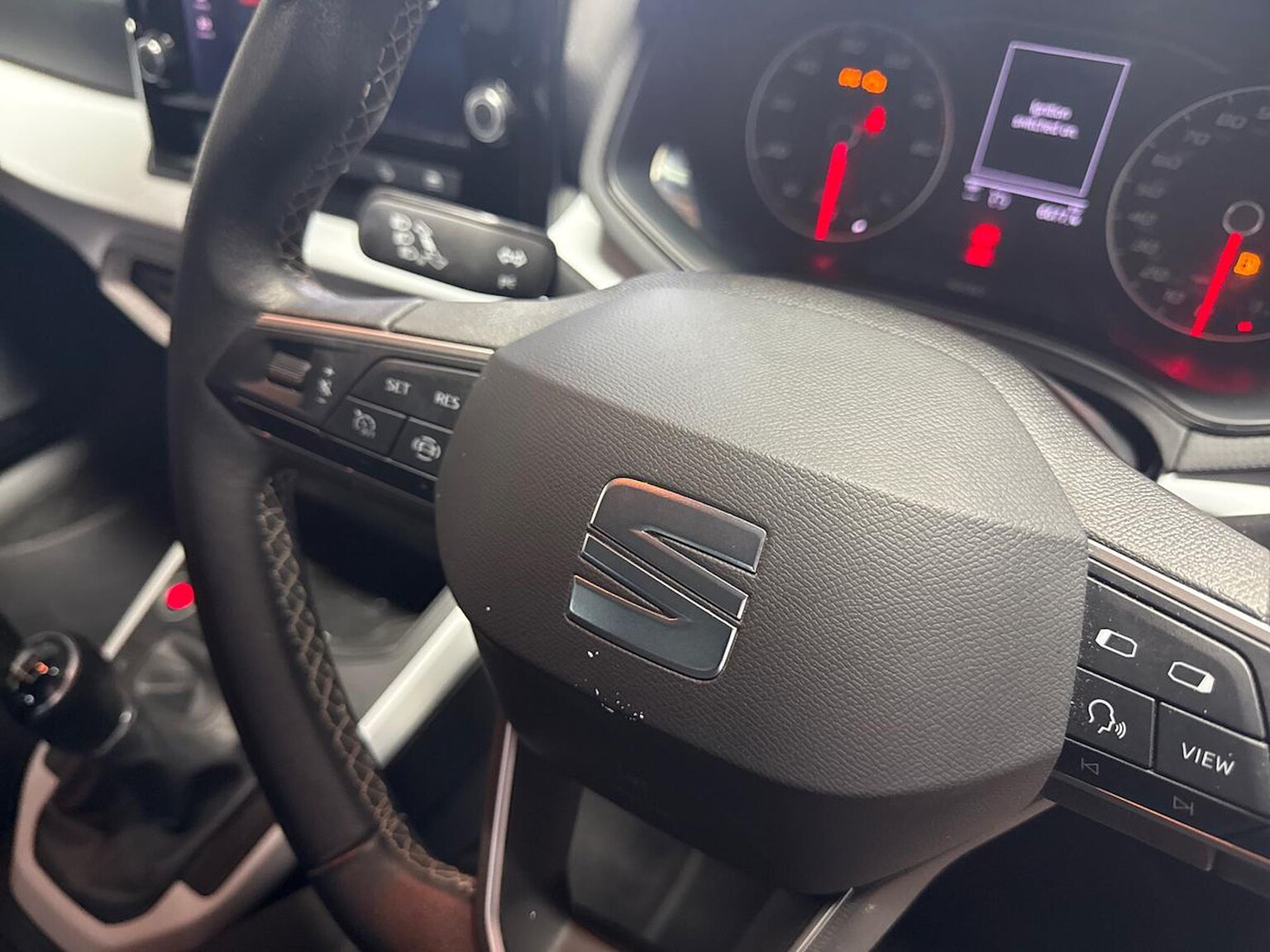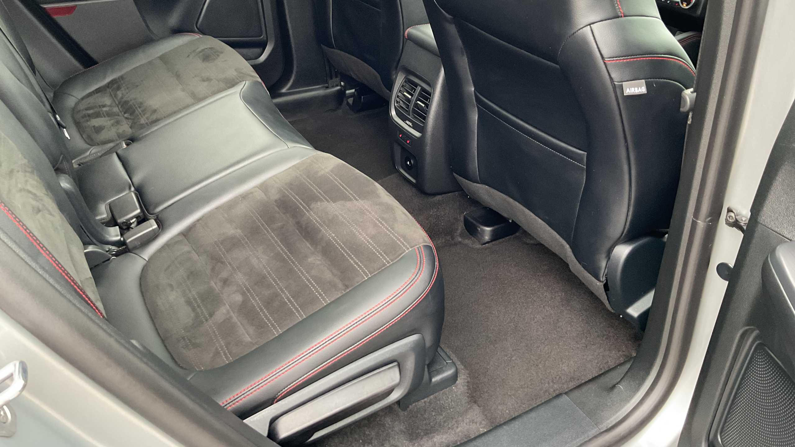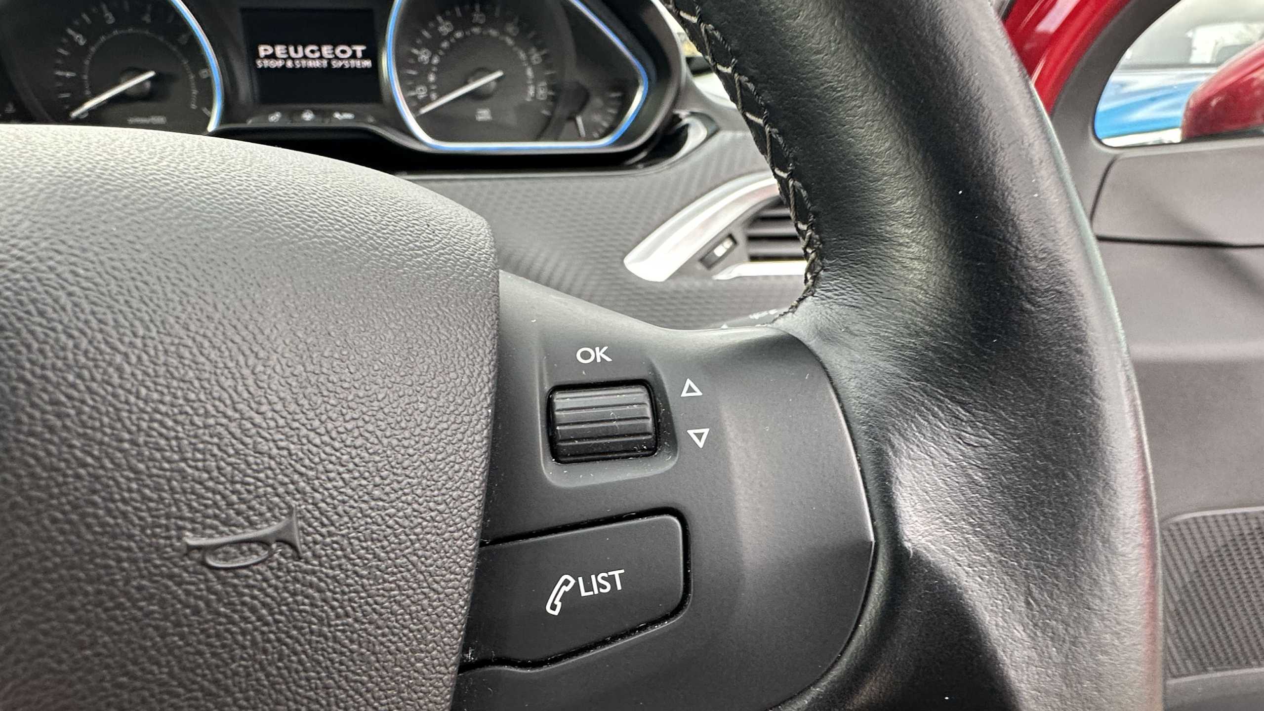 "Flat bottomed leather steering wheel in sensico with red stitching",
