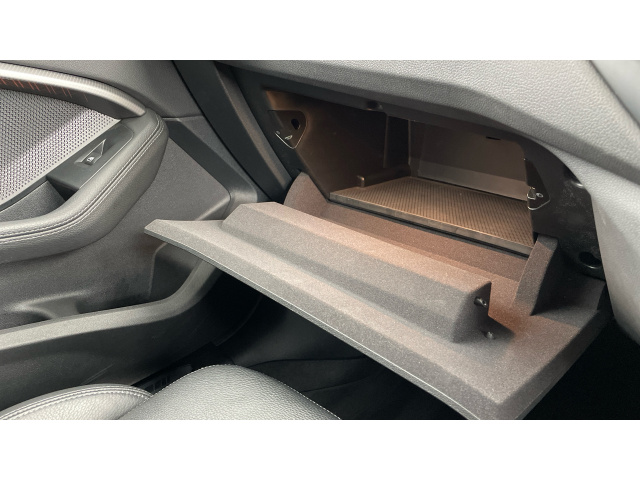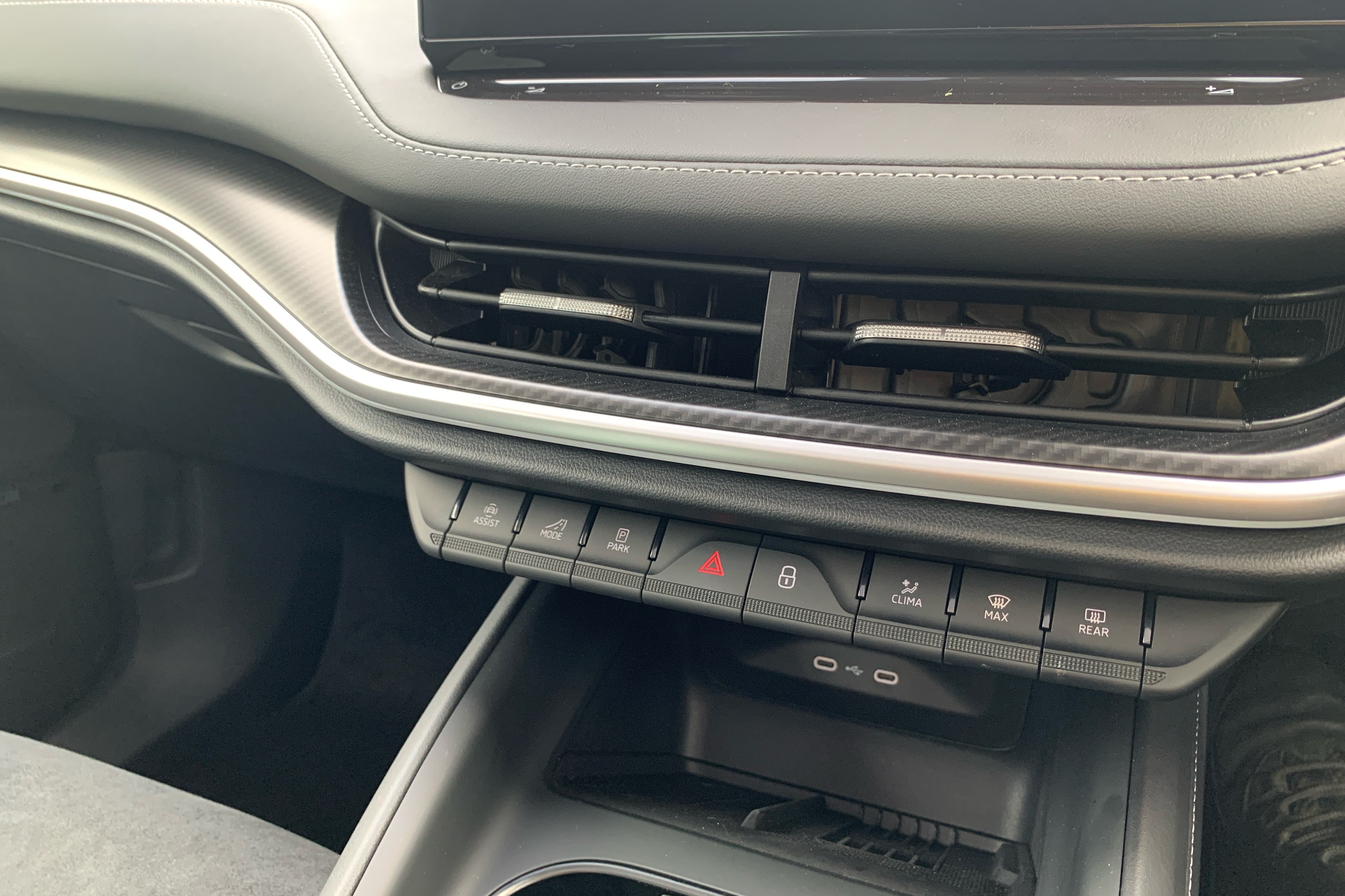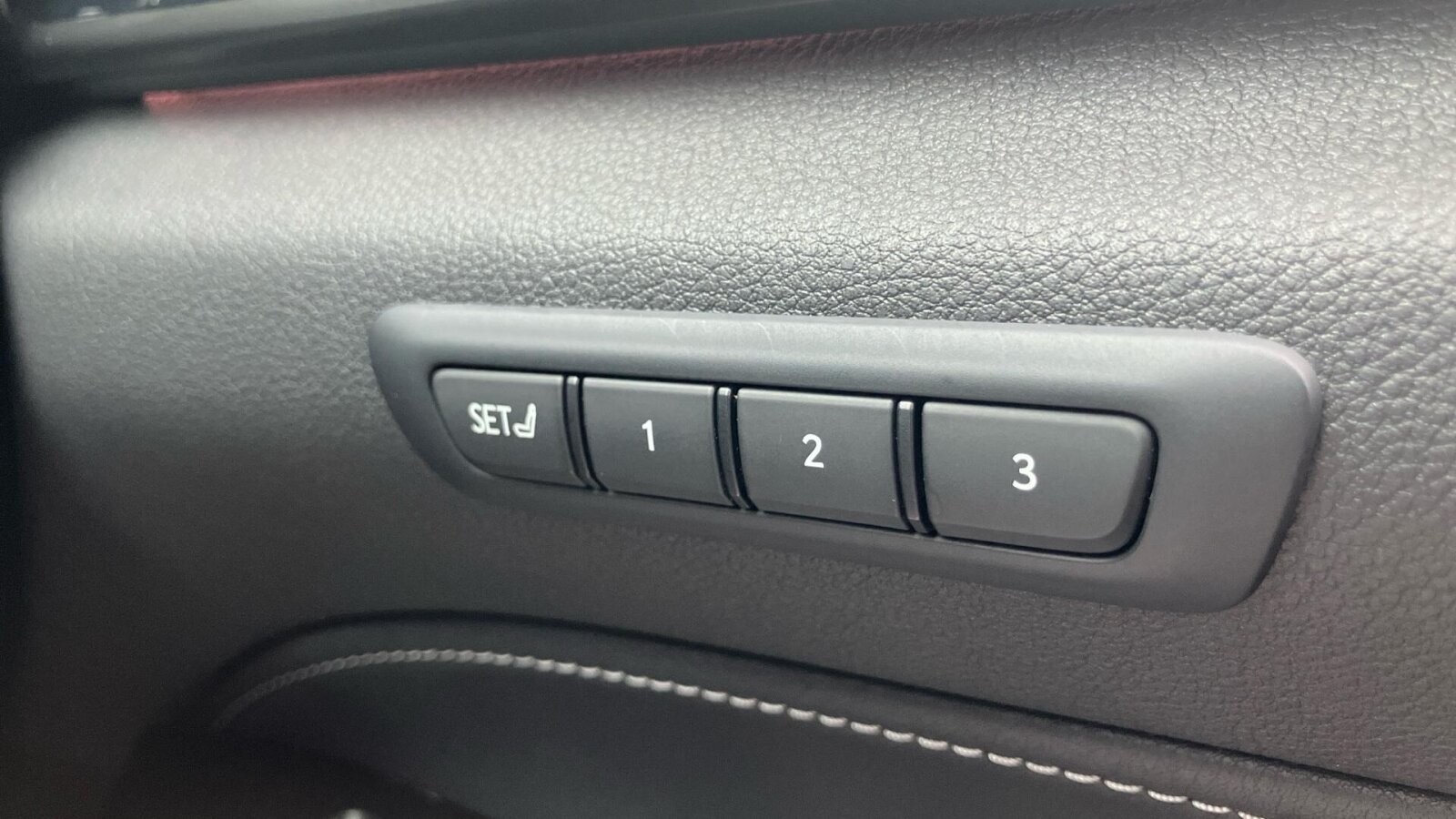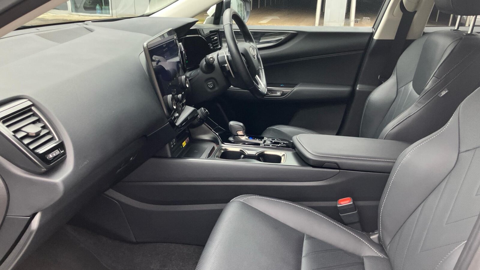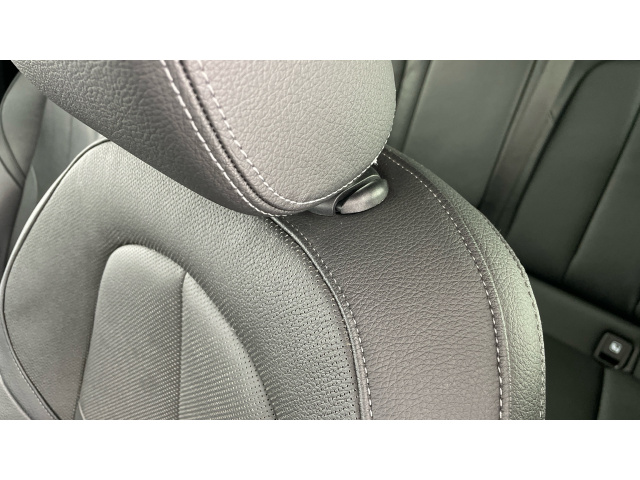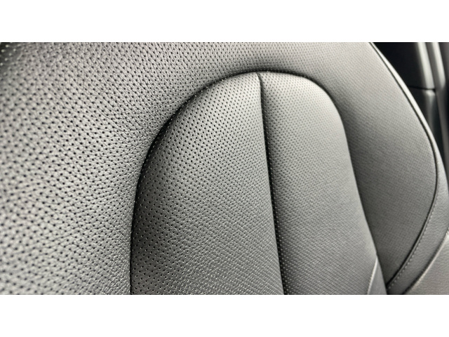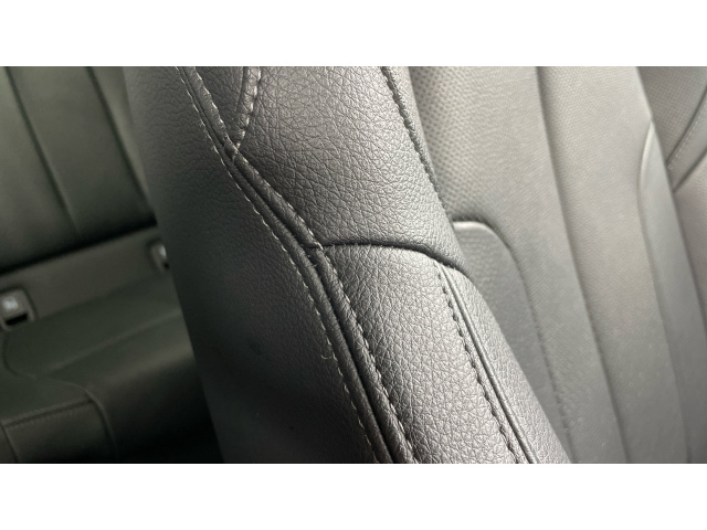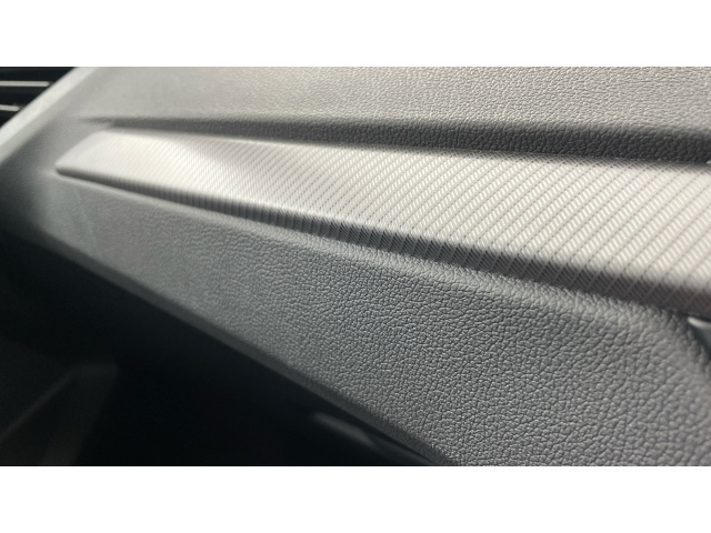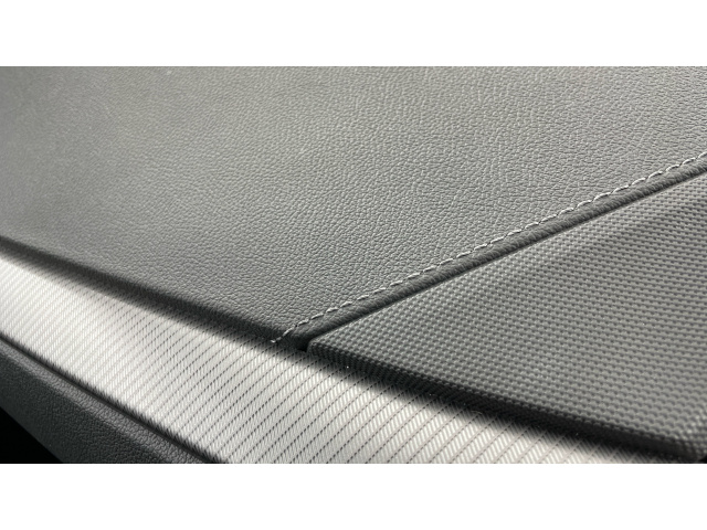 "Black artificial leather dashboard with grey stitching",