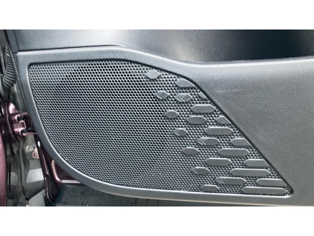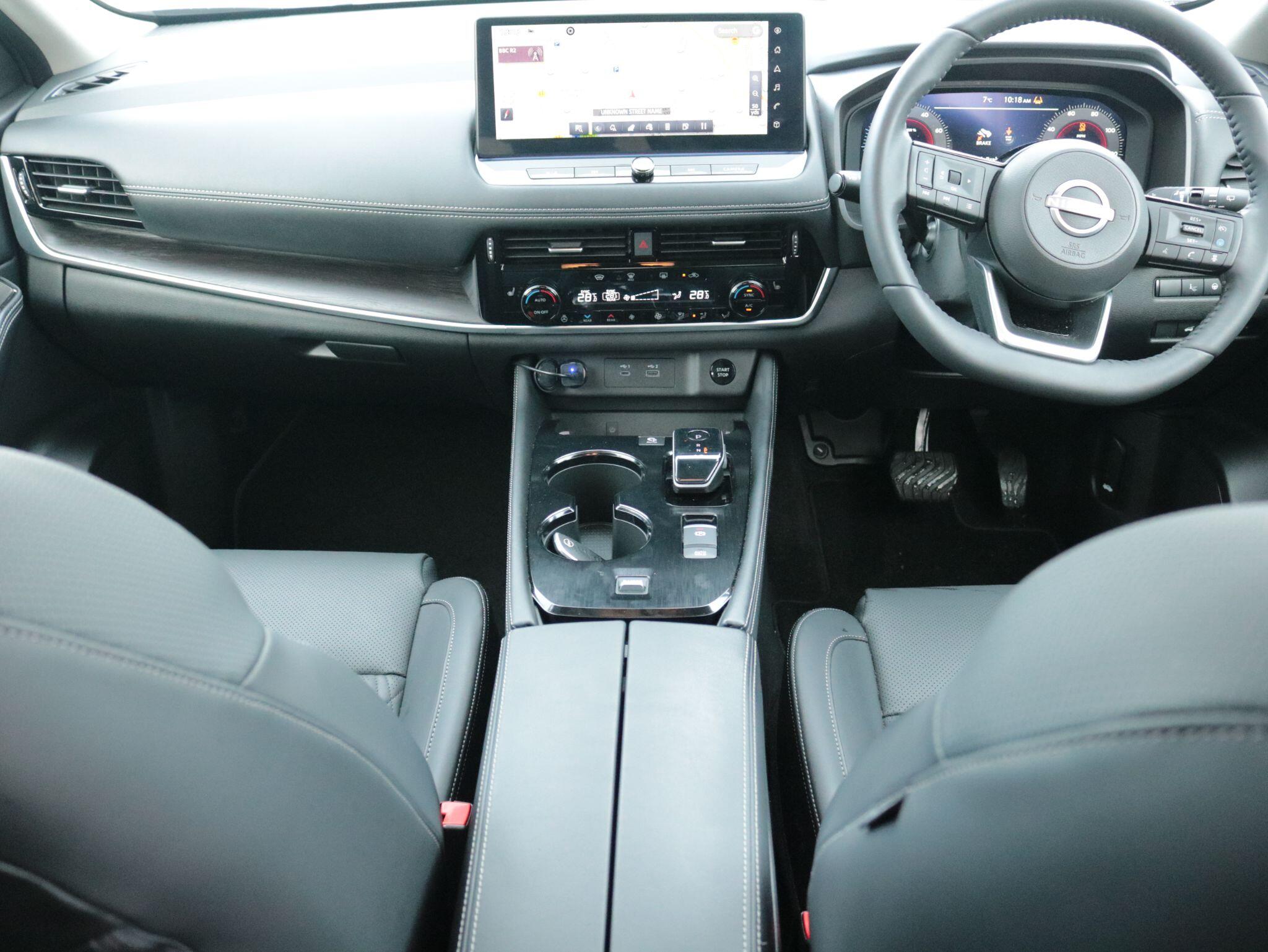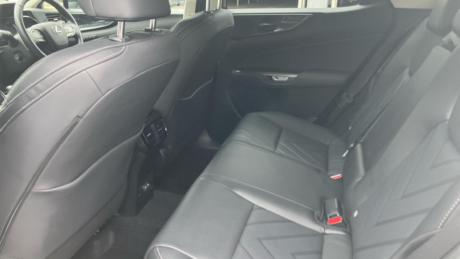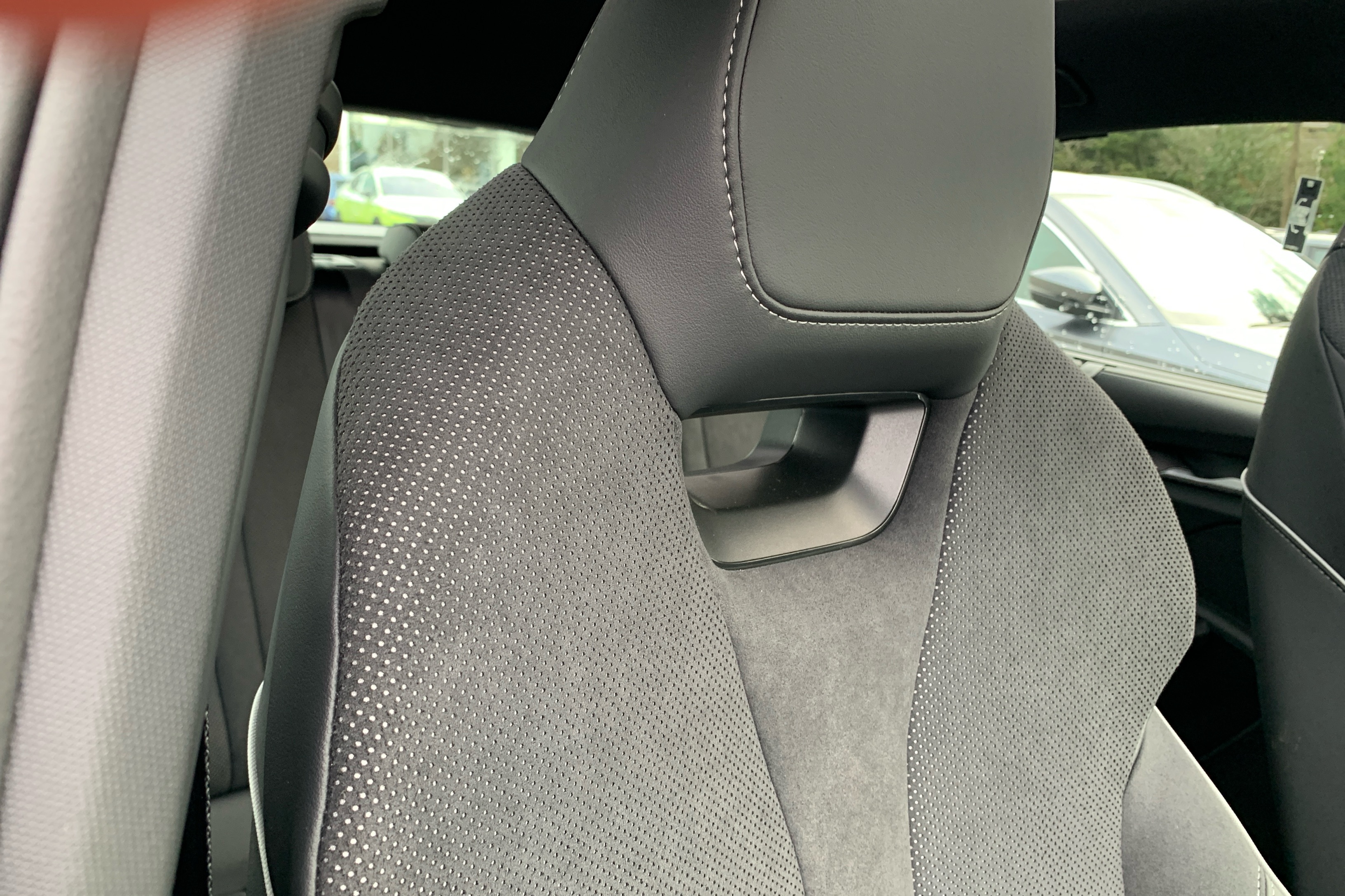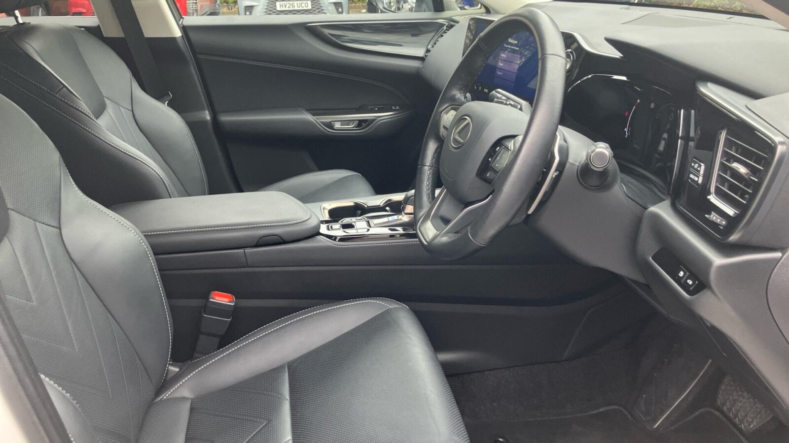 "Black artificial leather dashboard with grey stitching",