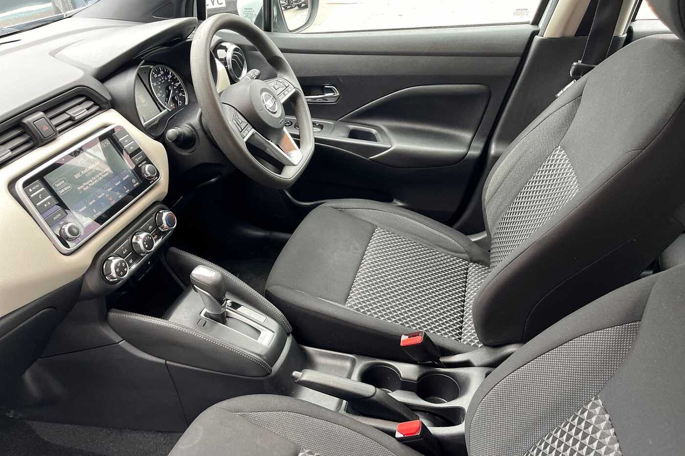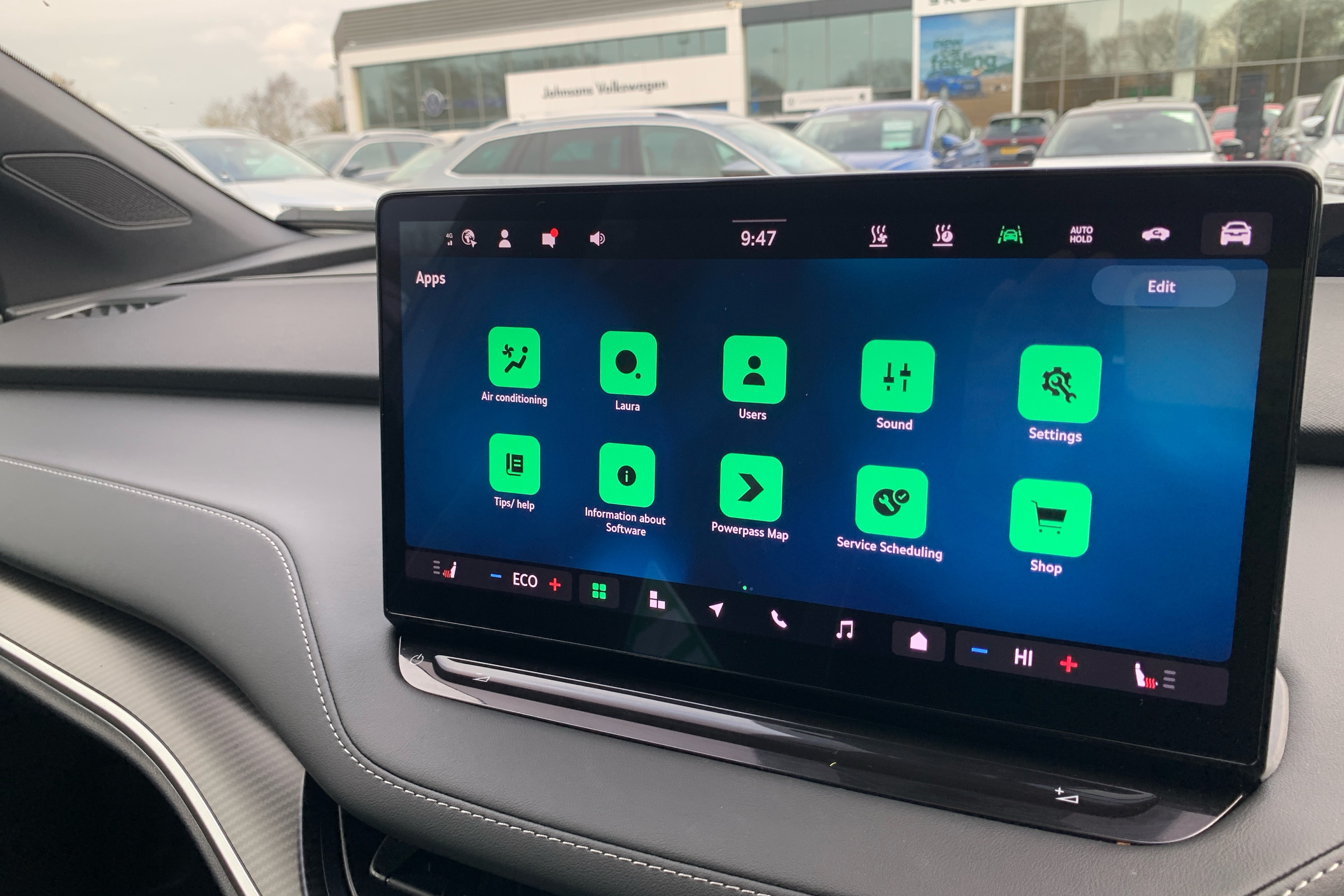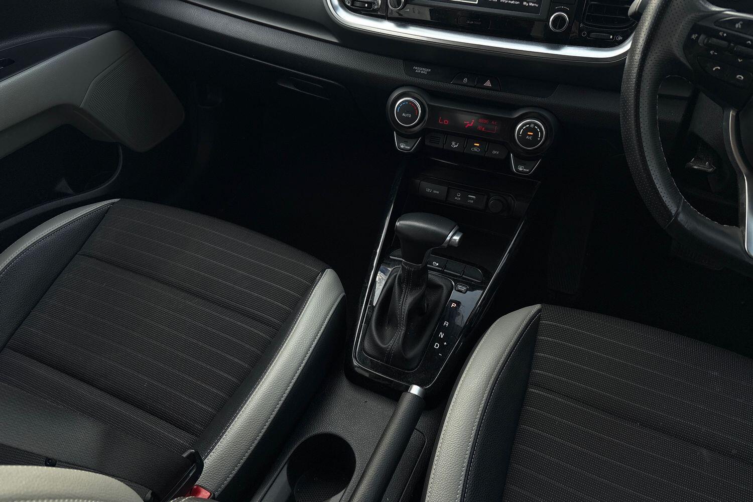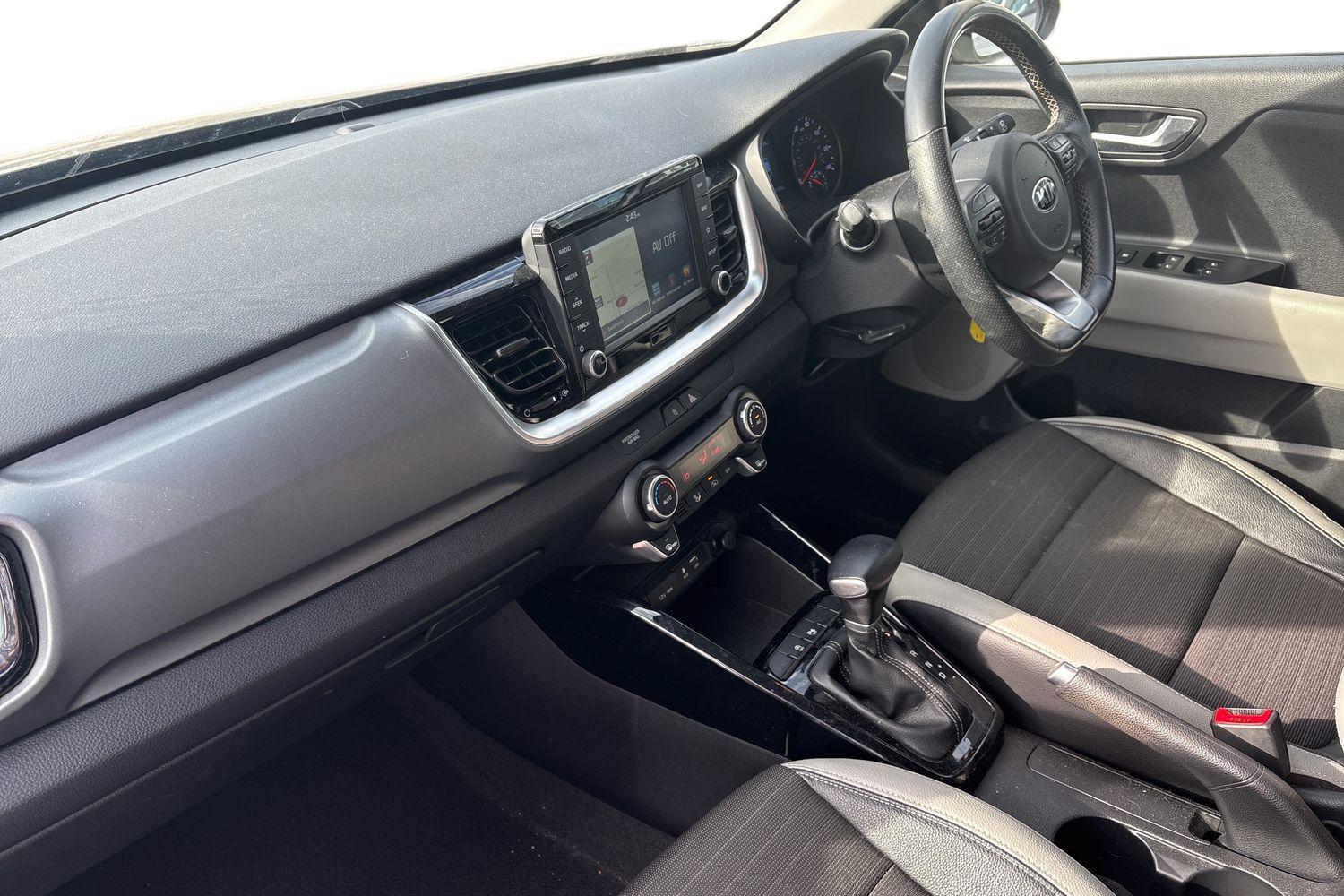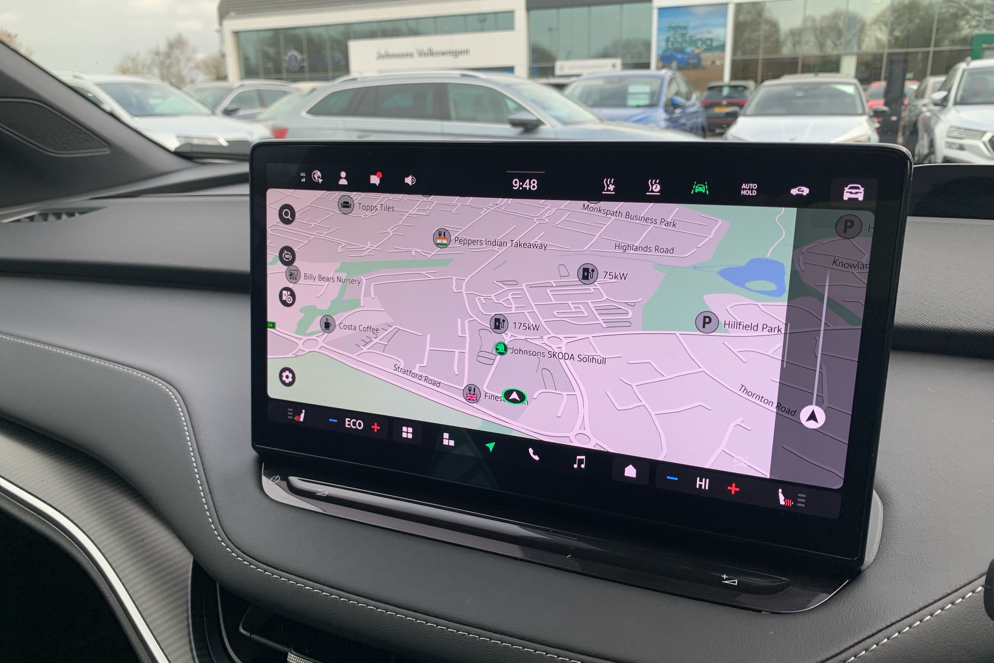 "Black artificial leather dashboard with grey stitching",