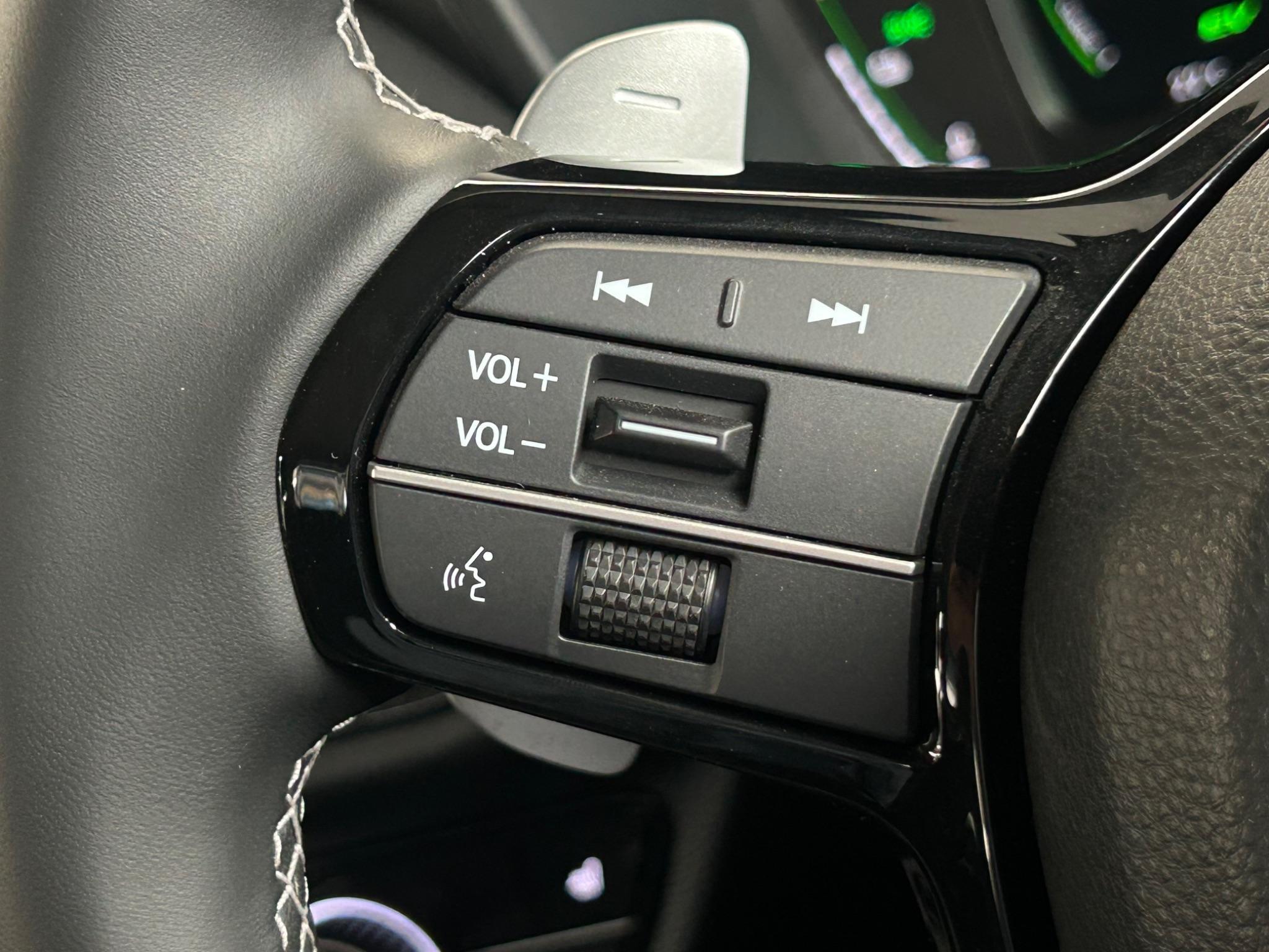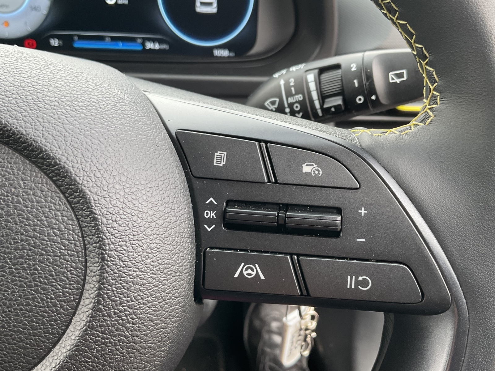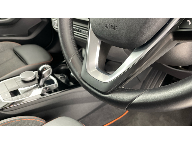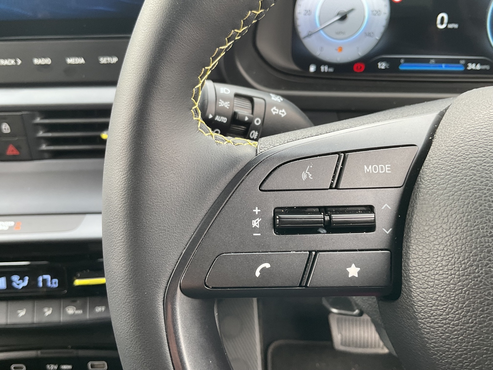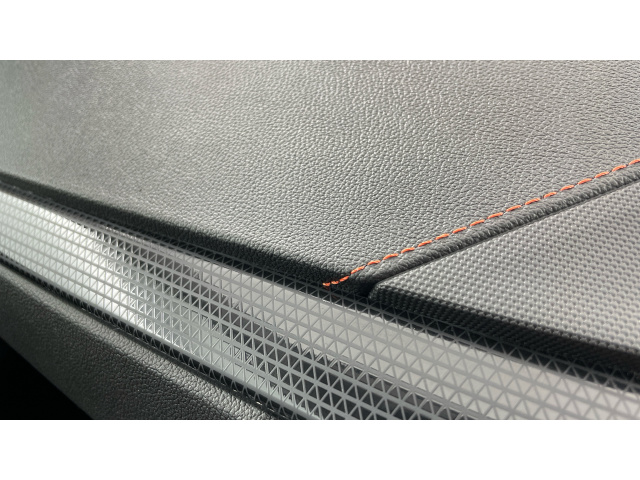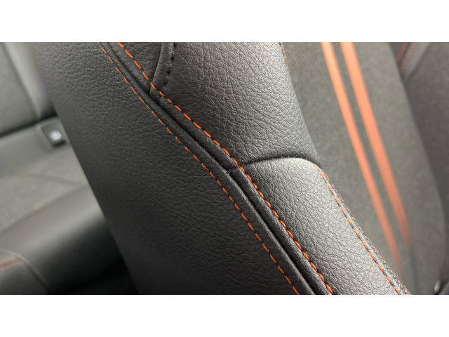 "3 spoke flat bottomed leather steering wheel with red stitching",