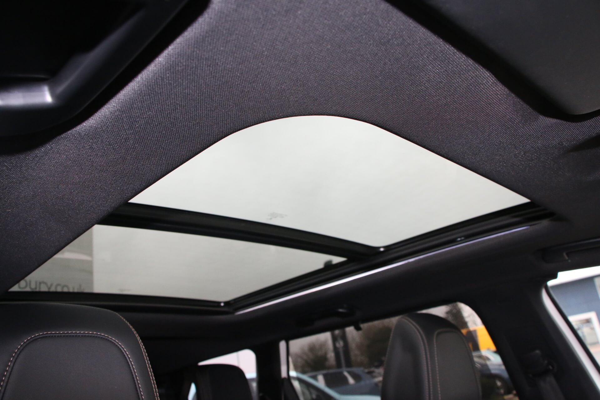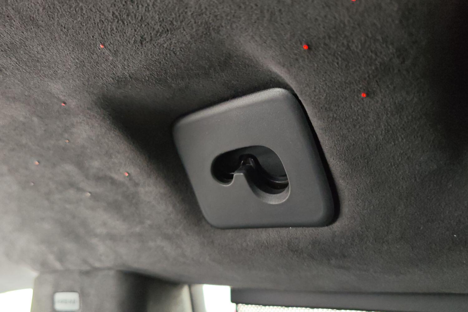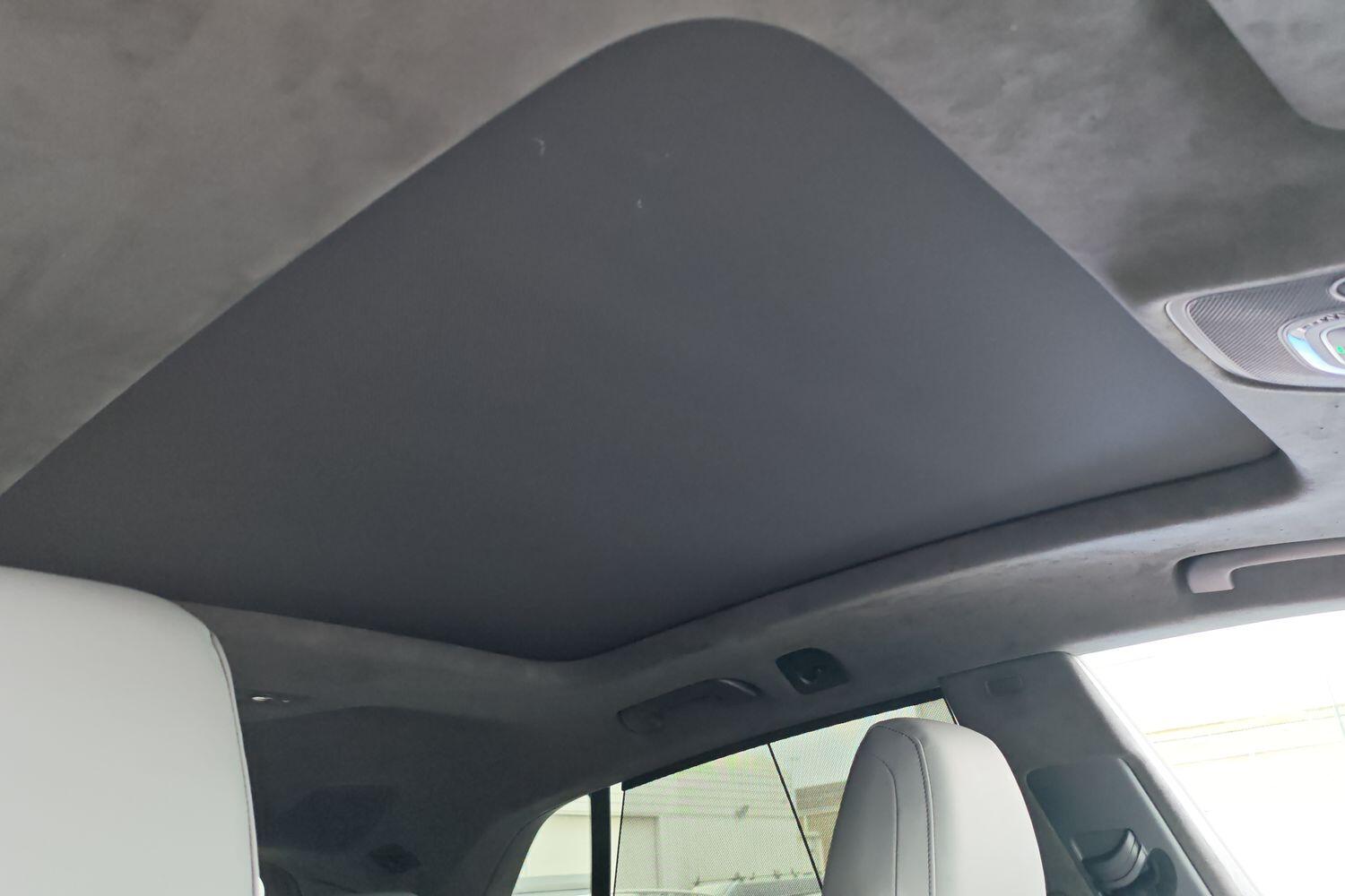 "Matted grey interior roof lining and a pillar",