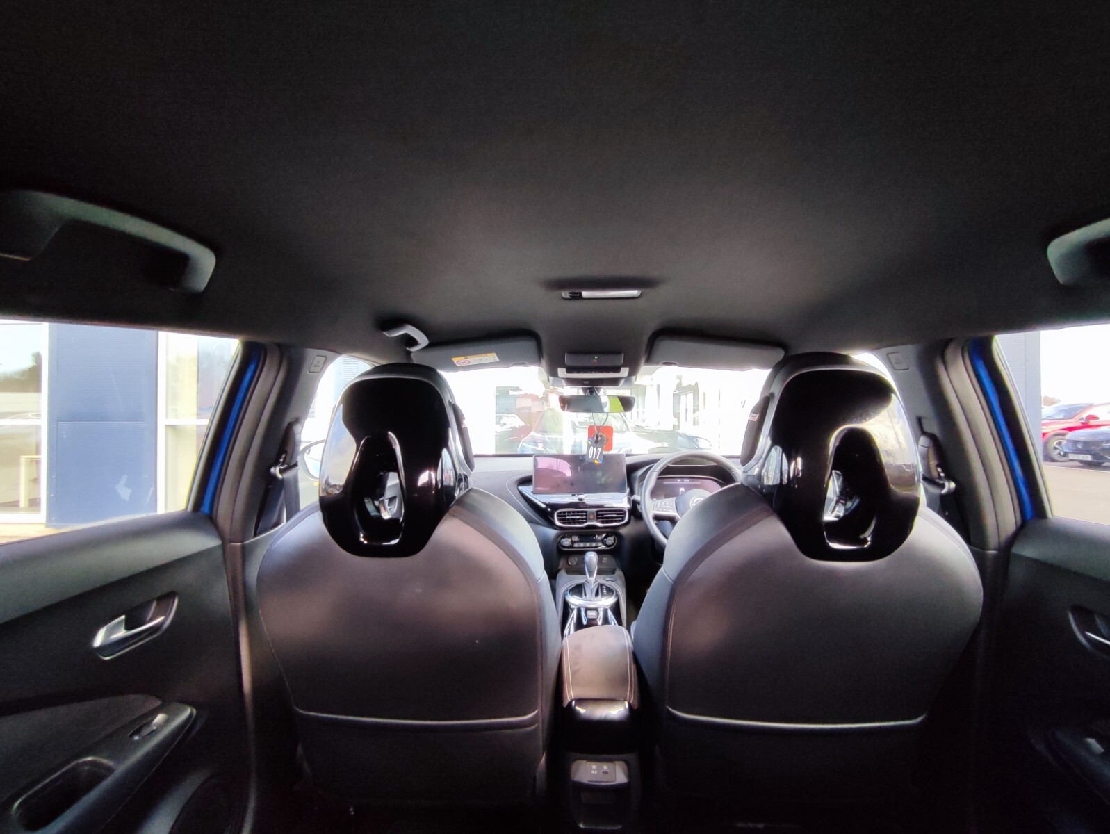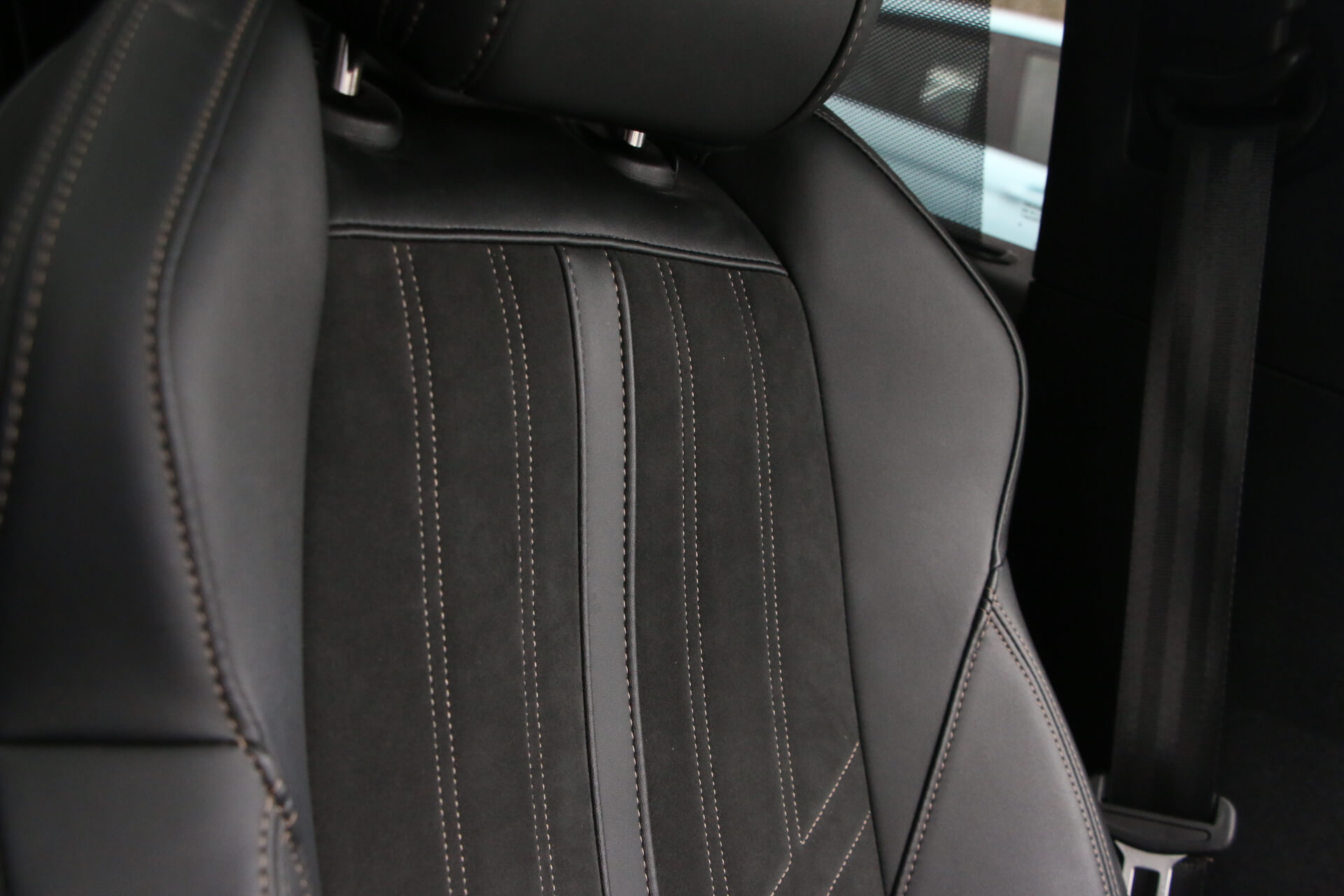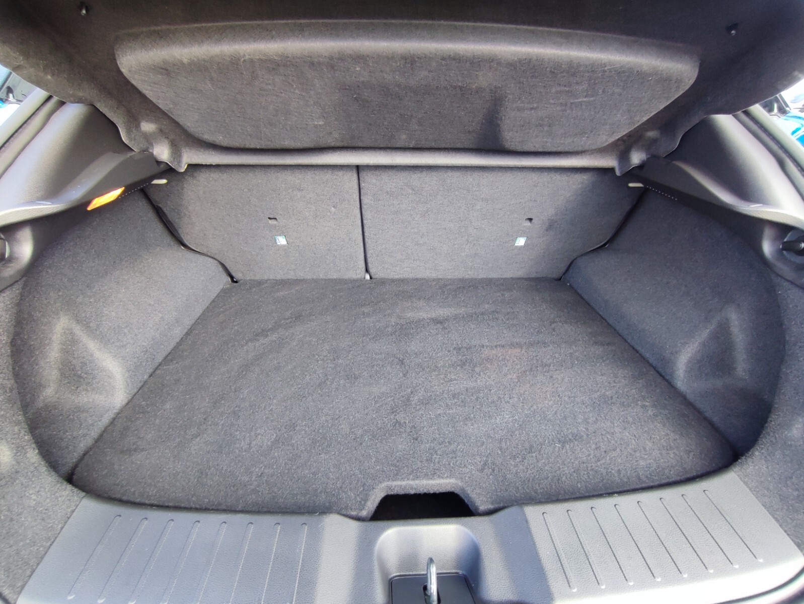 "Matted grey interior roof lining and a pillar",