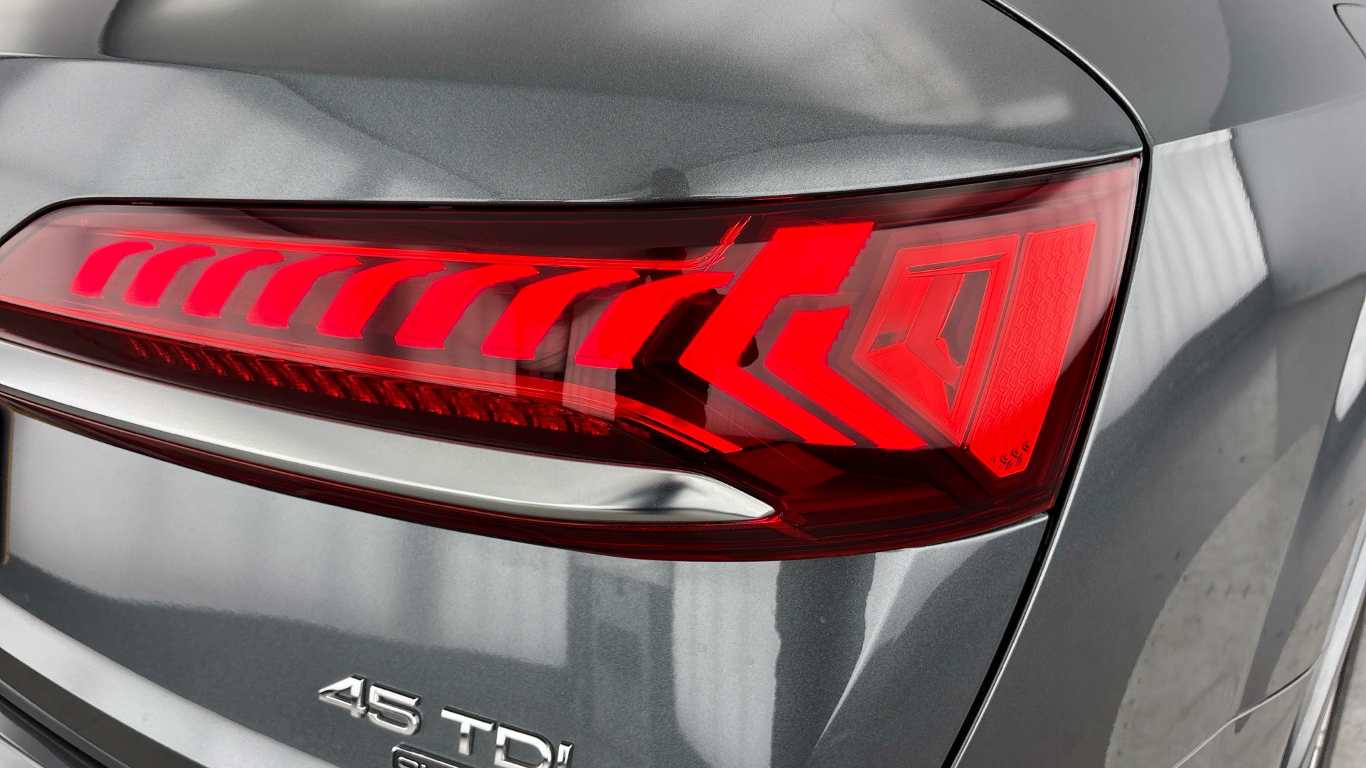 "Two part LED tailights in L-shape with components in smoked glass, brake light, LED turn indicator and rear fog light",