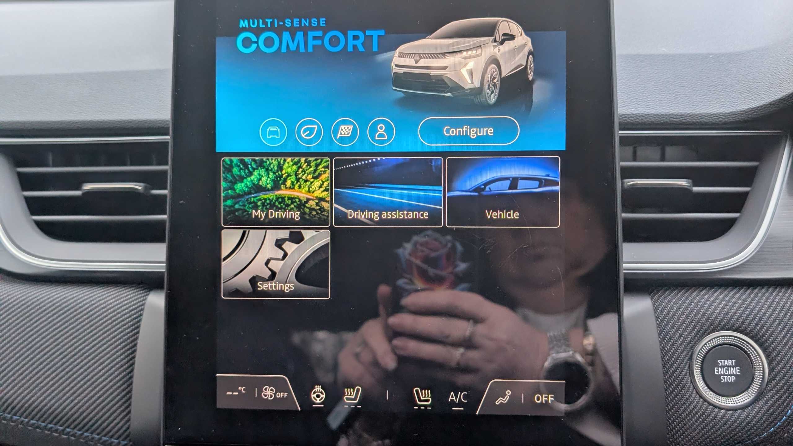 "features": "7\" TFT Driver information display, Blind spot warning, Bluetooth system, EASY LINK 9.3\" portrait touchscreen with navigation, Google search and traffic information, eCall emergency call system, Eco mode, EV button to activate pure mode, Front and rear parking sensors, Gear change indicator, Lane departure warning, Lane keep assist, Multi-sense - 3 driving modes and 8 ambient lighting, Rear cross traffic alert, Rear view camera, Renault automatic emergency assist, Smartphone integration compatible with Apple CarPlay and Android Auto, Traffic sign recognition with over speed prevention, Trip computer, Variable assistance electric power steering, Arkamys classic sound system with 6 speakers, DAB radio, USB port, 3rd brake light, Auto dimming rear view mirror, Automatic headlights, Automatic high / low beam, Automatic windscreen wipers with rain sensor, Black side door protection with chrome insert, Body coloured bumpers, C-shaped LED front signature lighting, Chrome decopart on wing (fender molding), Chrome window lower lining, Extra tinted rear windows and tailgate, Front and rear electric windows, Front driver window with one touch facility and anti-pinch function, Front grille with chrome on upper part, Full LED headlights, Grey front and rear skid plates, Heated rear window, Rain sensor, Rear windscreen wiper, Shiny black shark fin antenna, Side mirrors adjustable electrically, electrically foldable, with defrosting and temperature sensor, automatically foldable at vehicle closure, 3 seat bench in 2nd row, 60:40 split and fixed base rear seats, Automatic climate control with combined filter, humidity sensor and AQS, Central console with storage, Front and rear head restraints, Height and reach adjustable steering wheel, ISOFIX child seat fixing points on rear outermost seats, Leather steering wheel, LED front and rear roof lights, Rear air vents, Single front passenger seat, 3x3 point rear seat belts, ABS+EBA, Active emergency braking system, B Brake Mode - One pedal driving with increased regenerative braking, Distance warning alert, Driver airbag, Driver and passenger front and side airbag deactivation, Driver and passenger side airbags, Driver height adjustable seat belt, Electronic parking brake with auto hold, ESC (Electronic Stability Control), Front and rear no seatbelt warning sound, Front curtain airbags, Front head airbags, Hill start assist, Passenger airbag, Tyre pressure warning light, Anti drill door locks and locking fuel cap, Central door locking, Deadlocking system, Hands free keycard with Keyless access and start, RAID (Renault Anti-Intruder Device) automatic door locking, Rear side wing door and window child locking function (front driver door control panel), Superlocking, Thatcham alarm, 18\" Pasadena diamond cut alloy wheels with grey inserts, ",