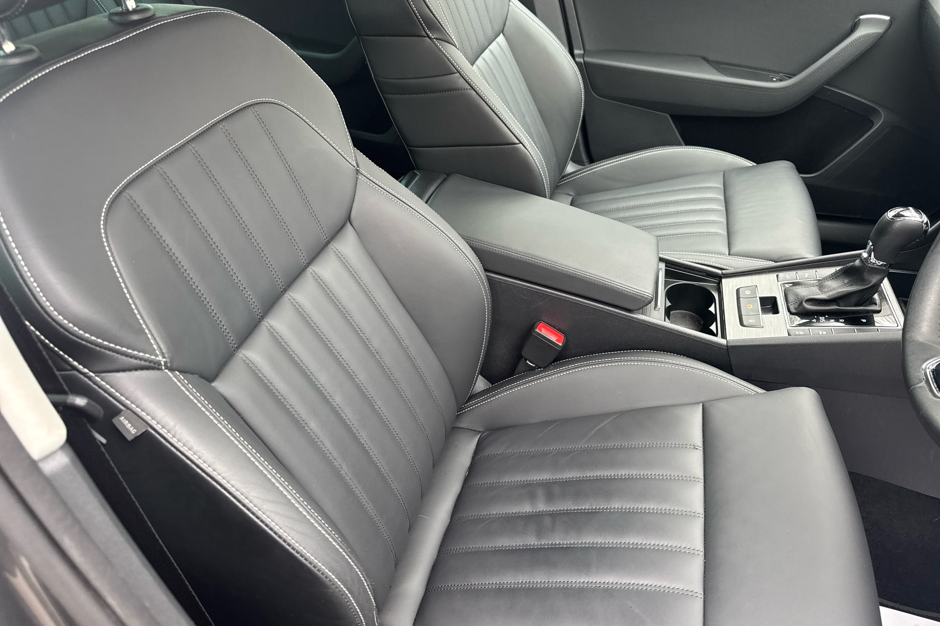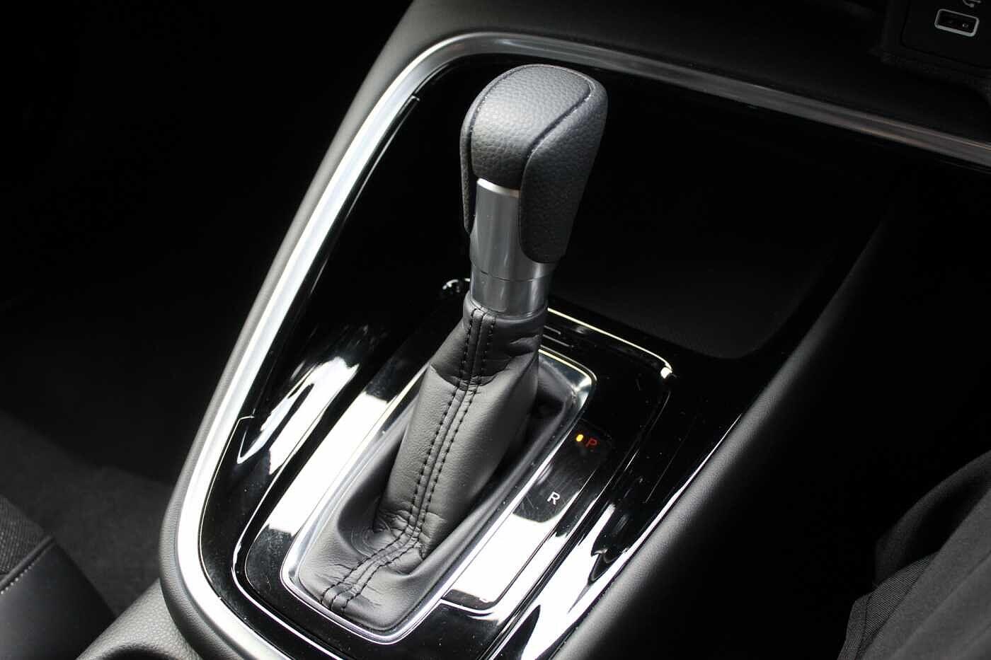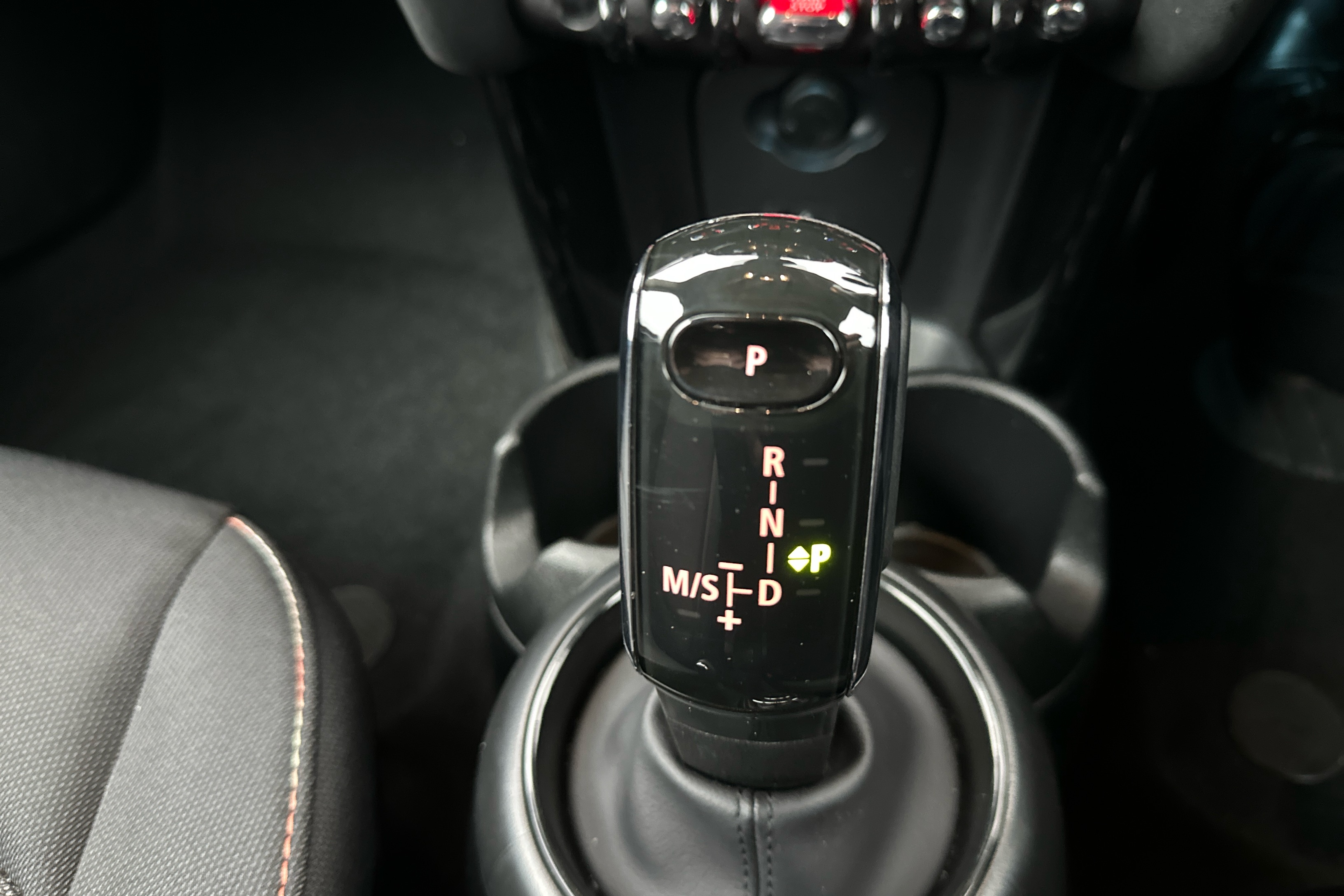 "Leather steering wheel with red stitching and gear knob",