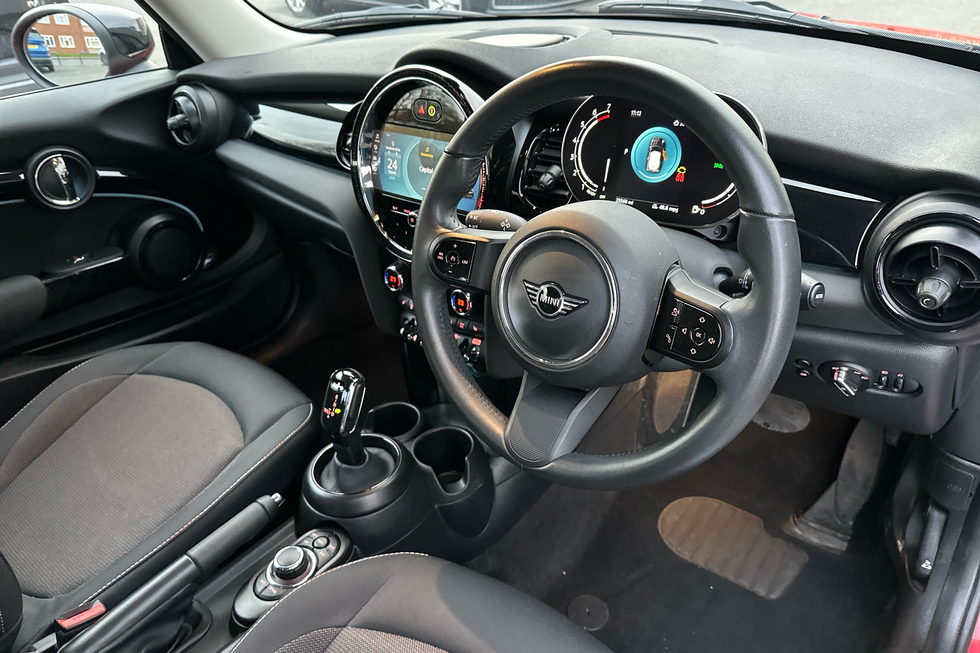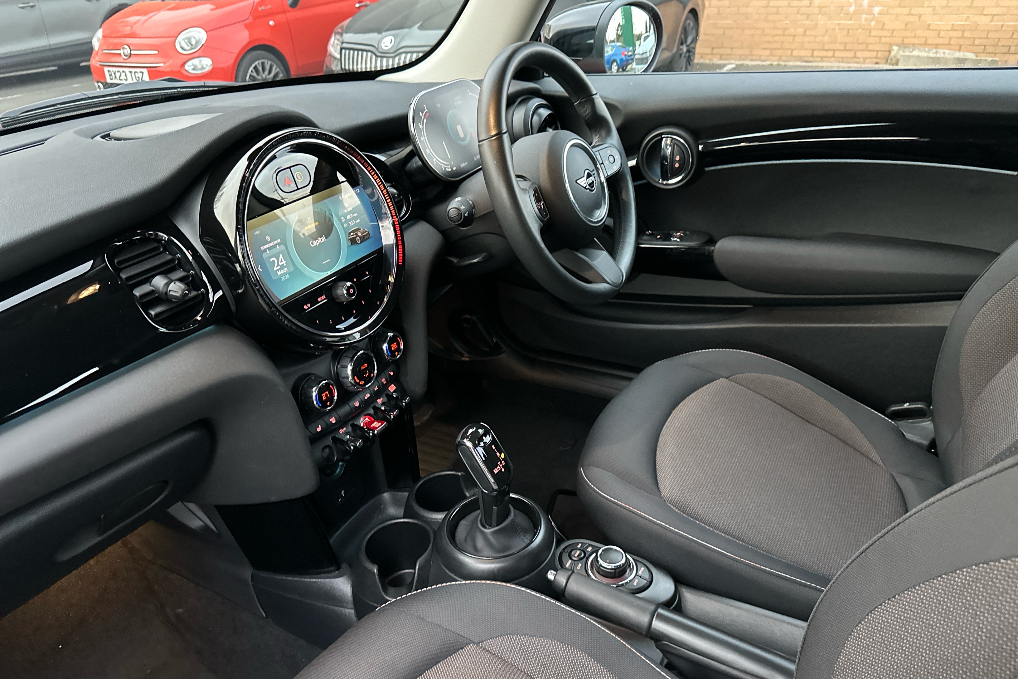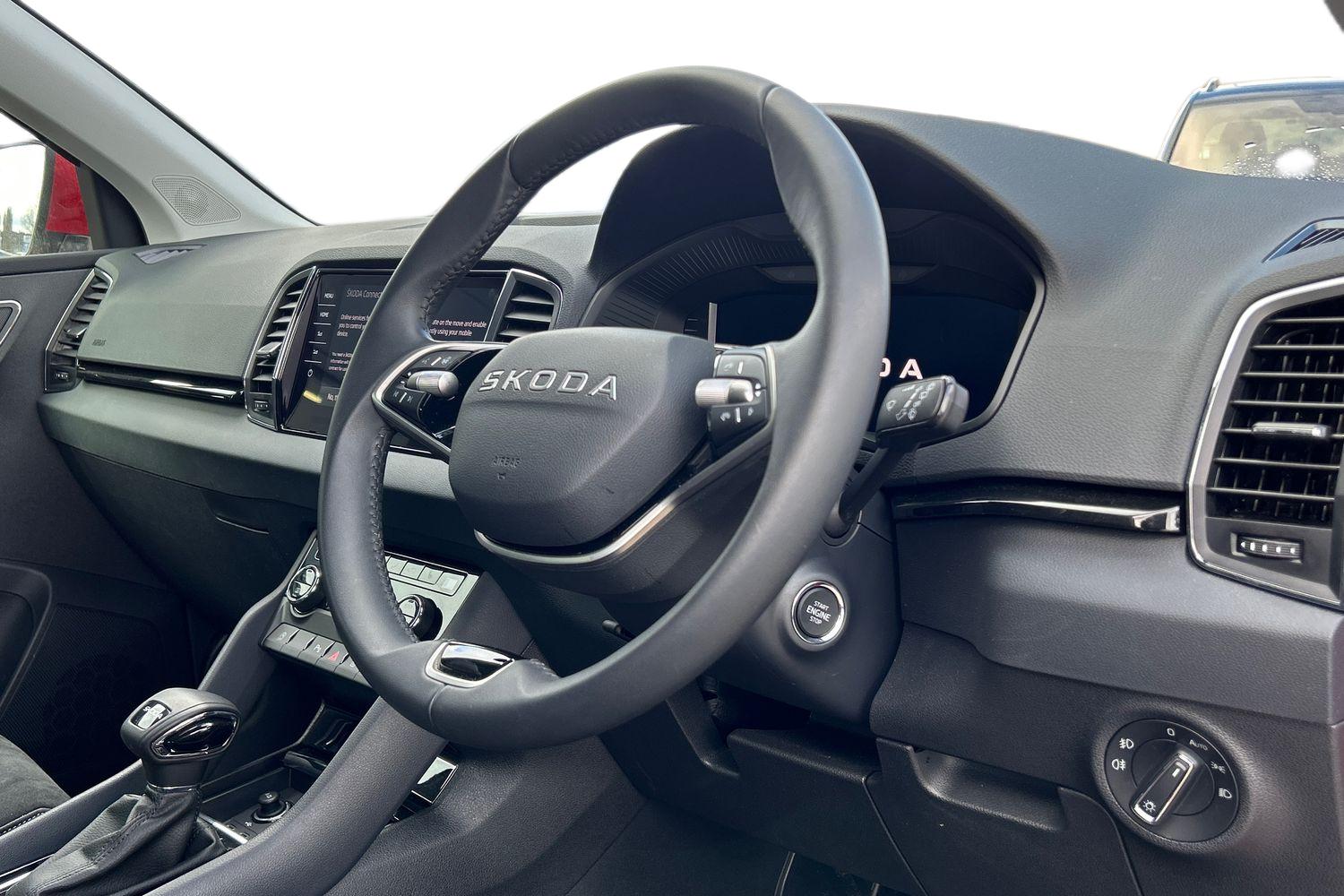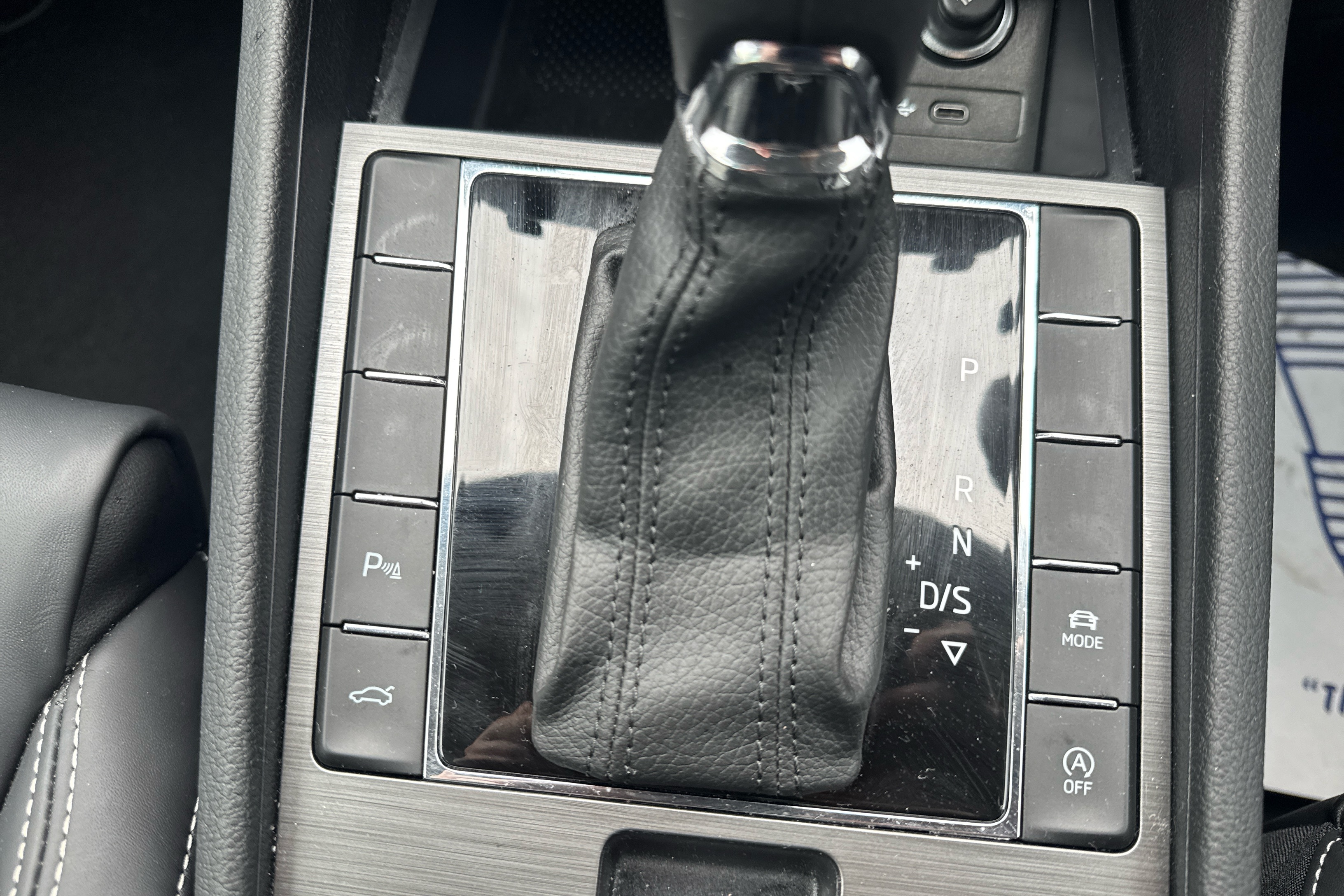"Leather steering wheel with red stitching and gear knob",