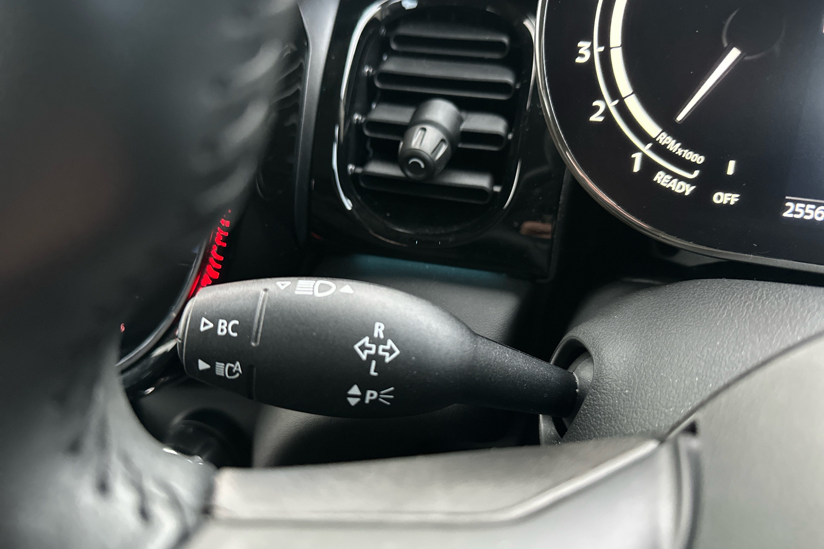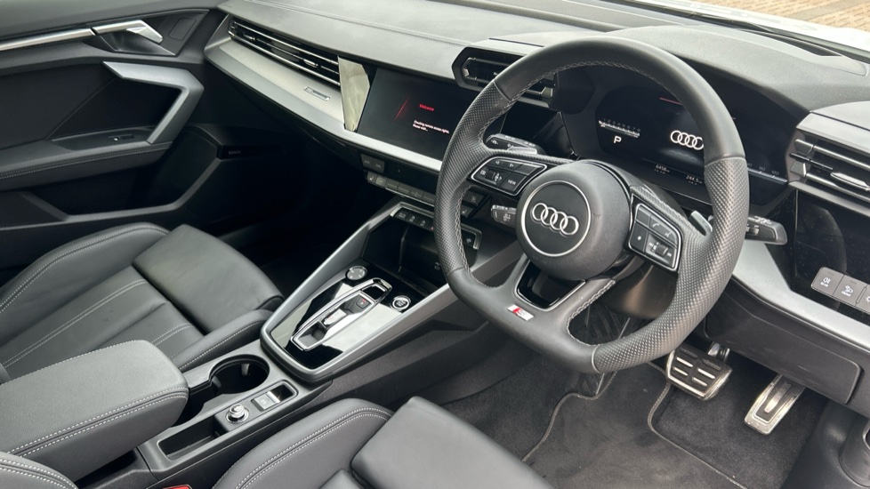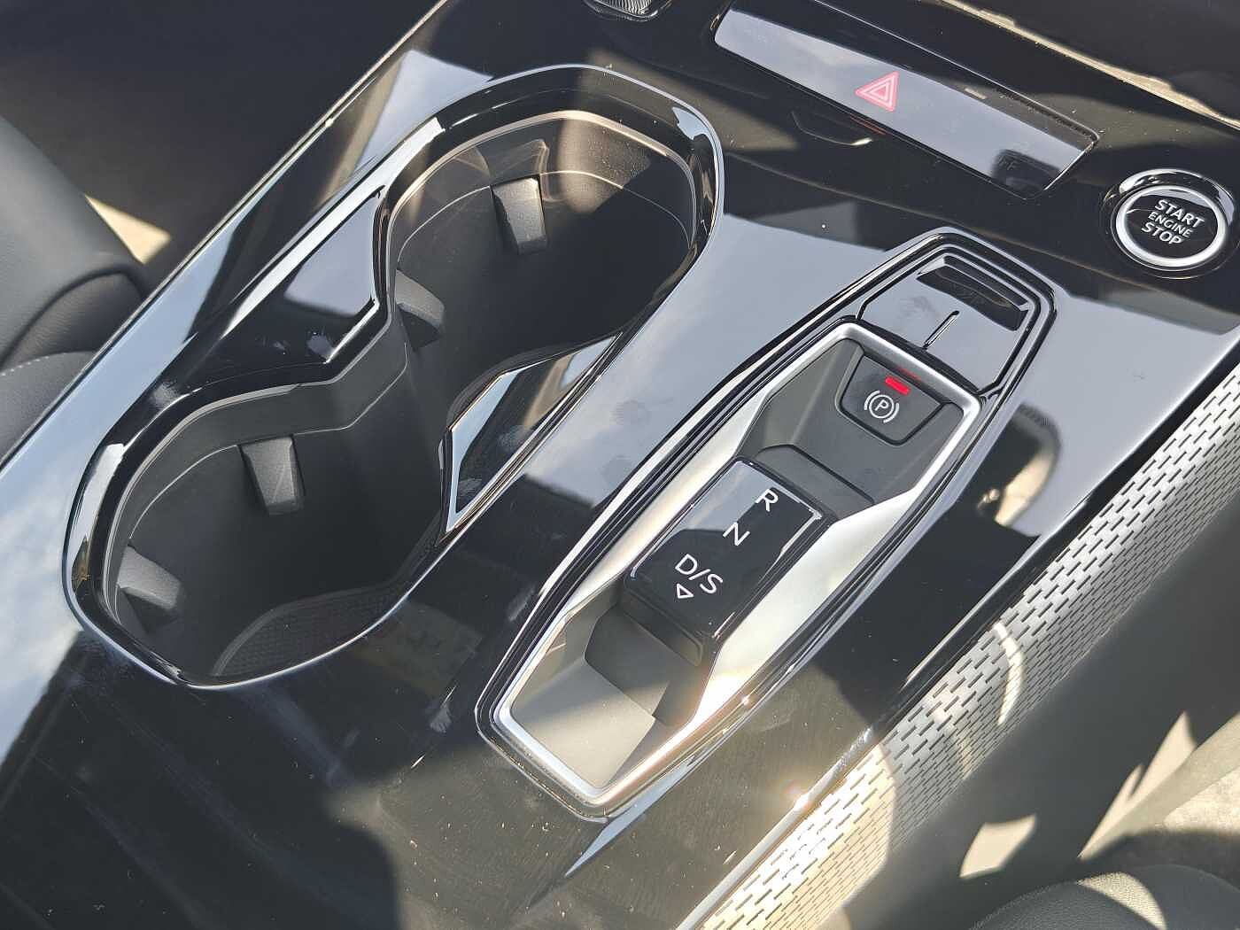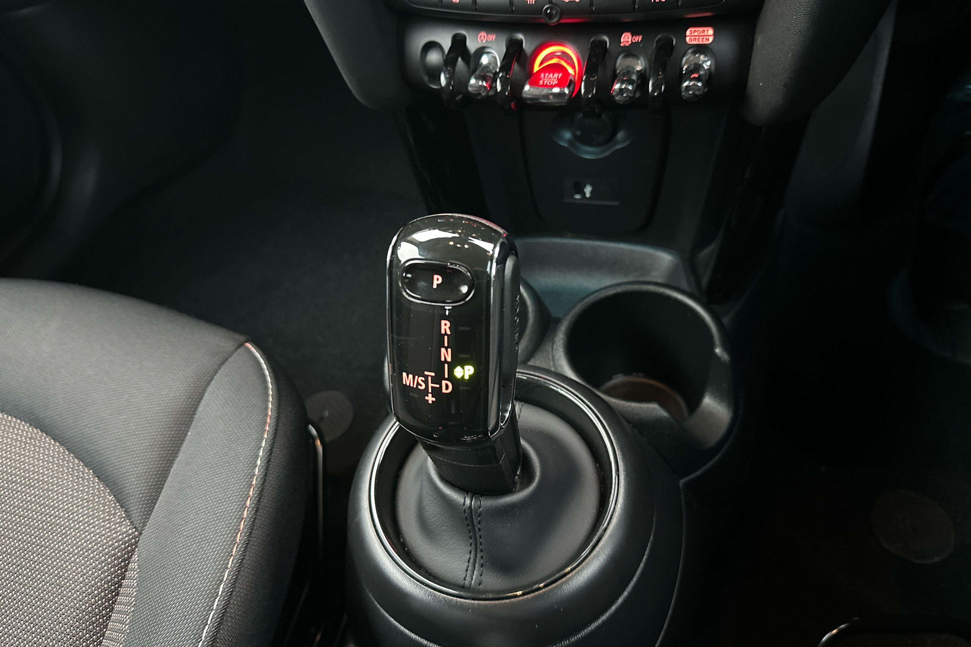 "Leather steering wheel with red stitching and gear knob",