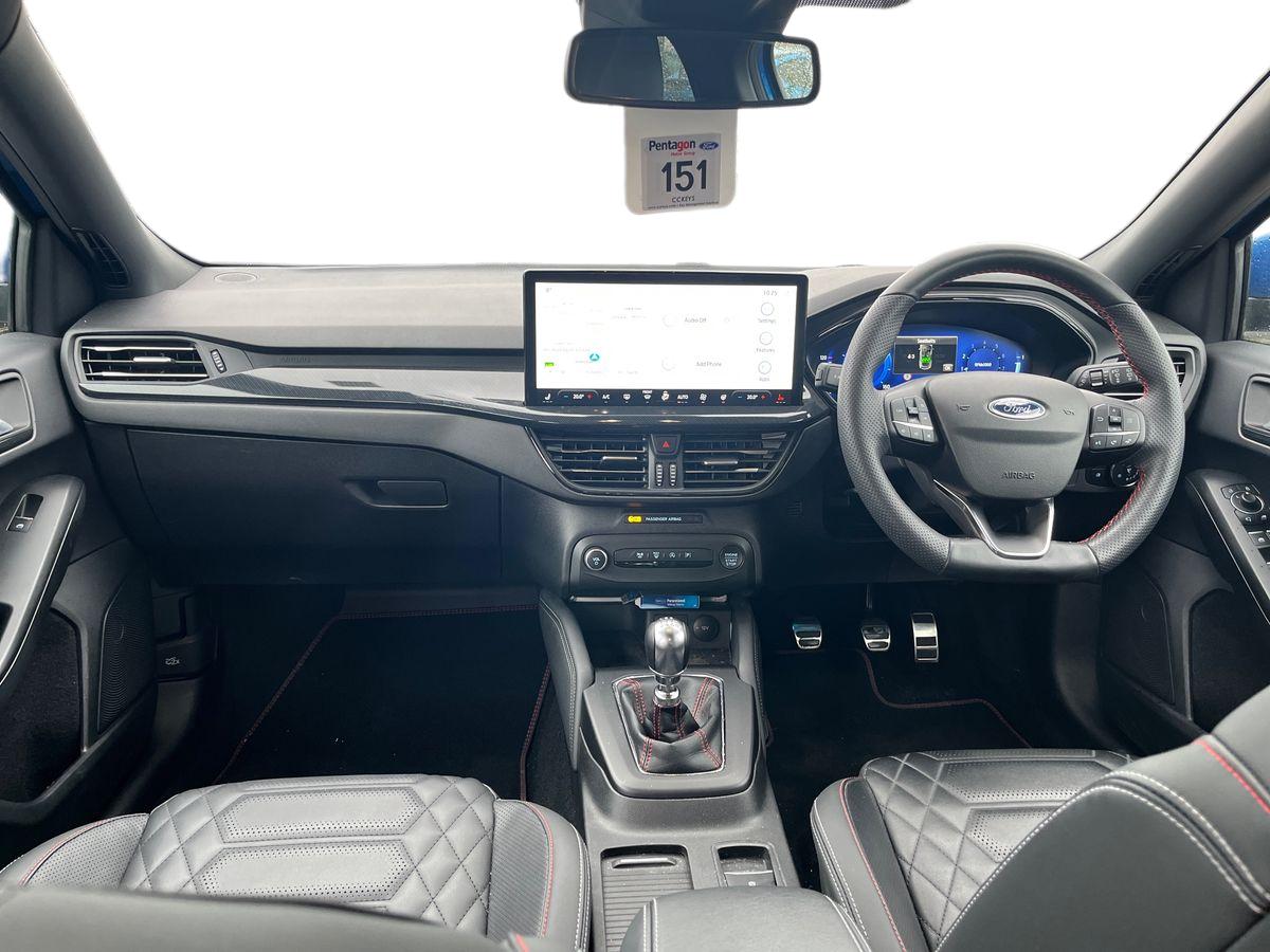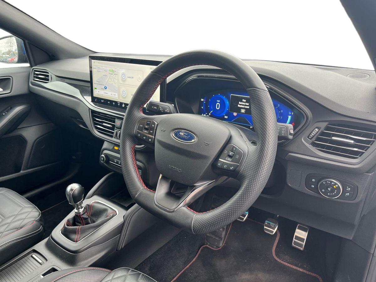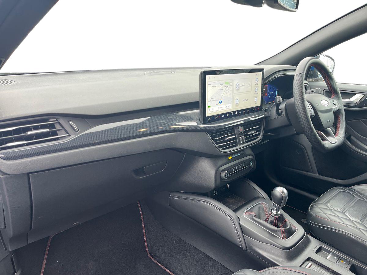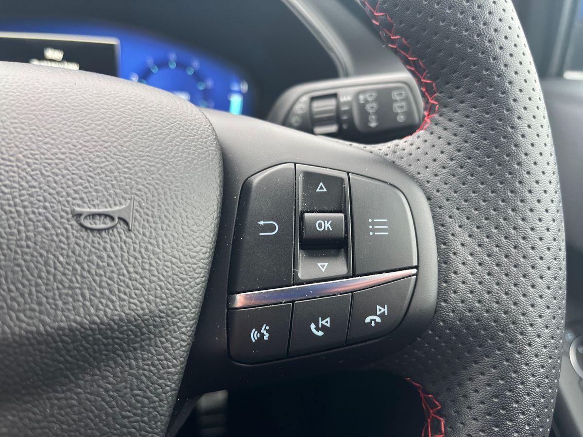 "features": "12.3\" Digital instrument cluster, Bluetooth system, Digital clock, Easy fuel capless refuelling system, Eco mode, Ford SYNC4 Nav with 13.2'' touchscreen, DAB, Emergency Assistance, Apple Carplay & Android Auto, B&O Premium Audio with 10 speakers, FordPass Connect, Lane keeping system - lane keeping alert and lane keeping aid, PAS, Rev counter, Selectable drive mode, Service interval indicator, Trip computer, Wireless charging pad, Sports tuned suspension, 2 USB ports, Auto headlamps (on/off), Body coloured door handles, Electrically operated front and rear windows with one touch opening and closing, Electrically operated heated power fold door mirrors with puddle lamp with side indicators, Front variable intermittent wipers with electric wash, Heated rear window, LED daytime running lamp, LED rear lamps, LED third brake light, Polished twin tailpipe, Privacy glass, Quickclear heated windscreen, Rain sensor, Rear side wing doors, Tailgate wash/wipe, Unique ST-Line grille, full bodystyling kit, and large body coloured rear spoiler, 3 rear headrests, 3 seat bench in 2nd row, Dual zone electronic air temperature control, Full sensico premium upholstery, Height adjustable front headrests, Isofix child seat preparation, Load through ski hatch, Manual 4-way passenger seat adjusts, Power 4-way driver seat adjust, with power lumbar adjust, Reach + rake adjustable steering column, Single front passenger seat, Winter pack - Focus, 3x3 point rear seatbelts, ABS+Electronic Brake force Distribution, Auto hold function, Driver airbag, EDL traction control, Electronic parking brake, Electronic stability control, Front and rear seatbelt reminder, Front inertia reel height adjustable seatbelts with pre-tensioners, Front passenger airbag, Front side airbags, Passenger airbag deactivate switch, Post collision braking, Pre collision assist with autonomous emergency braking and pedestrian/cyclist detection, Red brake calipers, Remote/power child rear door locks, Side curtain airbags, Three rear inertia reel lap/diagonal seatbelts, Tyre pressure monitoring system, Keyless entry and keyless start, MyKey system, Remote central locking & engine immobiliser, Thatcham alarm with power door dead locks, 18\" 5x3 spoke pearl grey high gloss machined finish alloy wheels with mini spare wheel, ",