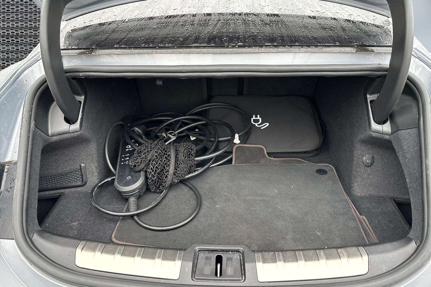 "Storage compartment for charging cable under boot floor",